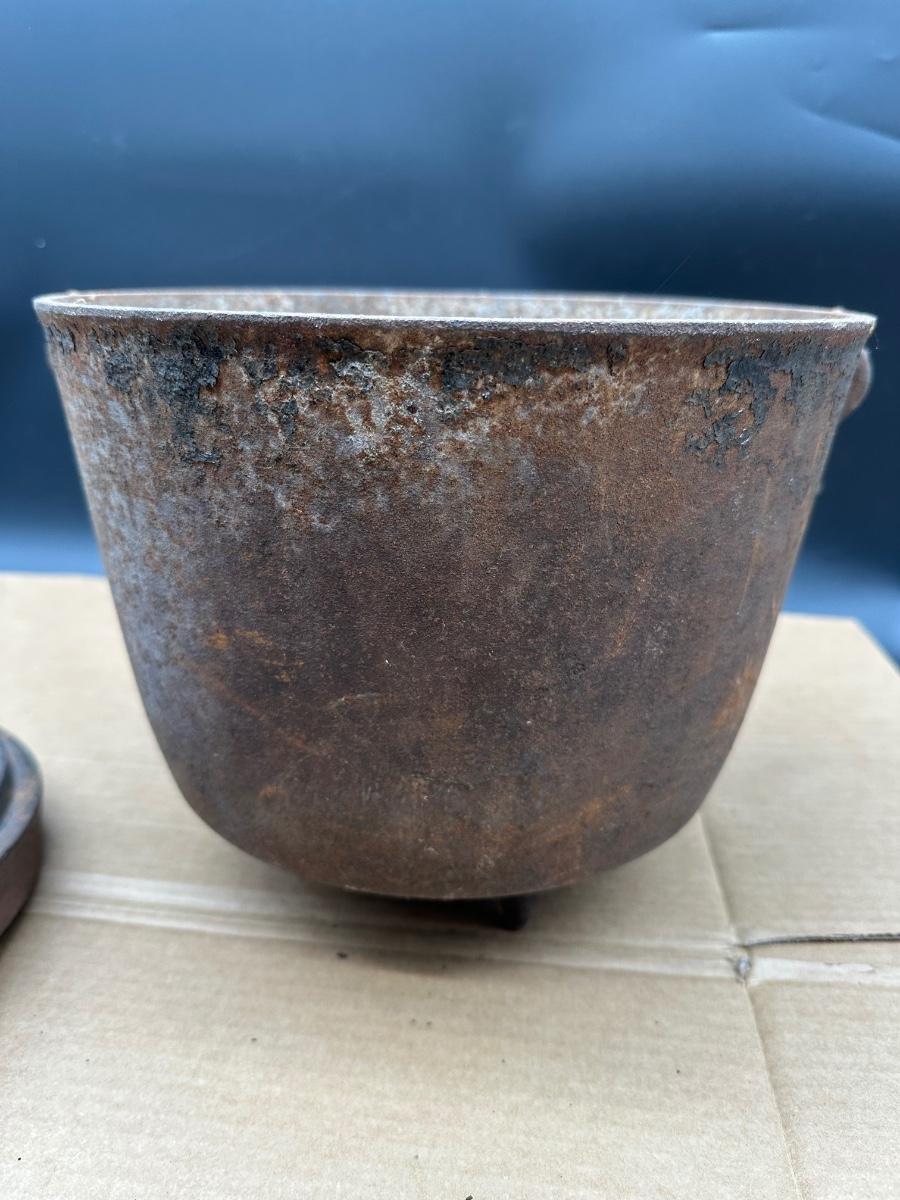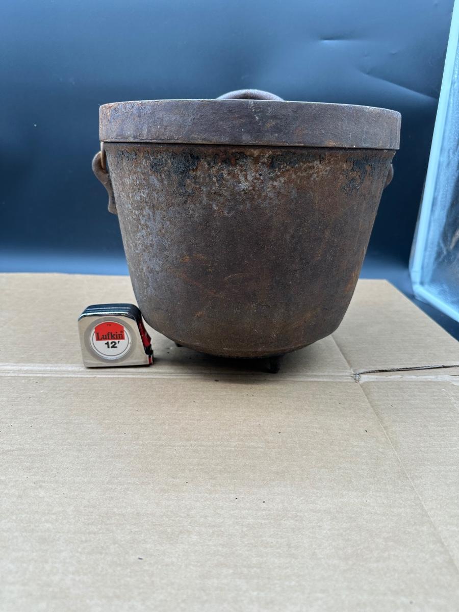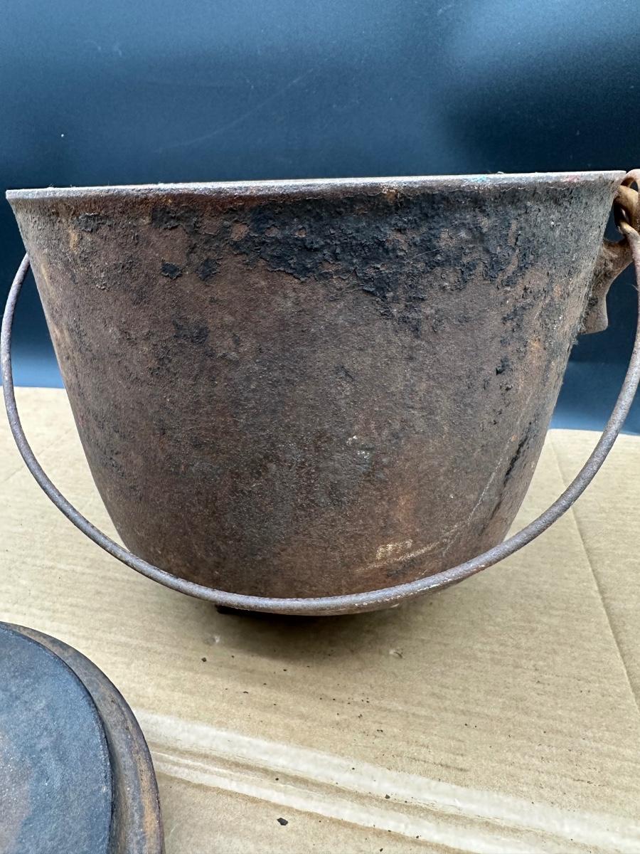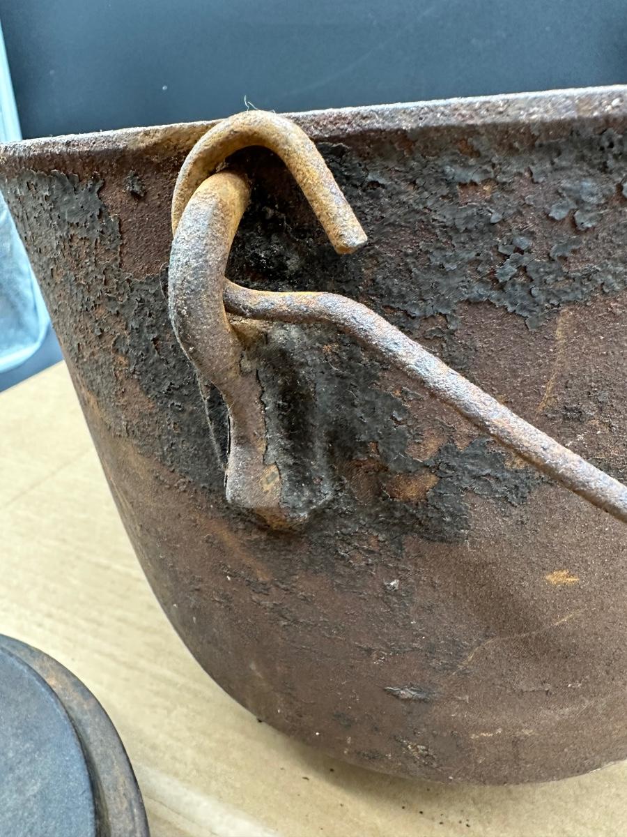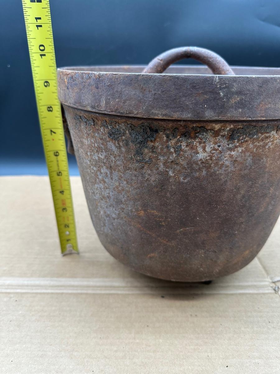 This example shows honest age and surface oxidation consistent with 19th–early 20th century cast iron. No cracks observed. Lid fits correctly. Interior and exterior show rust and patina from long-term storage and will need cleaning/seasoning if intended for use. Excellent candidate for restoration, display, or rustic décor.