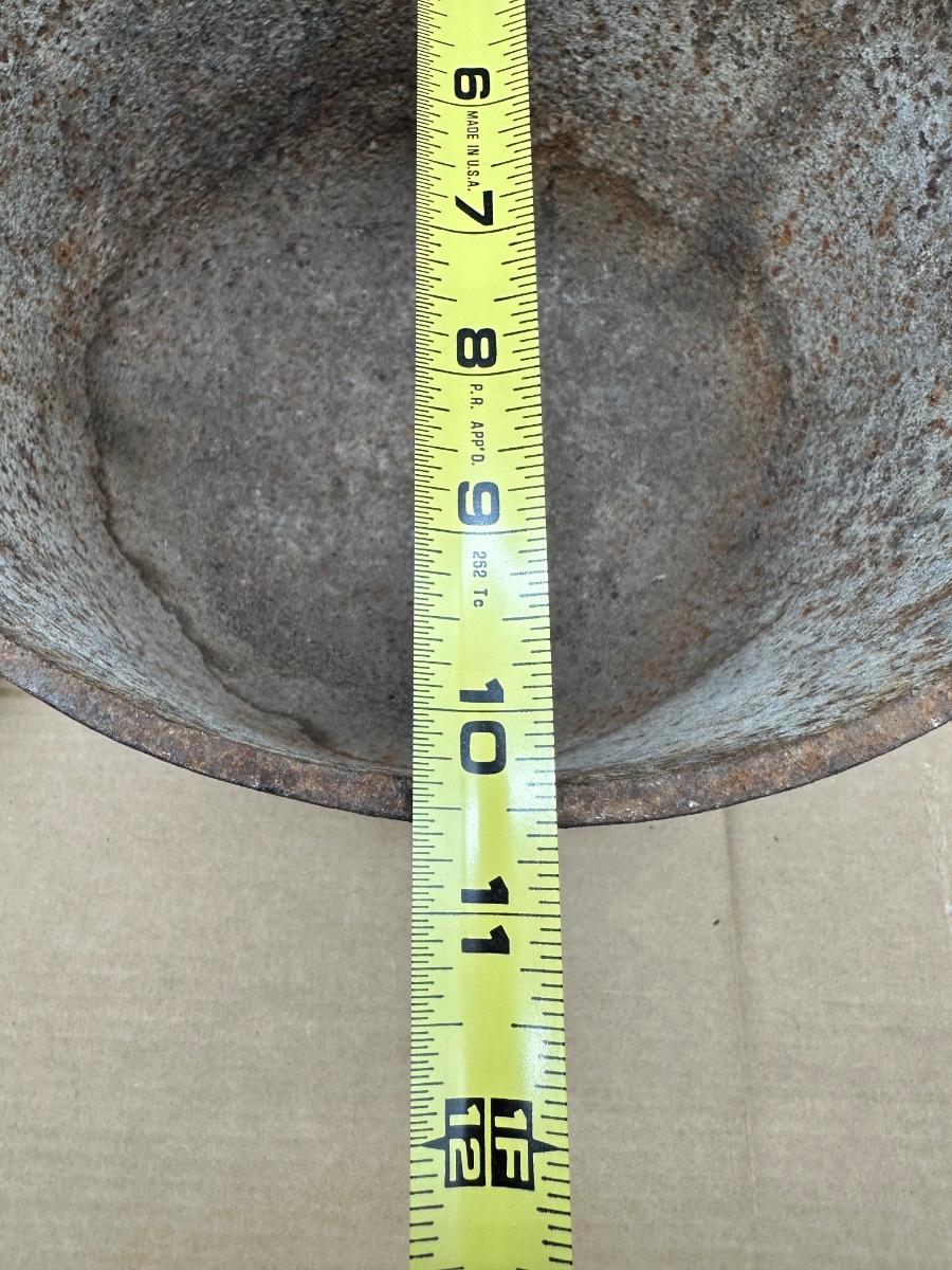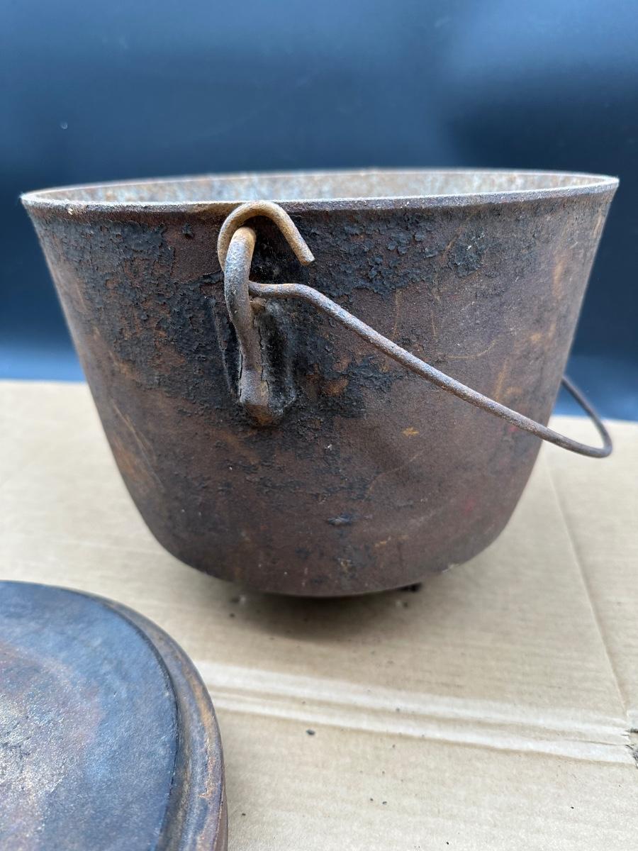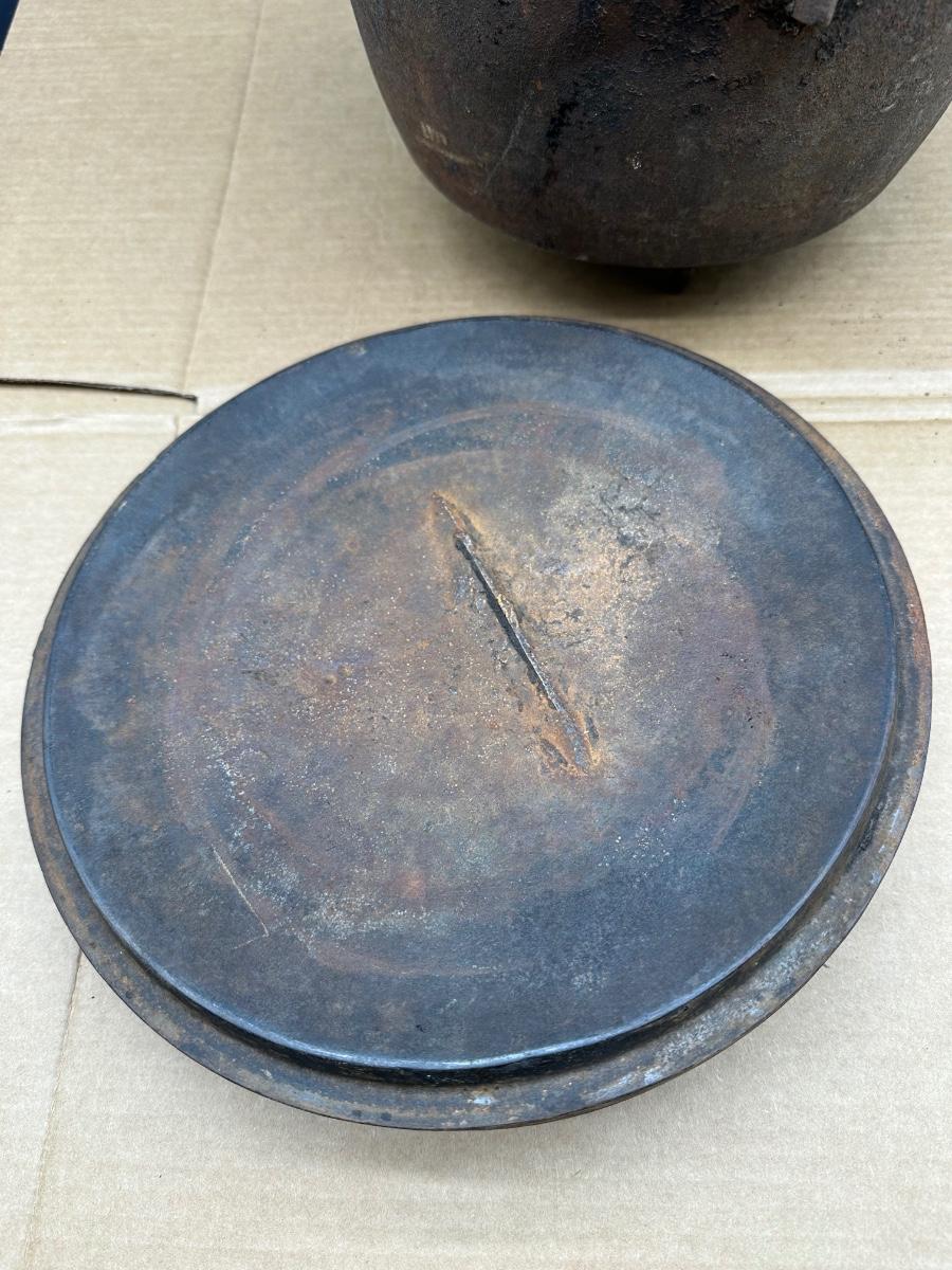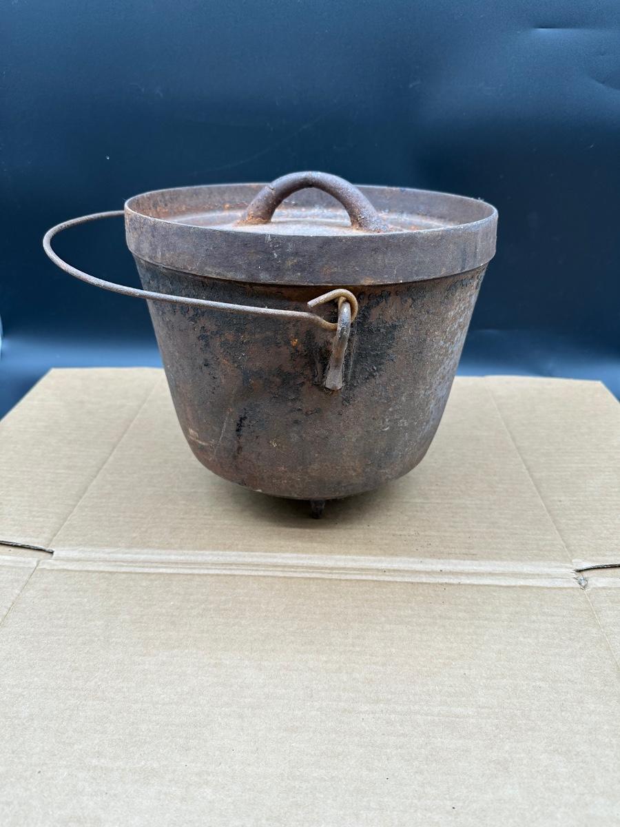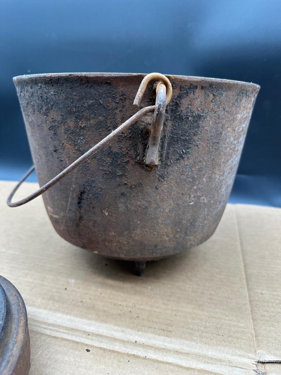 This example shows honest age and surface oxidation consistent with 19th–early 20th century cast iron. No cracks observed. Lid fits correctly. Interior and exterior show rust and patina from long-term storage and will need cleaning/seasoning if intended for use. Excellent candidate for restoration, display, or rustic décor.