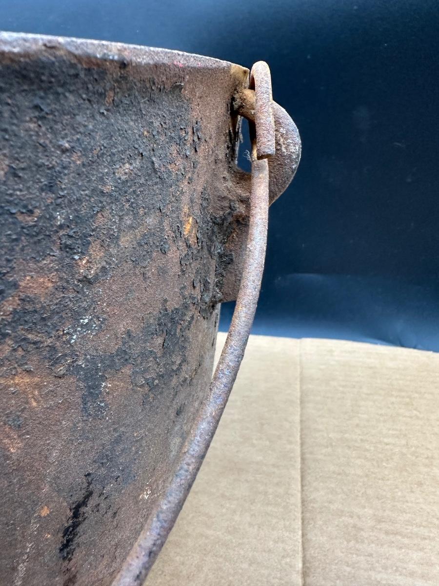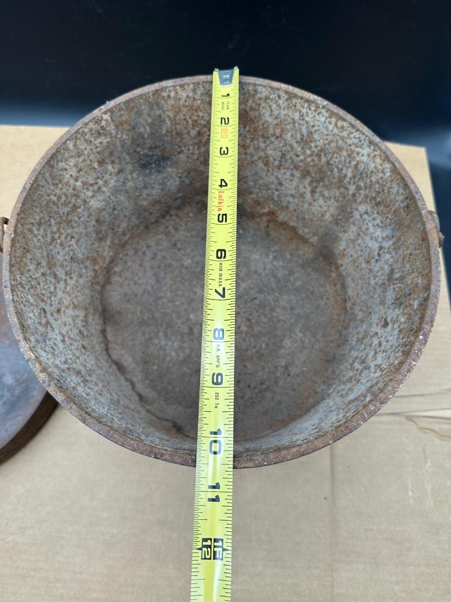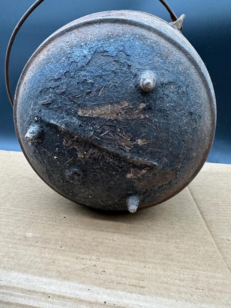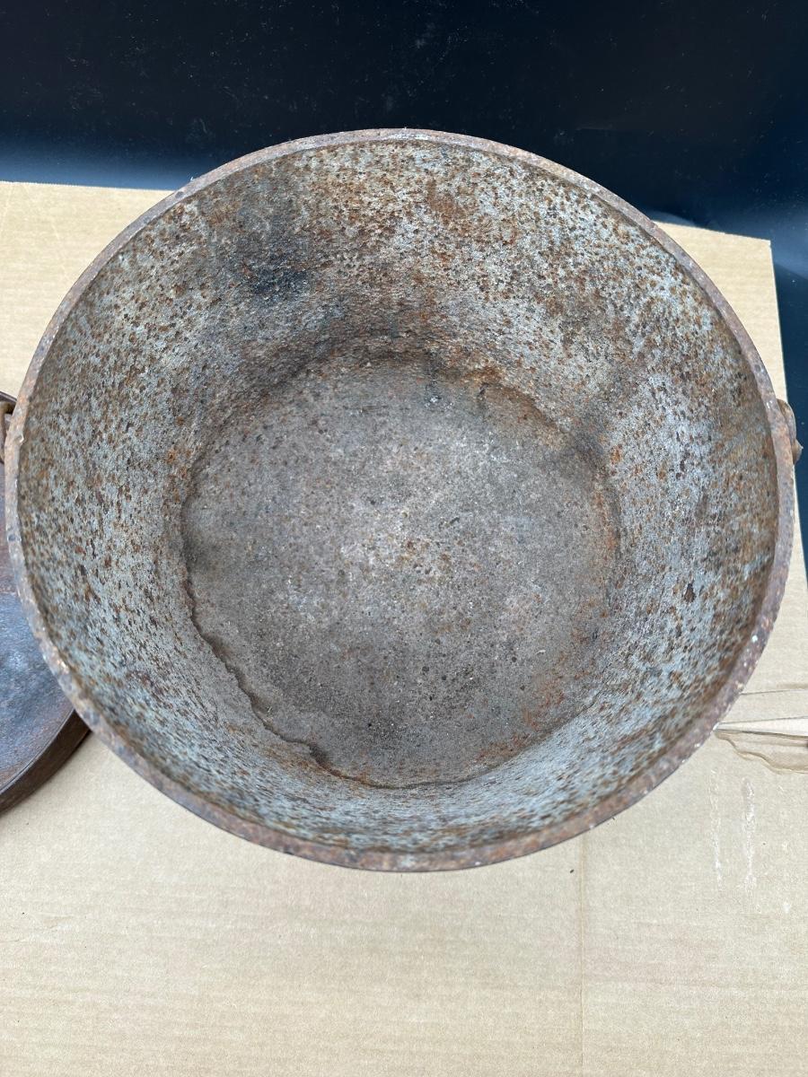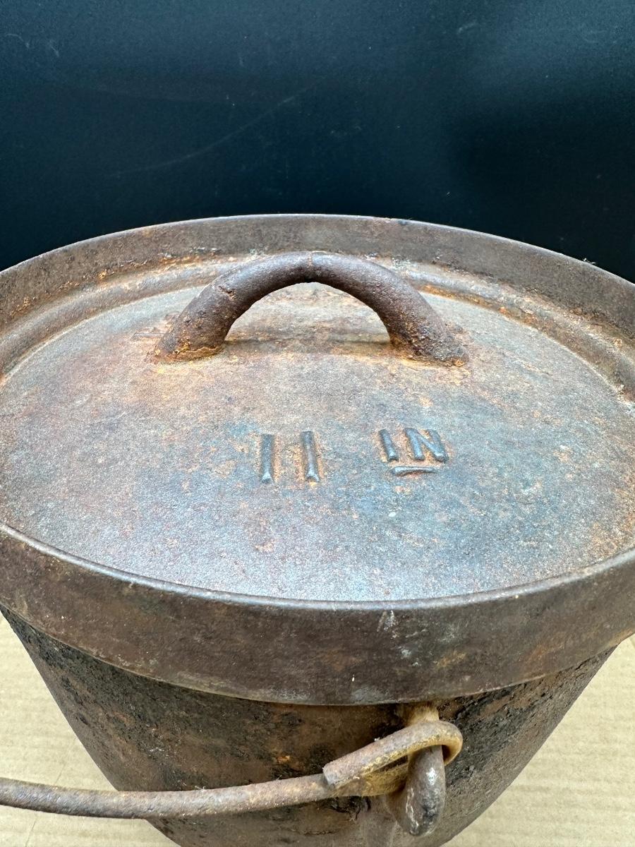 This example shows honest age and surface oxidation consistent with 19th–early 20th century cast iron. No cracks observed. Lid fits correctly. Interior and exterior show rust and patina from long-term storage and will need cleaning/seasoning if intended for use. Excellent candidate for restoration, display, or rustic décor.