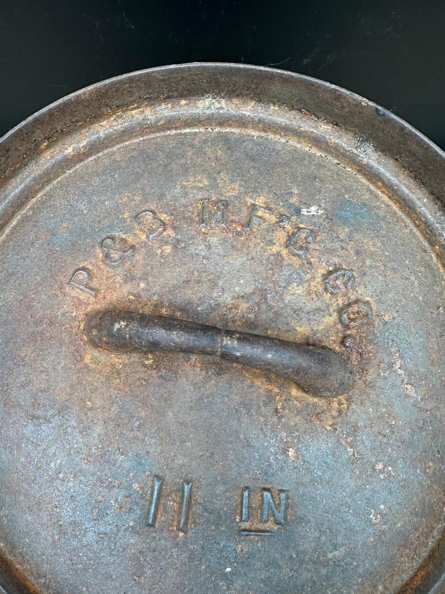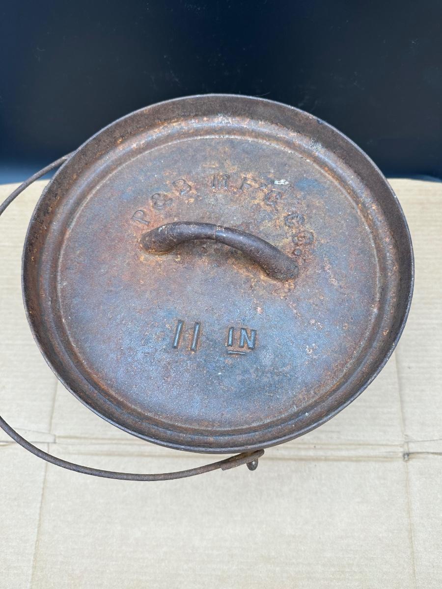Original antique cast iron bean pot manufactured by P&S MFG Co. (Philadelphia & St. Louis), marked No. 11 IN on the lid. Heavy, thick-walled pot with original matching lid, fixed bail handle, and three integral feet—classic form used for hearth and campfire cooking.