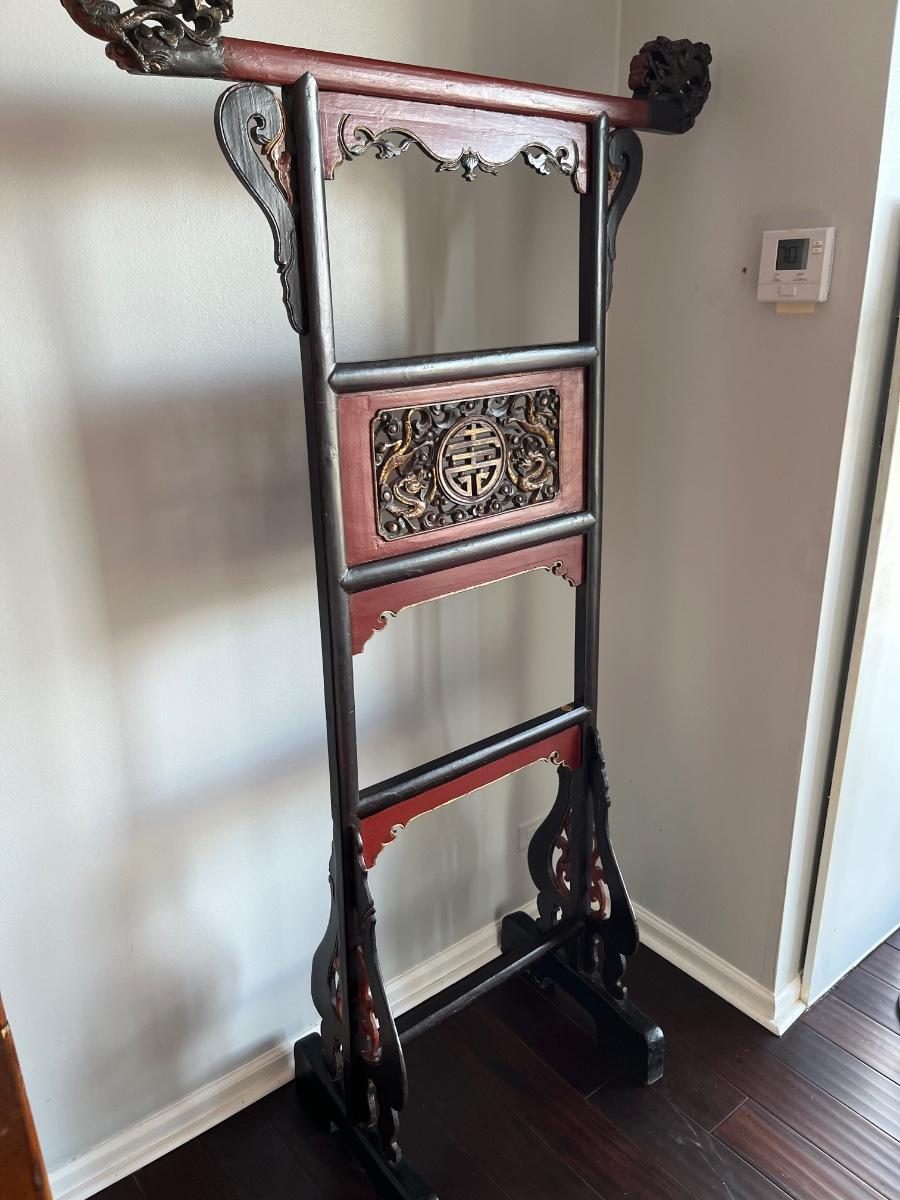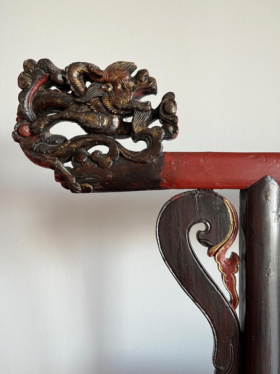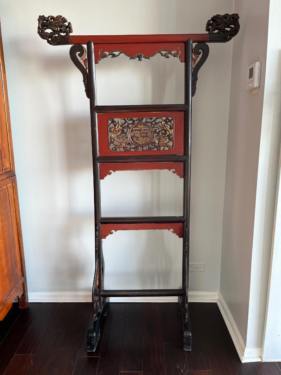 Richly carved and lacquered in red, black and gold, this is a 19th century Chinese court robe hanger. The central panel is carded with the symbol for double happiness and swirling dragons and it is decorated with dragons on the top. It bears customs stamps indicating that it an antique. Once used to hang elaborately embroidered court robes, now it is a stunning decor piece.