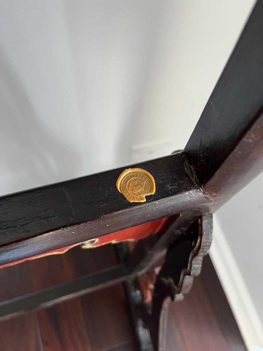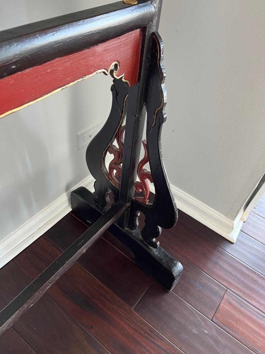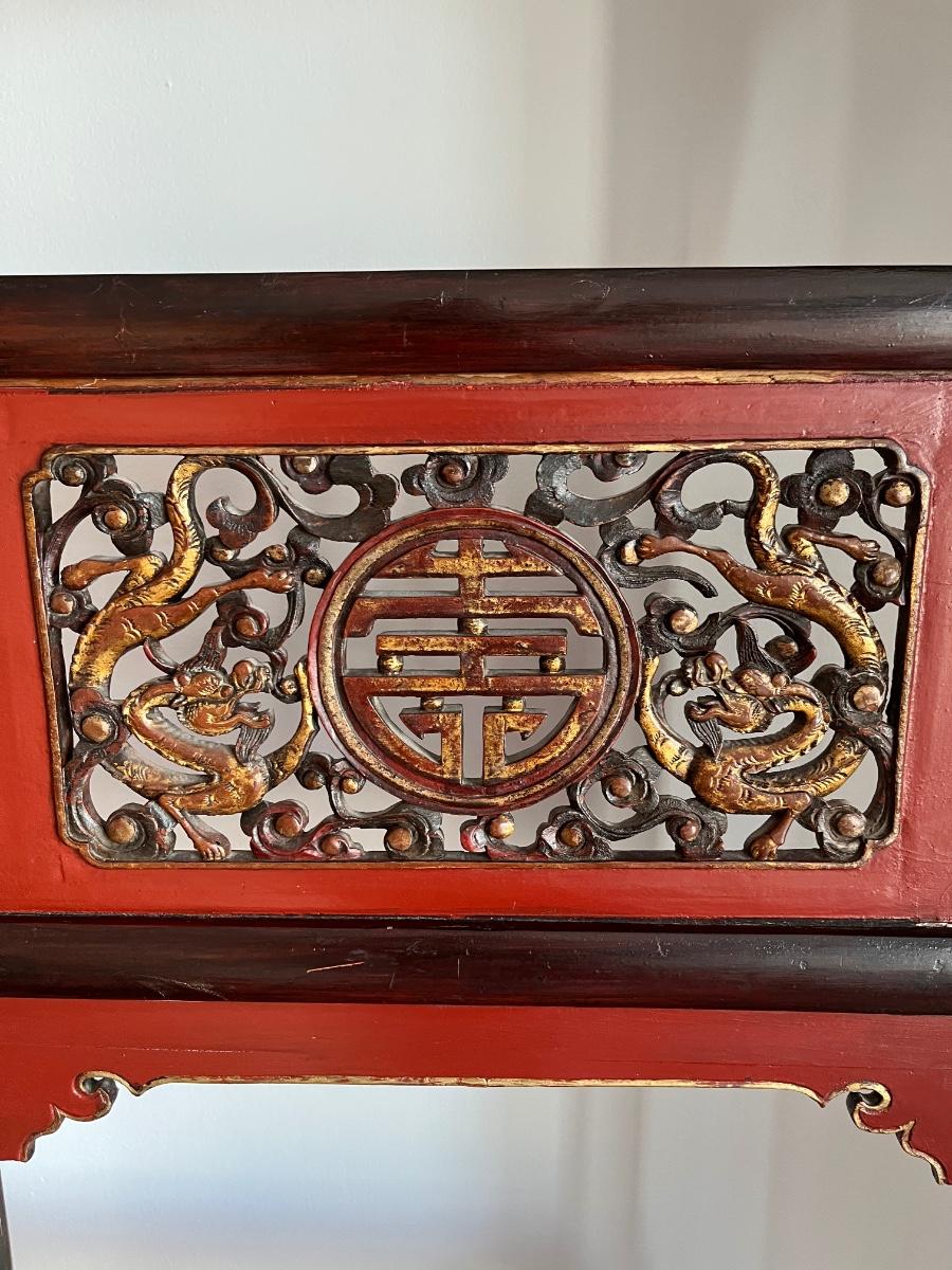Richly carved and lacquered in red, black and gold, this is a 19th century Chinese court robe hanger. The central panel is carded with the symbol for double happiness and swirling dragons and it is decorated with dragons on the top. It bears customs stamps indicating that it an antique. Once used to hang elaborately embroidered court robes, now it is a stunning decor piece.