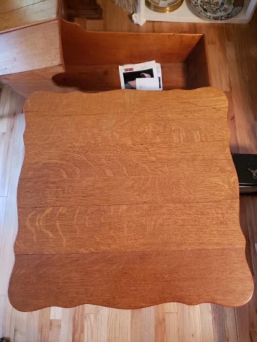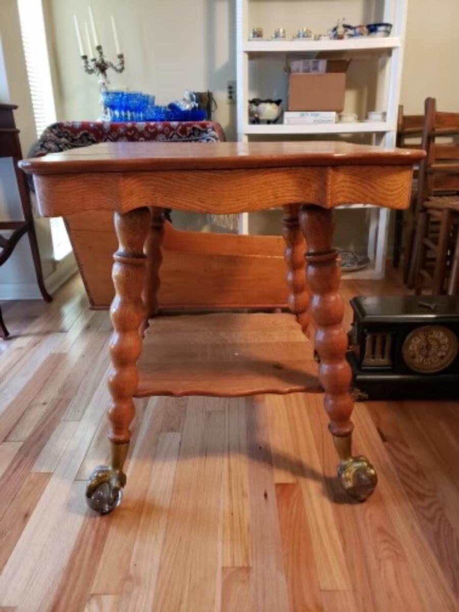 Antique quarter sawn  Oak parlor table with shelf. Turned legs with large glass ball & claw feet. 26 w x 29 h. Excellent condition.