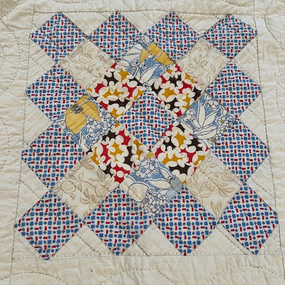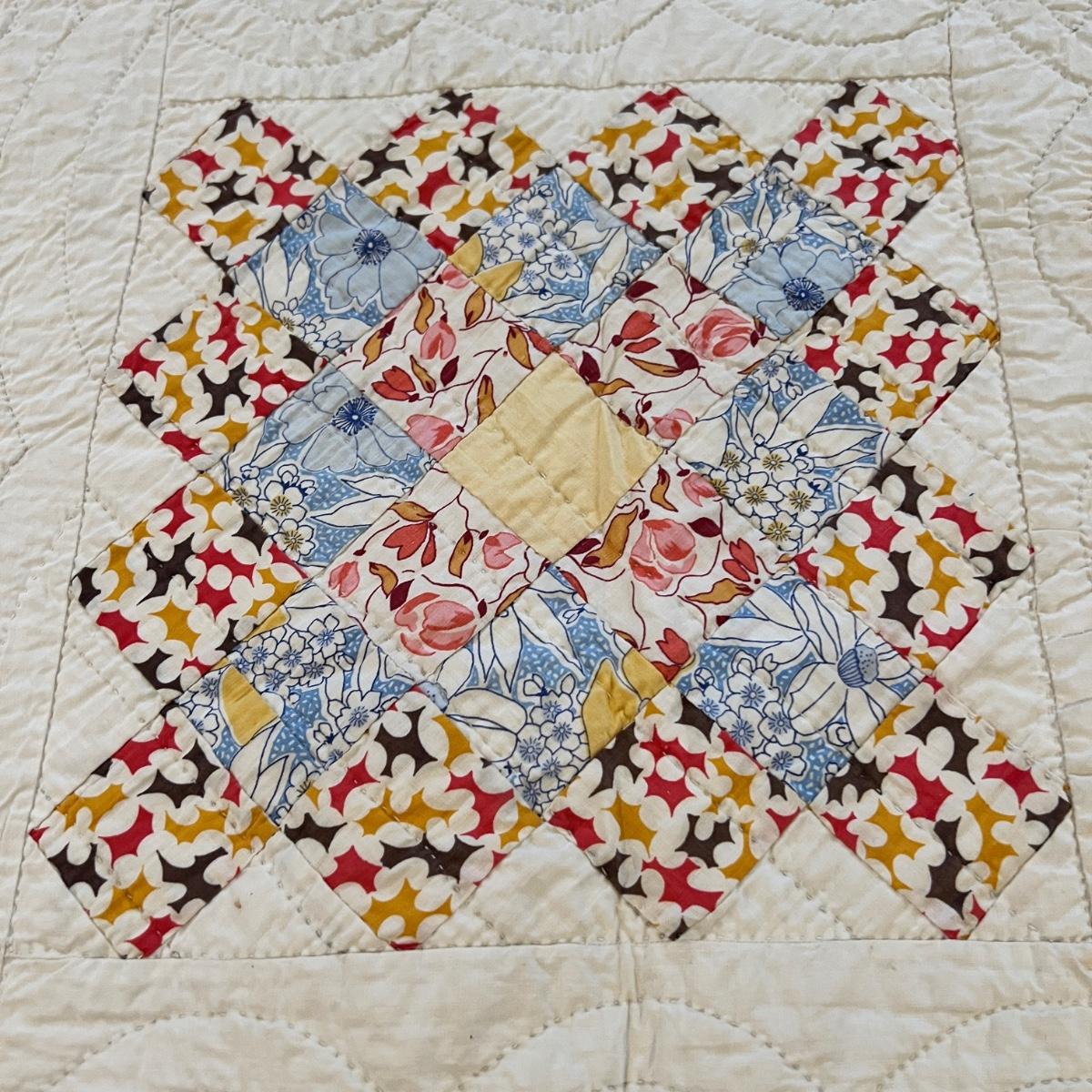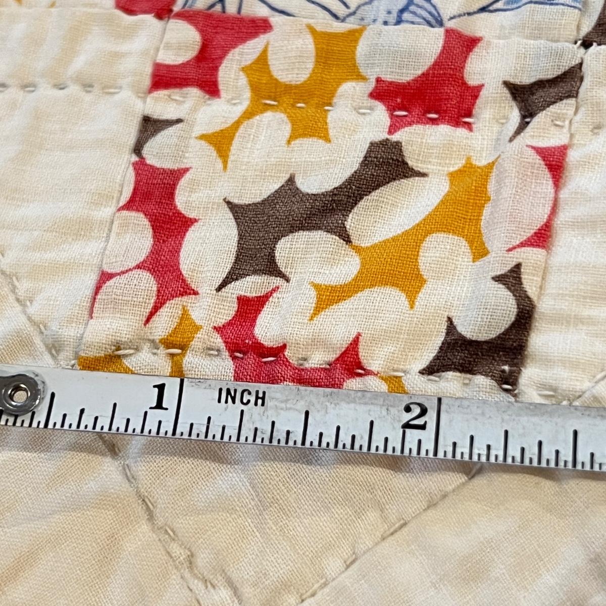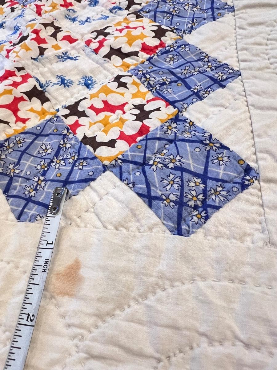 This antique hand made quilt was made with very fine stitches (see the close up pic) by the estate owners great grandmother born in 1881. It has some small spots as shown in pics but otherwise in great condition for its age. We have another one up for auction #306