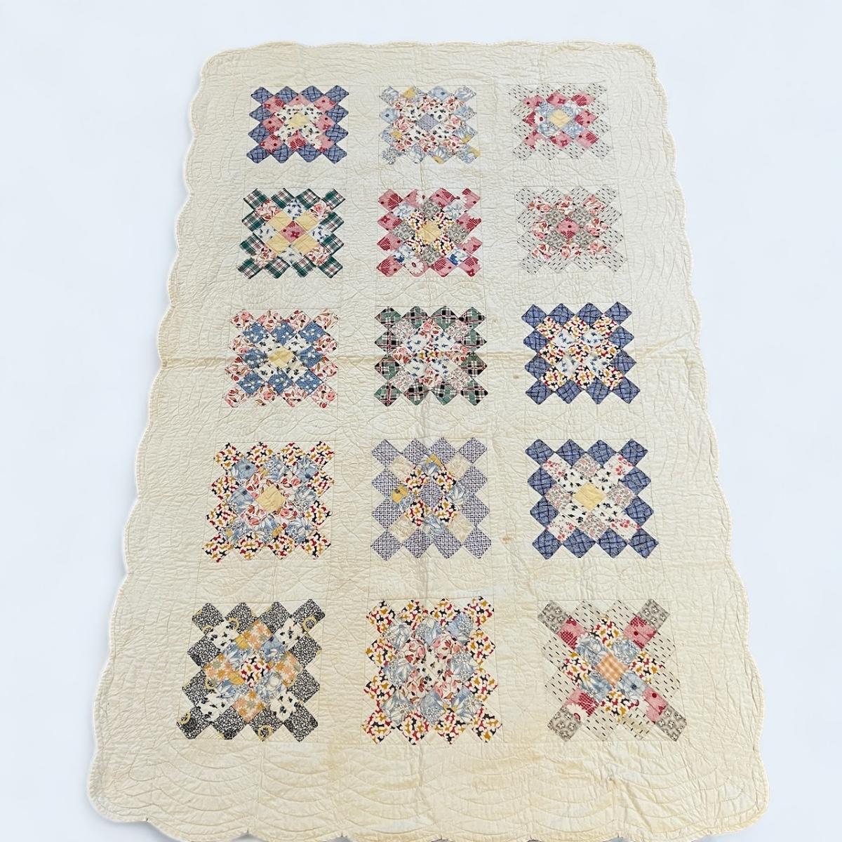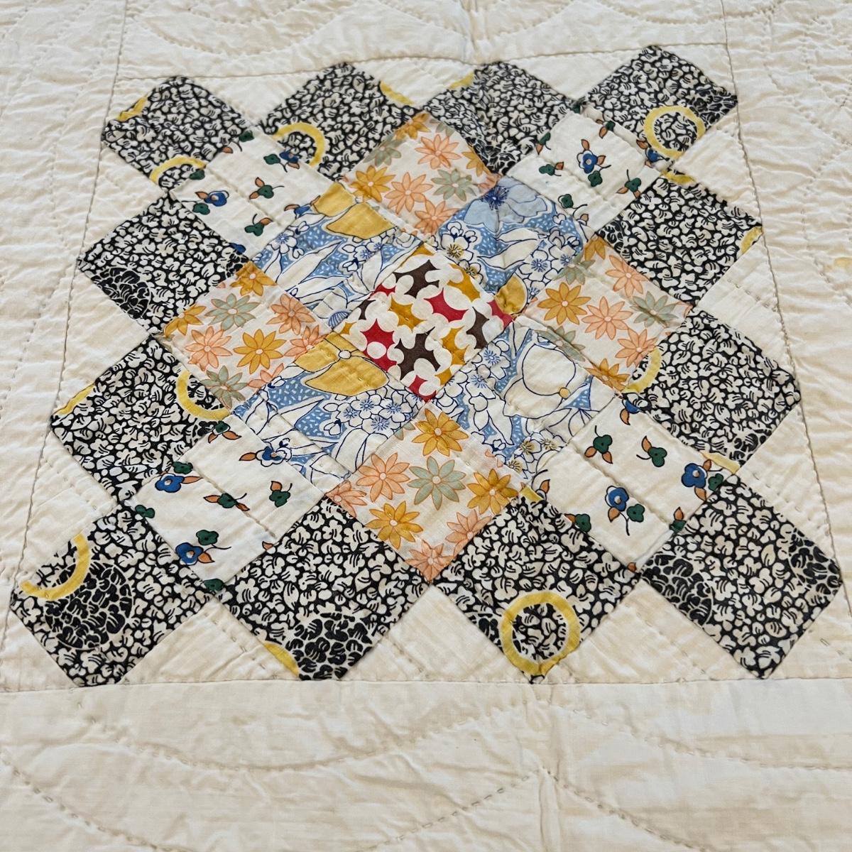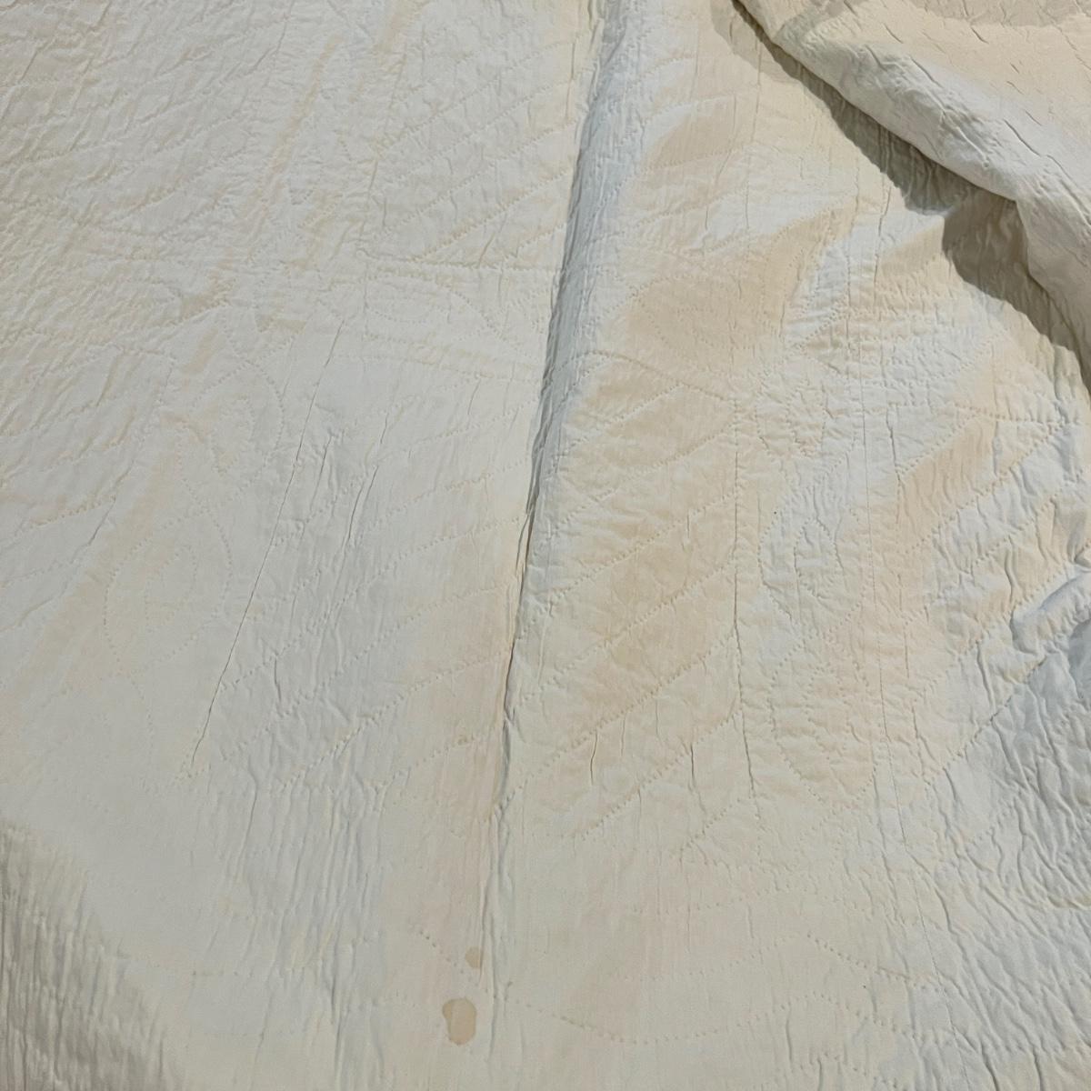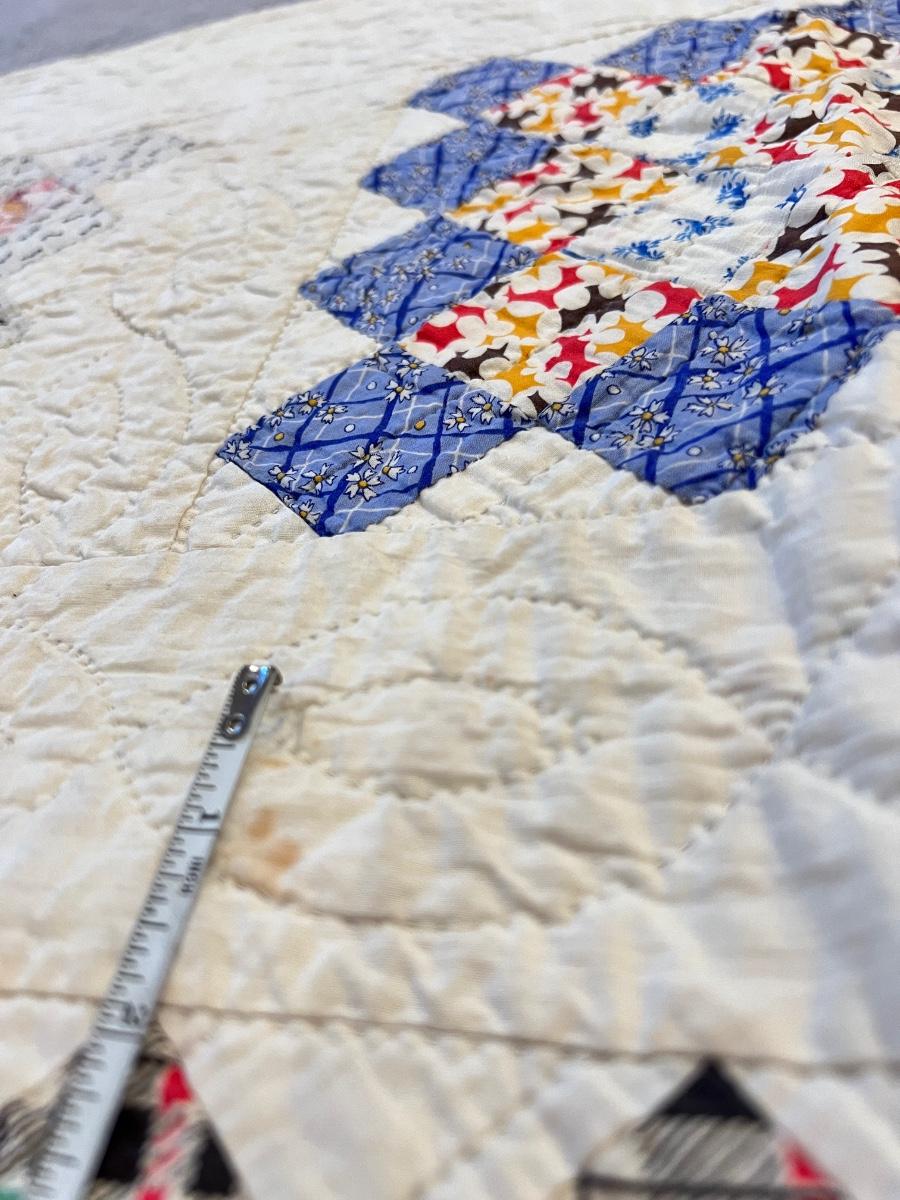 This antique hand made quilt was made with very fine stitches (see the close up pic) by the estate owners great grandmother born in 1881. It has some small spots as shown in pics but otherwise in great condition for its age. We have another one up for auction #306