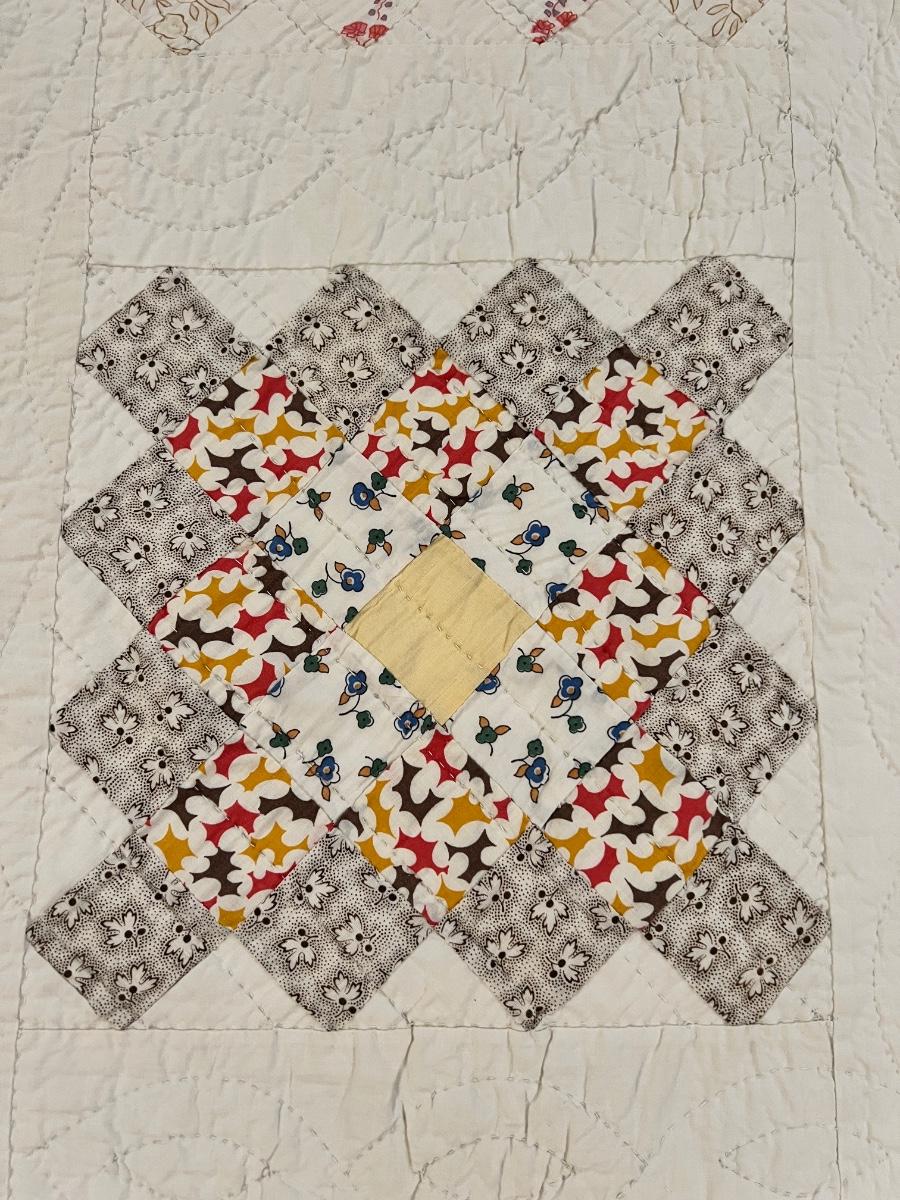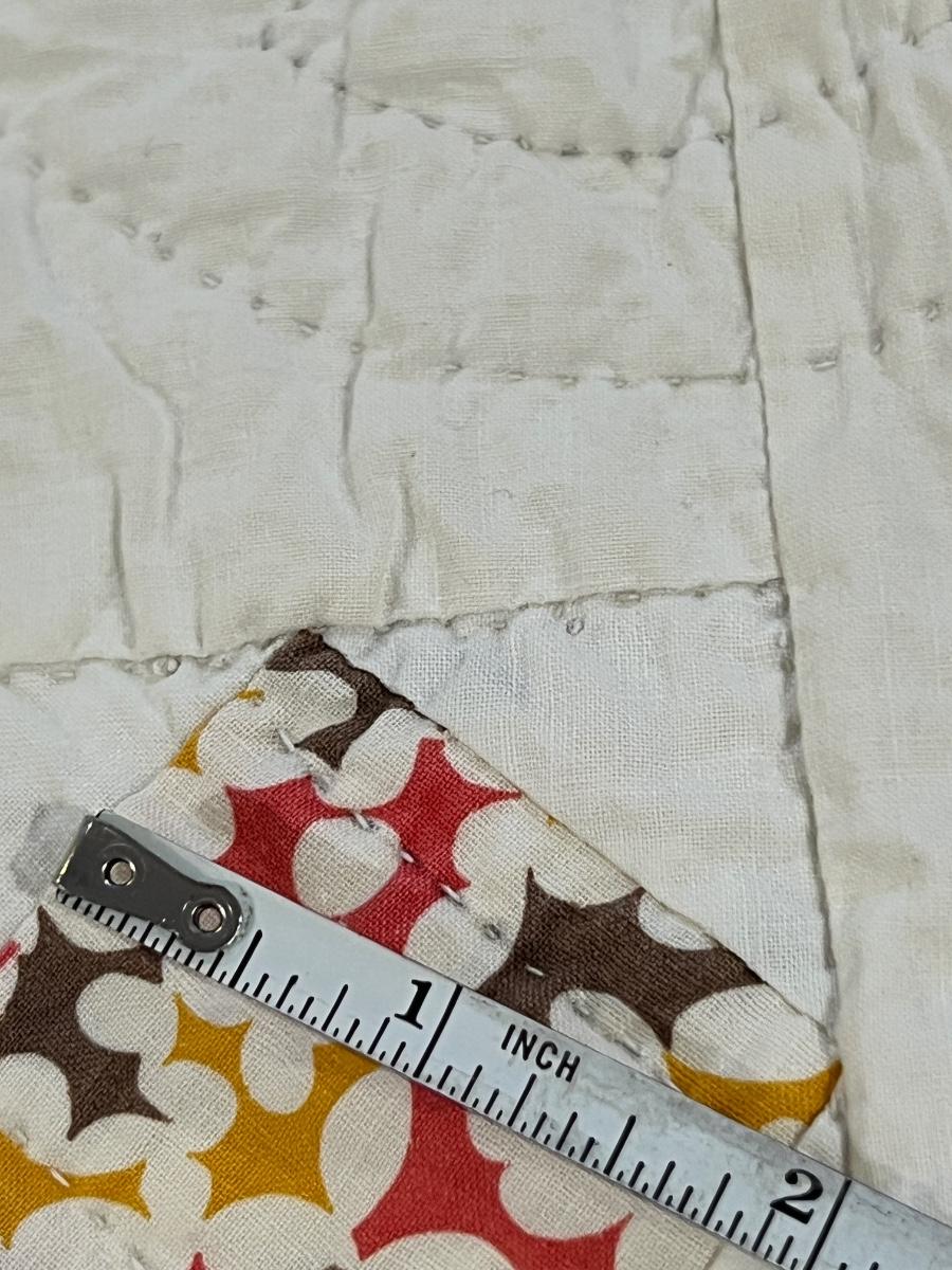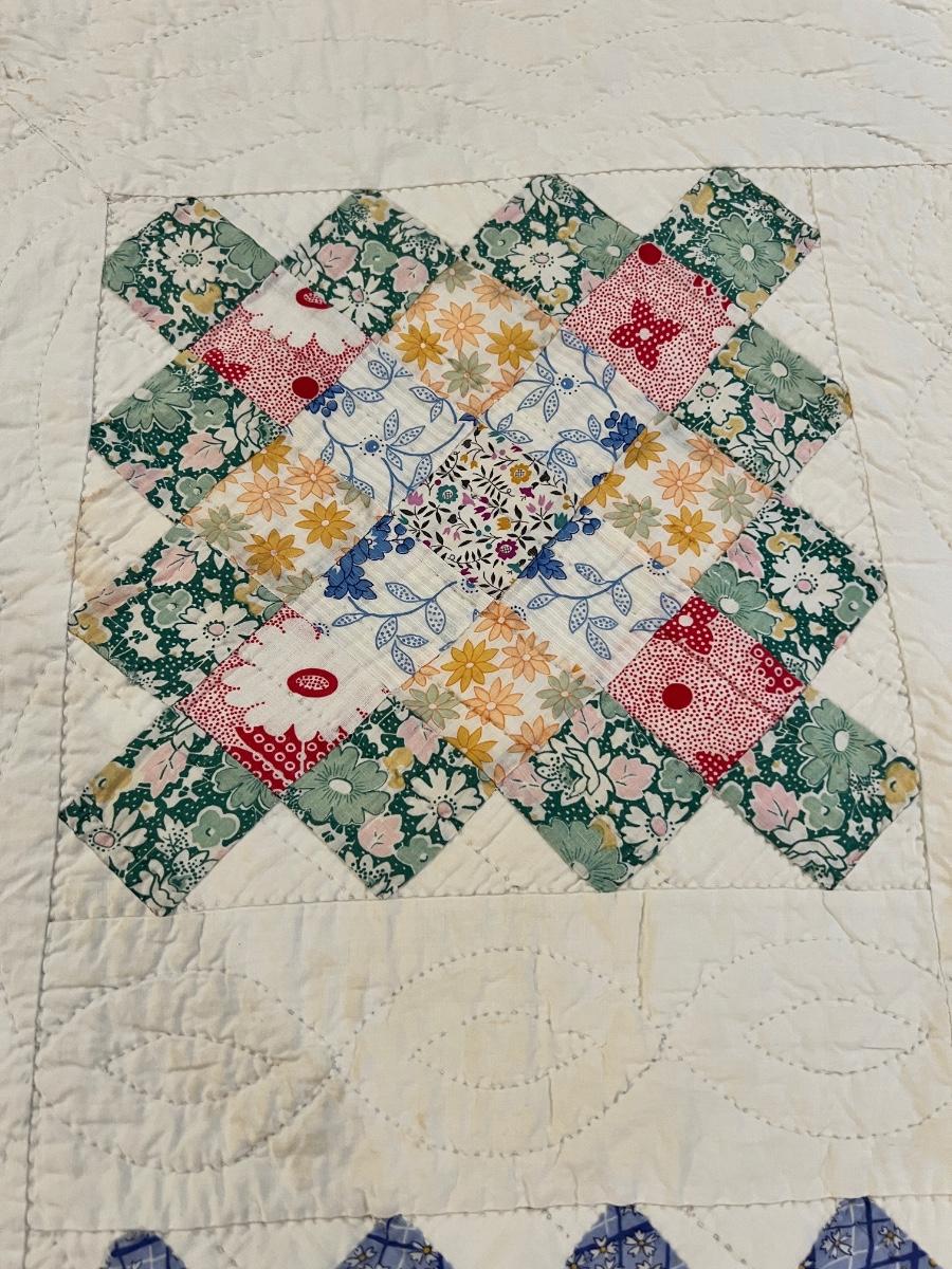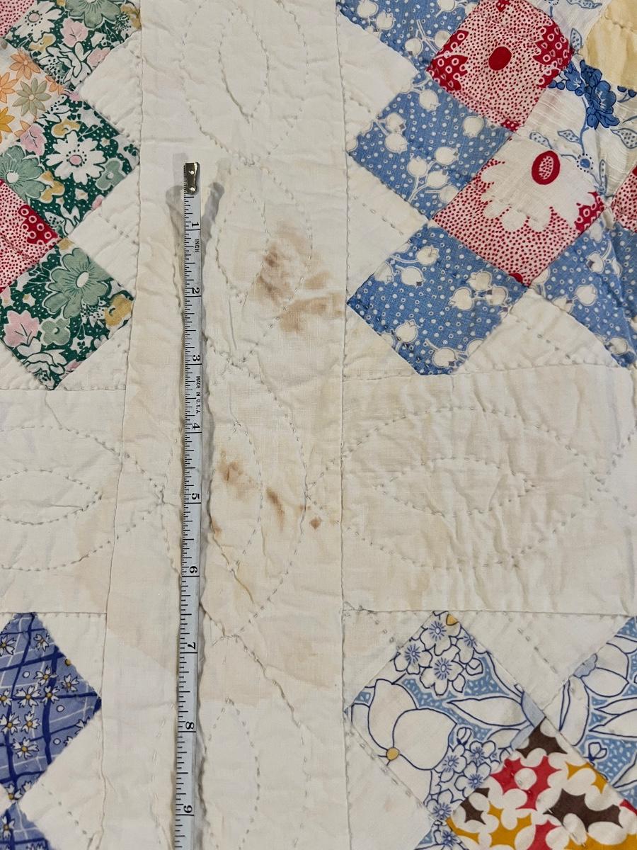 This antique hand made quilt was made with very fine stitches (see the close up pic) by the estate owners great grandmother born in 1881. It has some spots as shown in pics but otherwise in great condition for its age. We have another one up for auction #305. Unlike the other one, this quilt has a pocket on the back to insert a rod and hang on the wall.