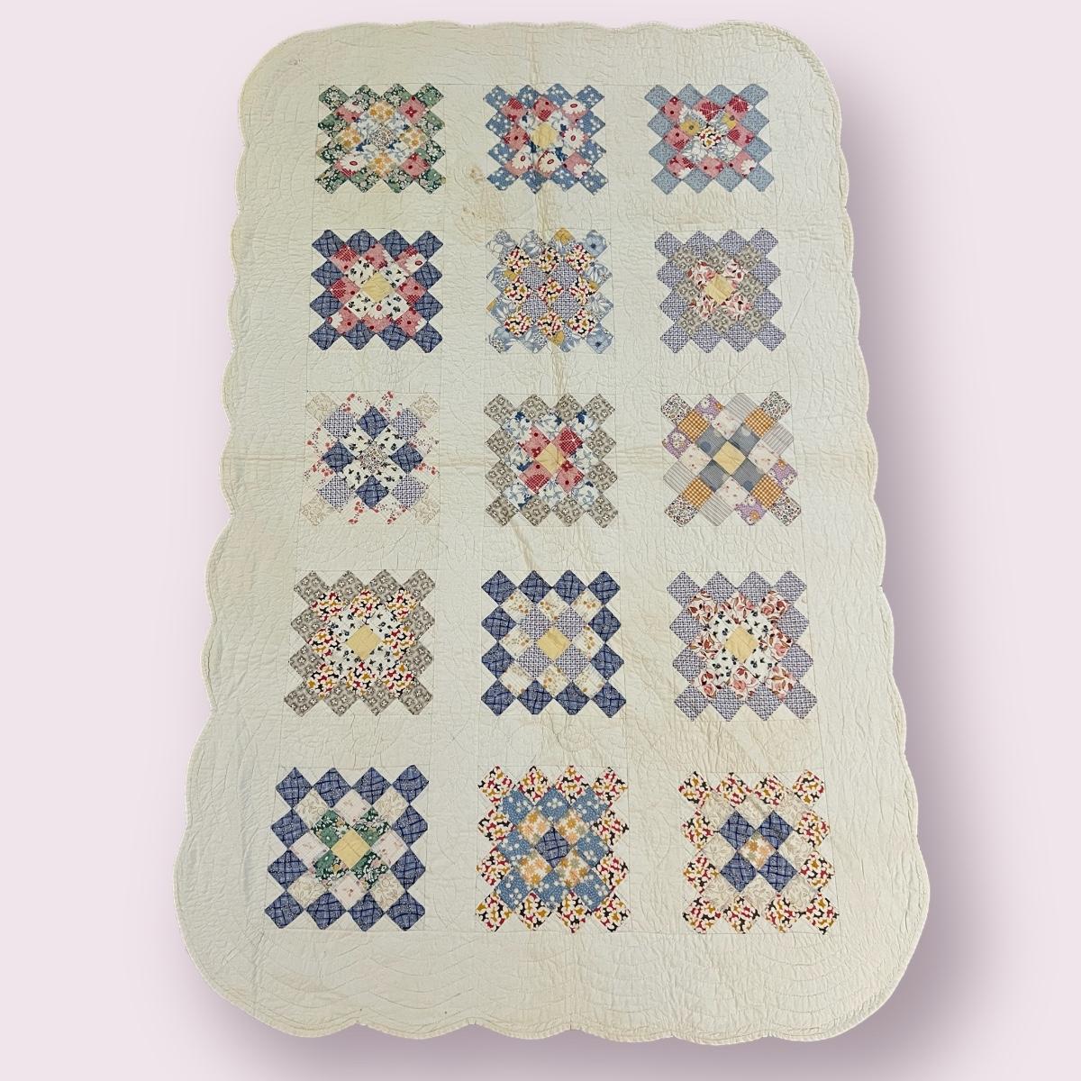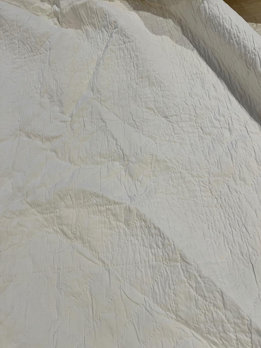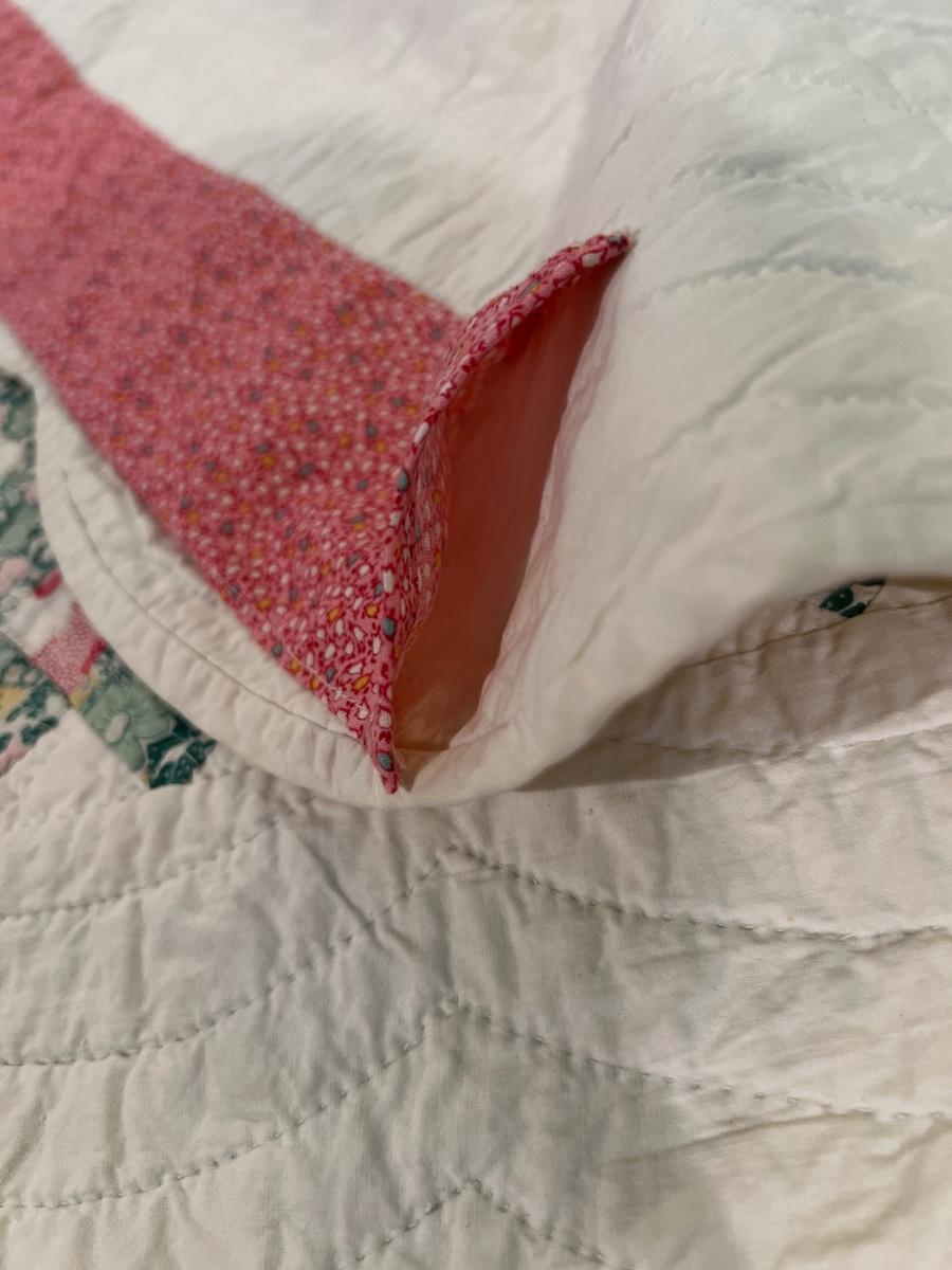 This antique hand made quilt was made with very fine stitches (see the close up pic) by the estate owners great grandmother born in 1881. It has some spots as shown in pics but otherwise in great condition for its age. We have another one up for auction #305. Unlike the other one, this quilt has a pocket on the back to insert a rod and hang on the wall.