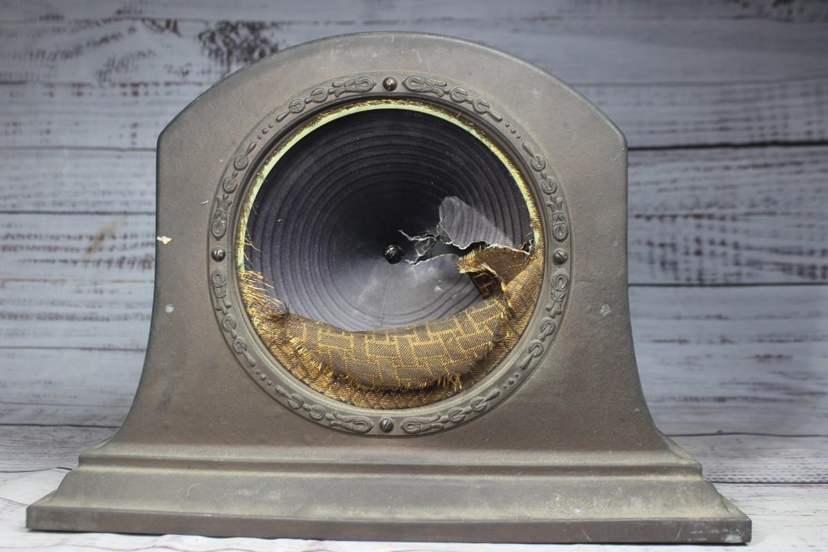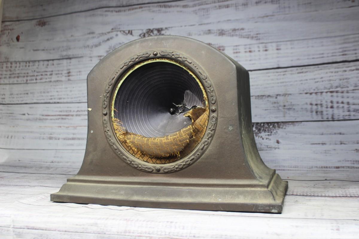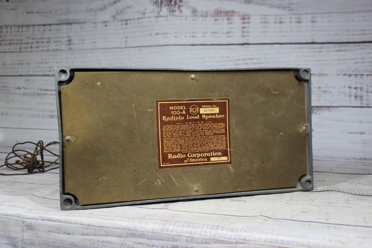 Antique Radiola Model 100-A Art Deco Loudspeaker, the front of the speaker is ripped and there is some overall wear to the metal body. There is no other significant damage to the speaker and is in overall fair condition for its age. Has not been tested, check pictures for more details and for sizing.