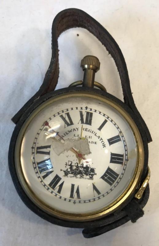 Description: Antique Bubble facade Railway Regulator brass and leather Swiss Made pocket clock. Item works. Material: Brass and robust leather. Measurement approximate: 4H. Shipping cost: $15 except Alaska,Hawaii & California
