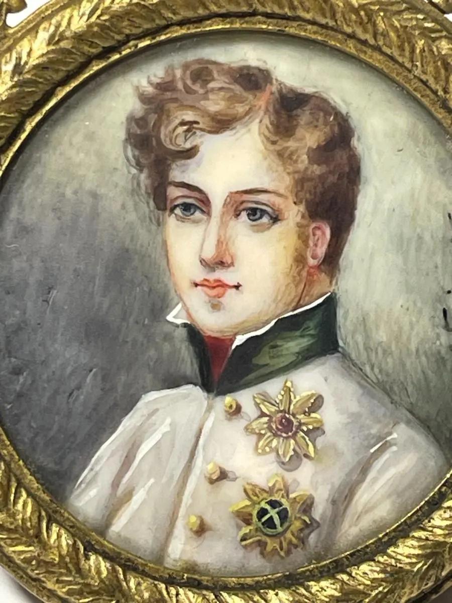 Antique Rare 18/19 Century Napoleon-II Miniature Portrait Painting on Bone or Ivory Signed w/2" x 2.5" Easel Excellent Condition as Pictured.