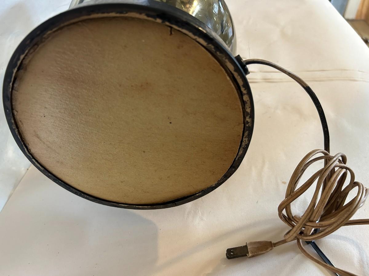 Disclosures: We tested the lamp, which is in proper working condition. As with all vintage electrical items, we recommend a professional evaluation. The top metal will need full polishing or restoration, hence the reduced price. (See pictures for details.)