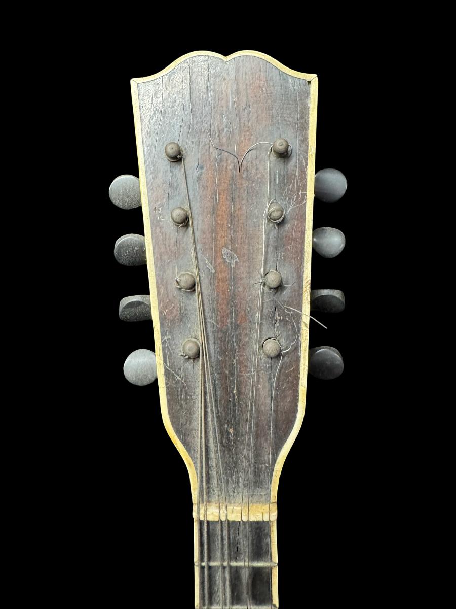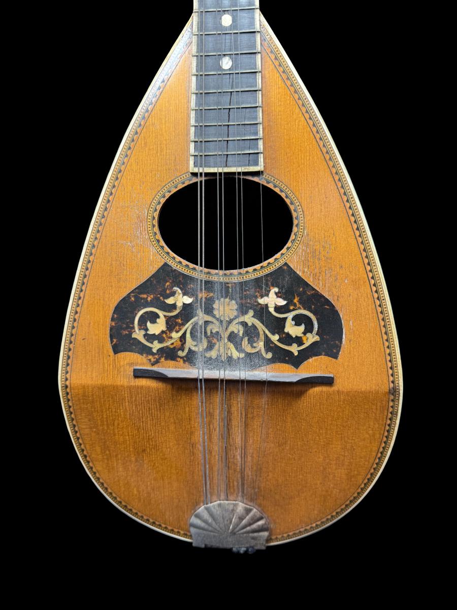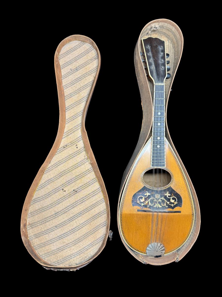 This piece has ebony pegs, mother of pearl inlay, mahogany wood, and ivory accents. The strings are intact. This is a solid piece, with little age related wear. Includes original case, which has signs of age related wear. Measurement: 25” x 8.5”. [JL]