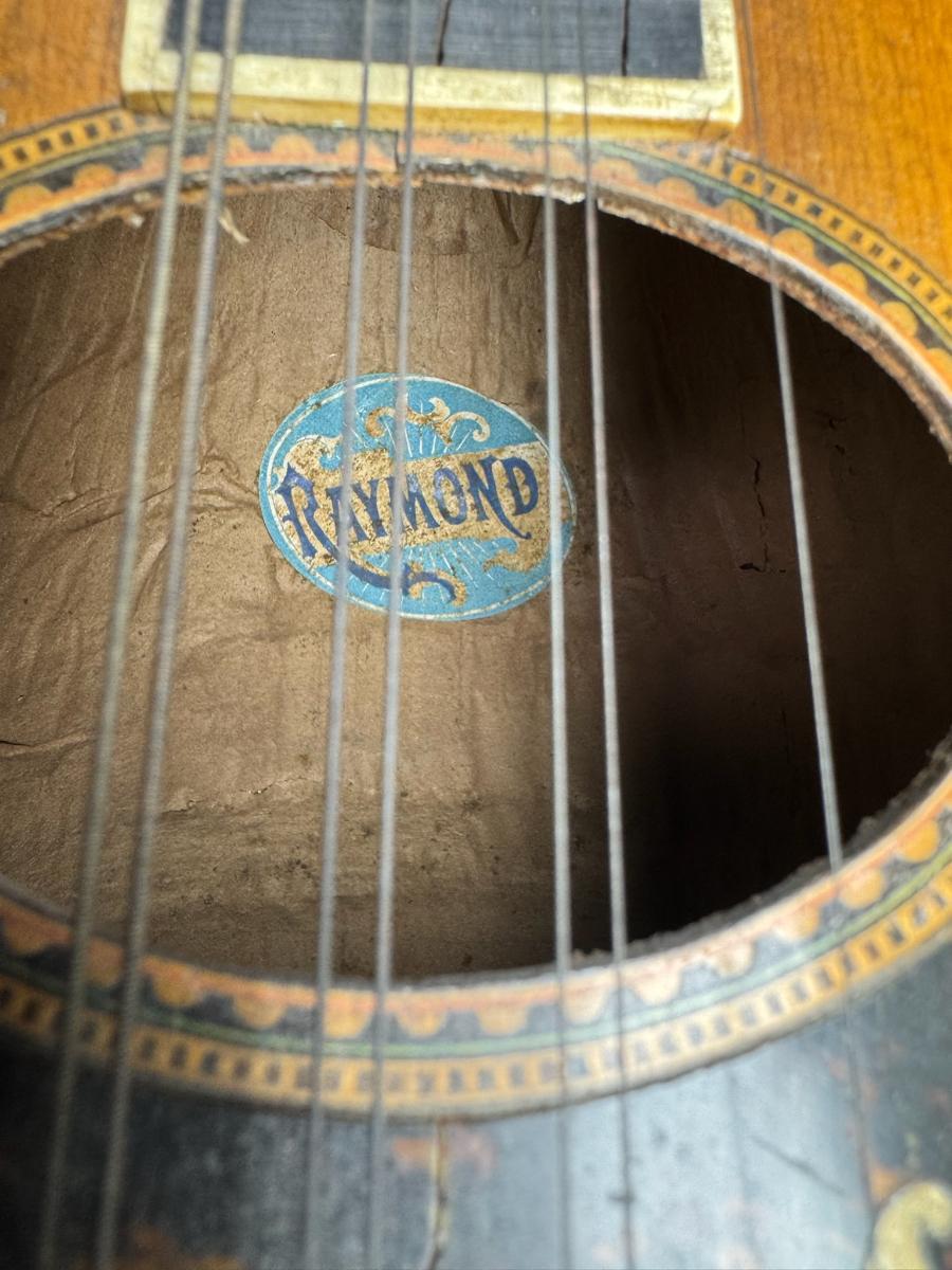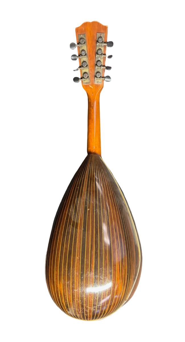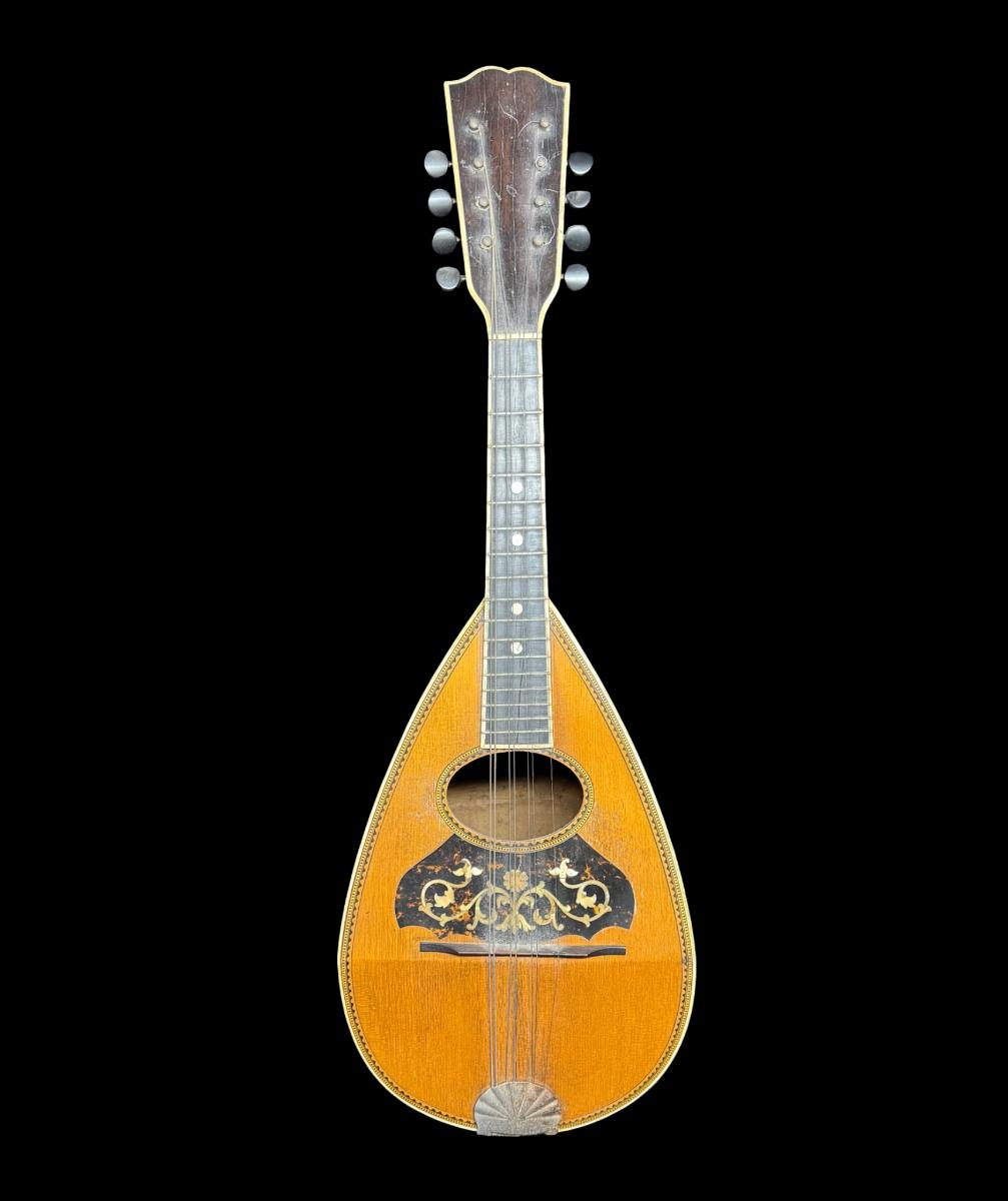 This piece has ebony pegs, mother of pearl inlay, mahogany wood, and ivory accents. The strings are intact. This is a solid piece, with little age related wear. Includes original case, which has signs of age related wear. Measurement: 25” x 8.5”. [JL]