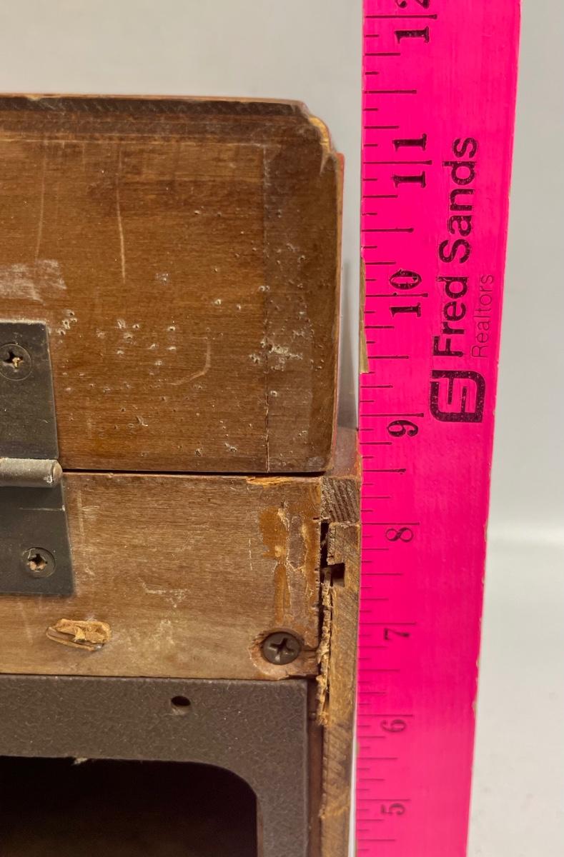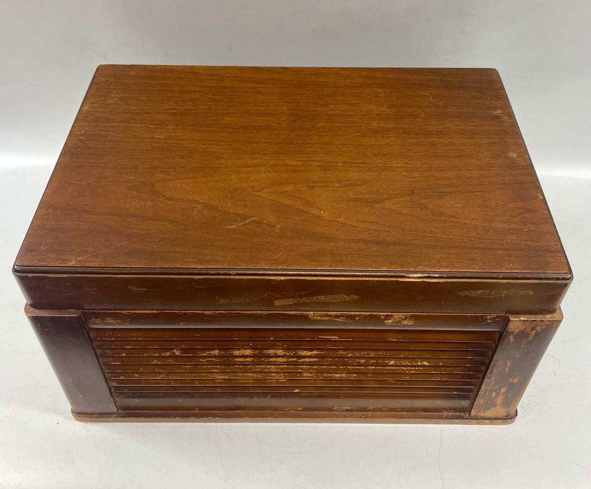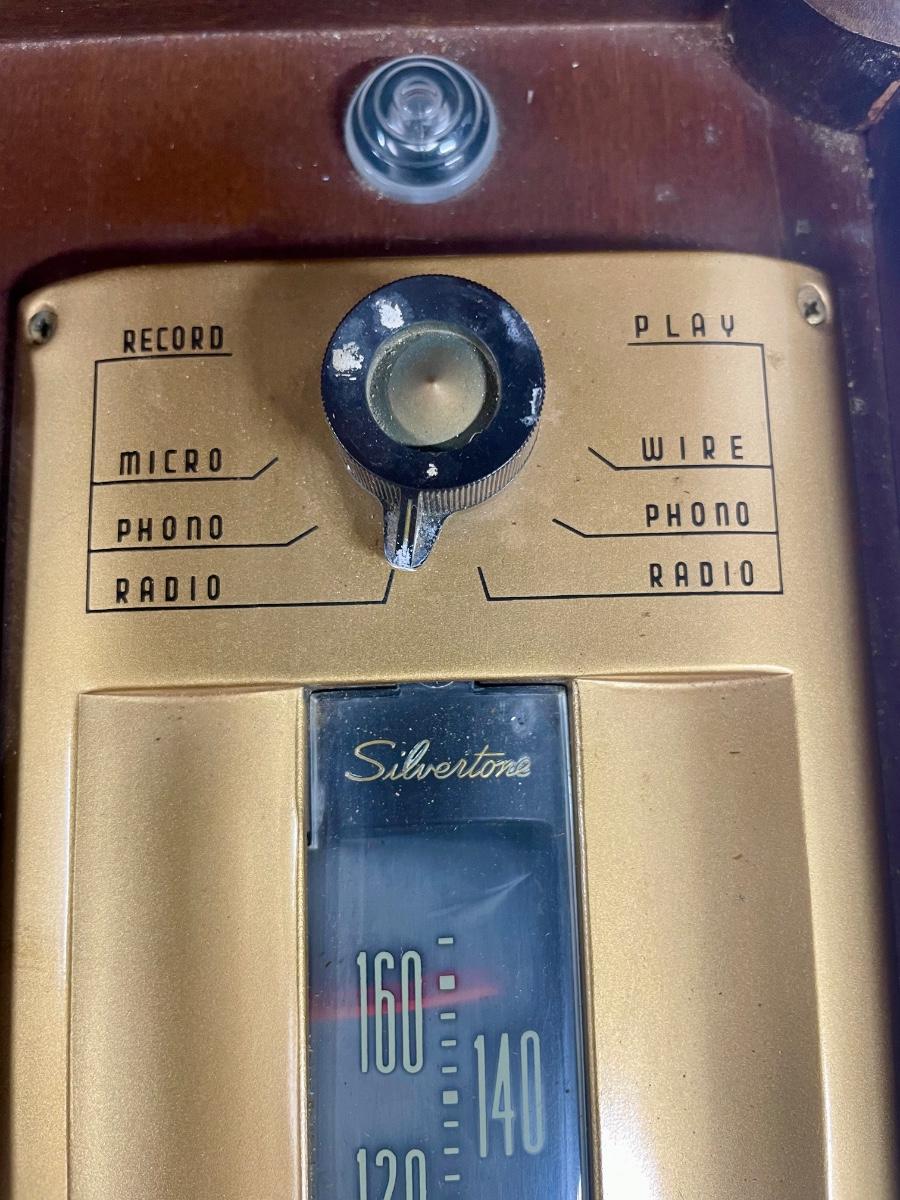 Silvertone brand marketed by Sears. Turntable played 78 RPM records, the radio is AM band only. Wire recorder has thin steel wire which is magnetized to capture sound. Wood case is solid but has visible wear. Has an attached electric cord but is untested.