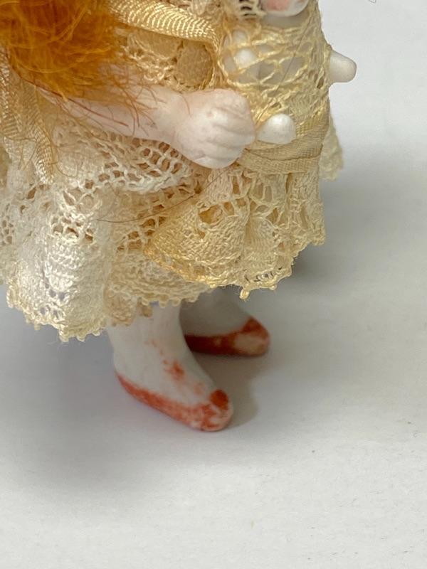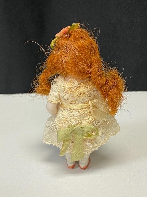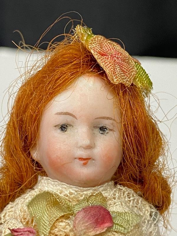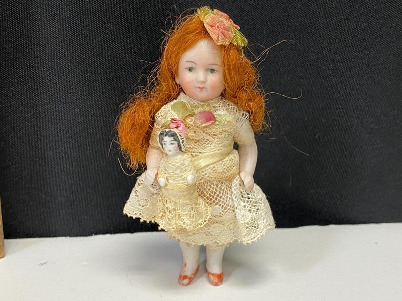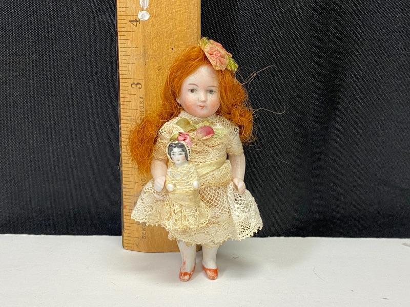 Antique 3.5" dollhouse doll. Beautiful red headed doll with her little dolly. Bisque doll, jointed arms. Lace dress with flowers has been glued in place, did not see any markings. Face is nicely painted. Good antique condition.