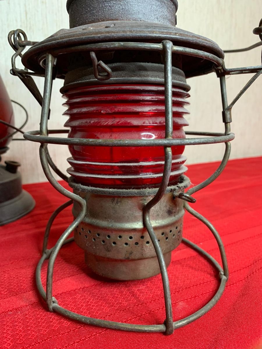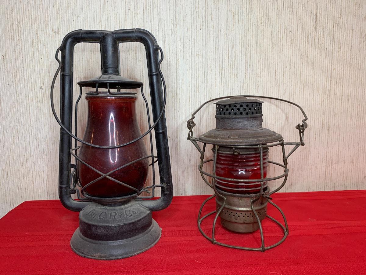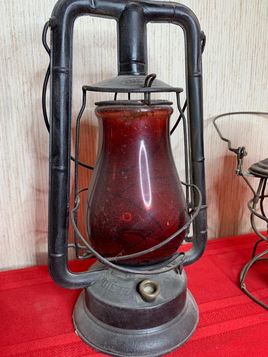 Two antique red lanterns, one being Dietz (larger one) and the smaller one is from 1911 from The Adams and Westlake Company