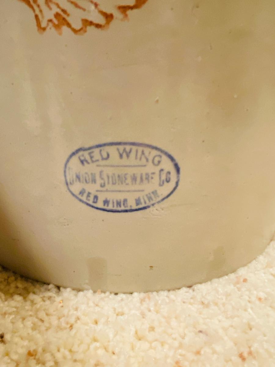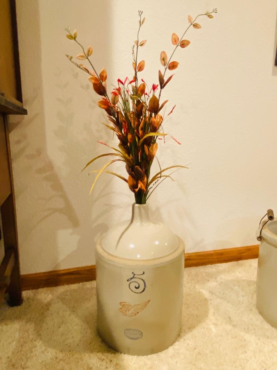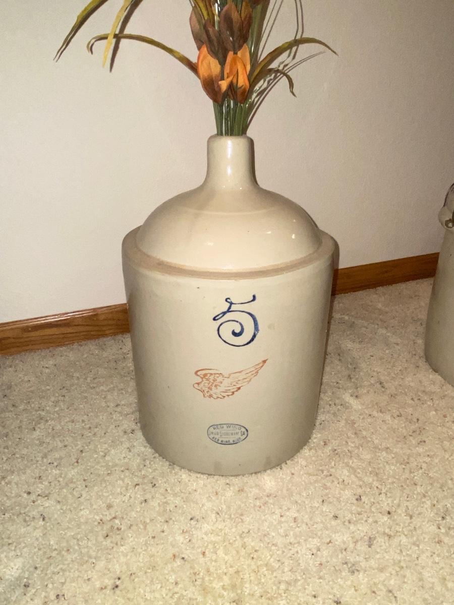 ANTIQUE RED WING STONEWARE 5 GALLON JUG W/FAUX FLOWERS