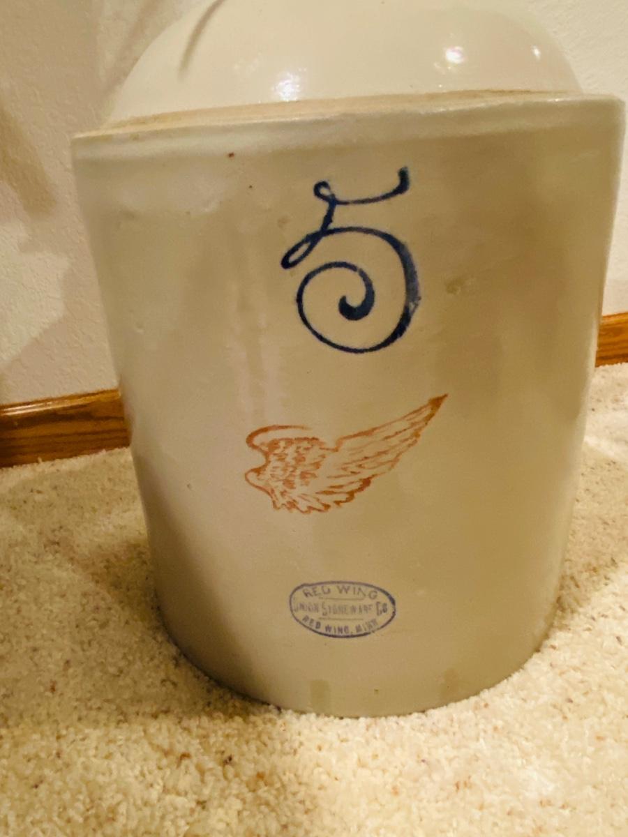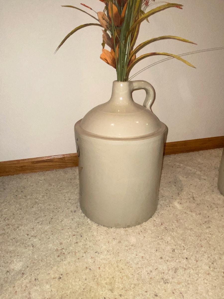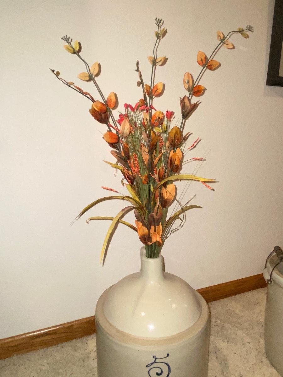 ANTIQUE RED WING STONEWARE 5 GALLON JUG W/FAUX FLOWERS