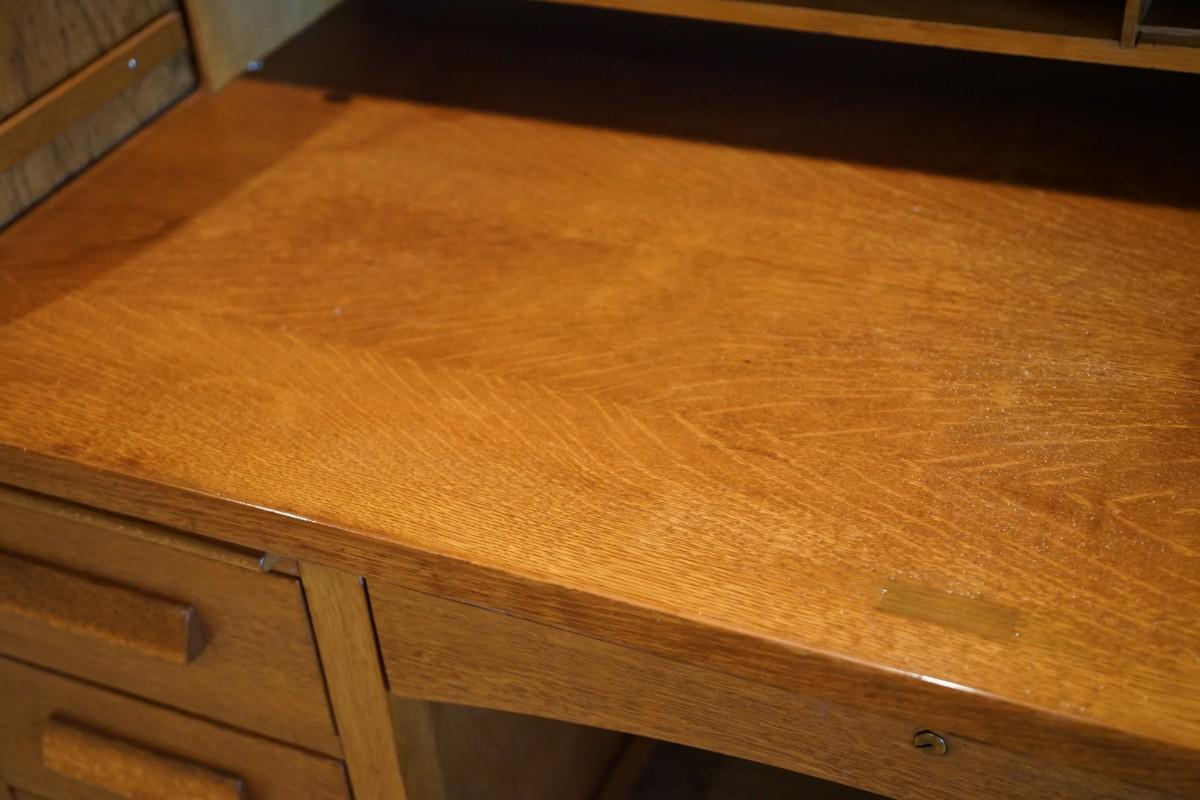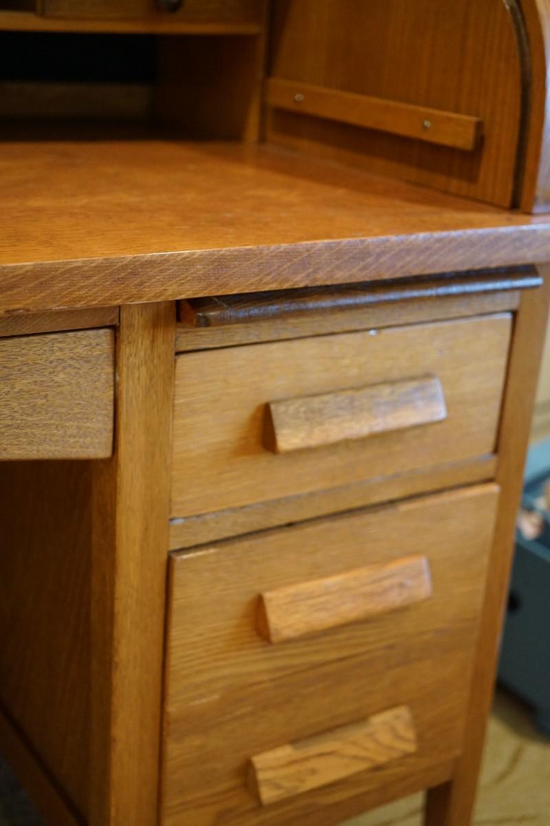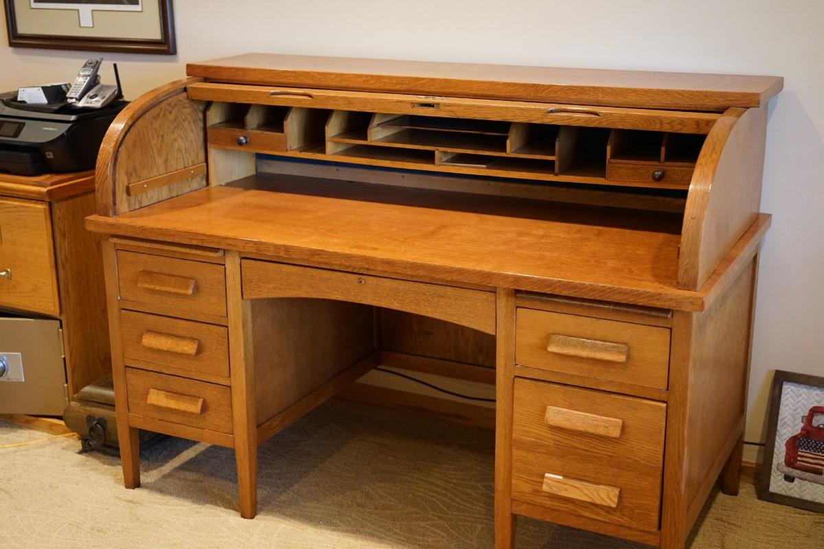 An early 1900's oak desk of a larger size. If does have a cyclinder roll top that can be easily removed if you need the work space.
