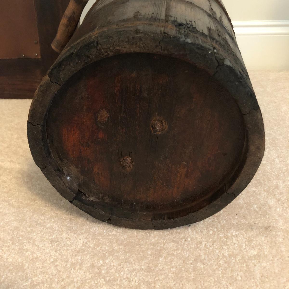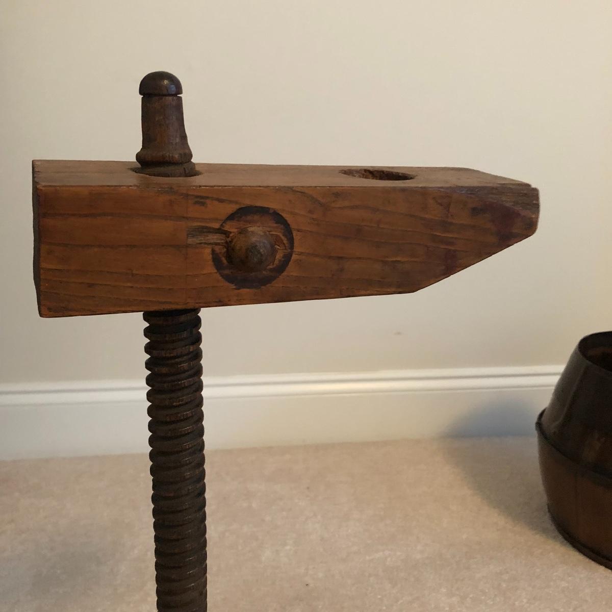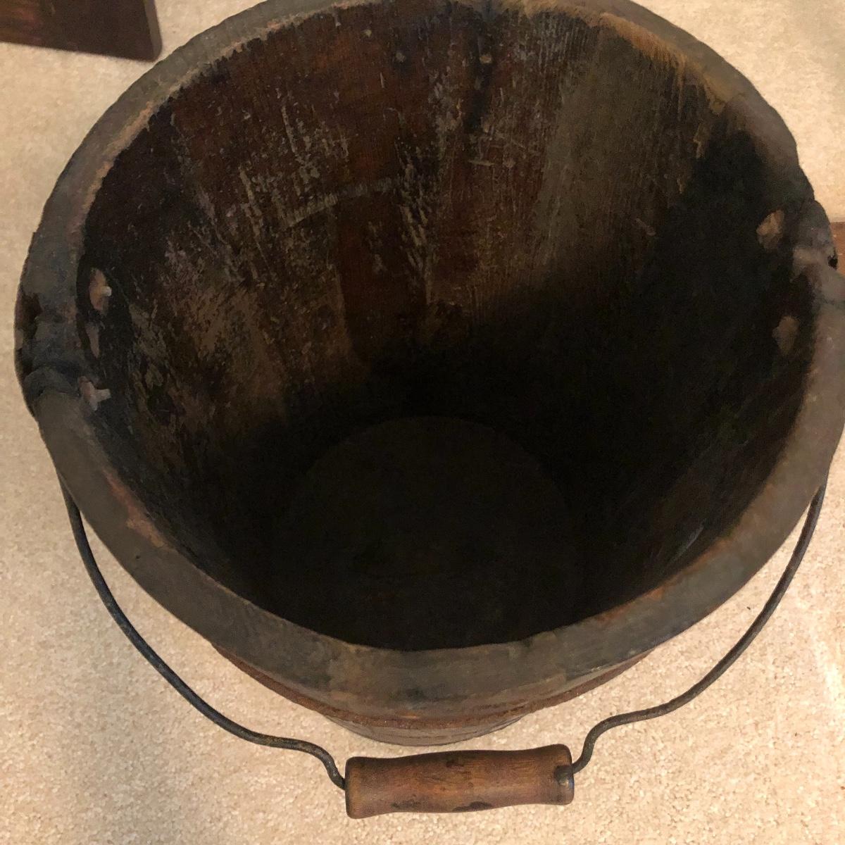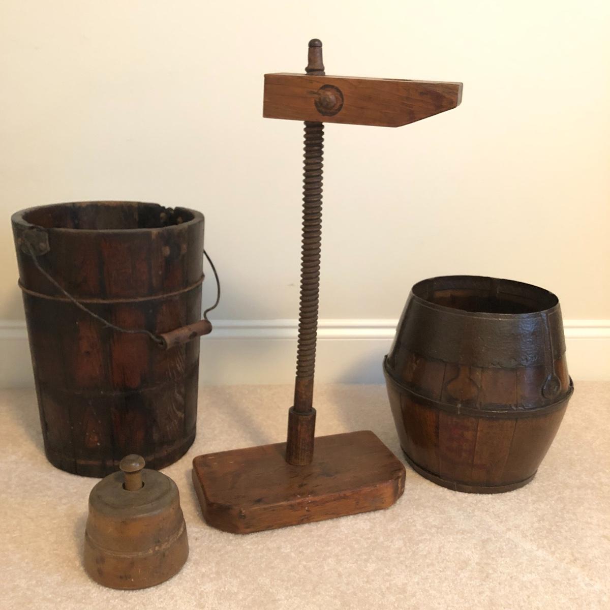 Four wood items in this lot that includes some sort of retort stand, a bucket, a butter press and the 4th item which may not be antique unlike all the other items, is a wood and metal container that would make a great plant or faux floral arrangement holder.