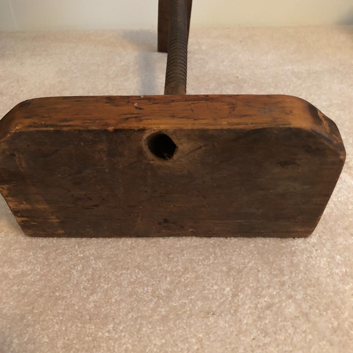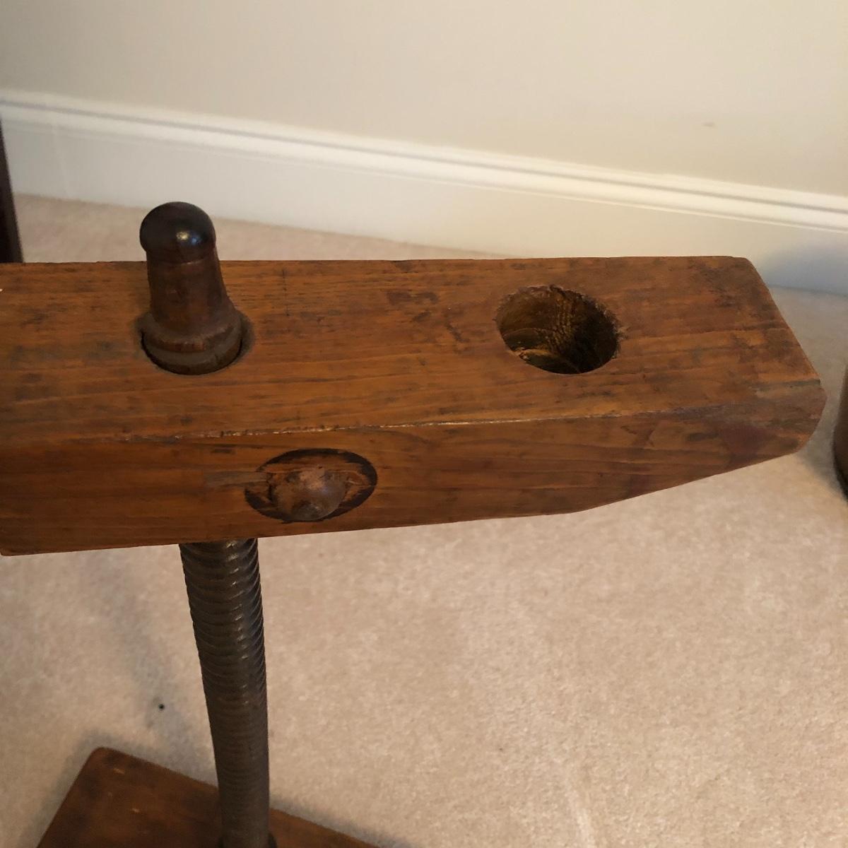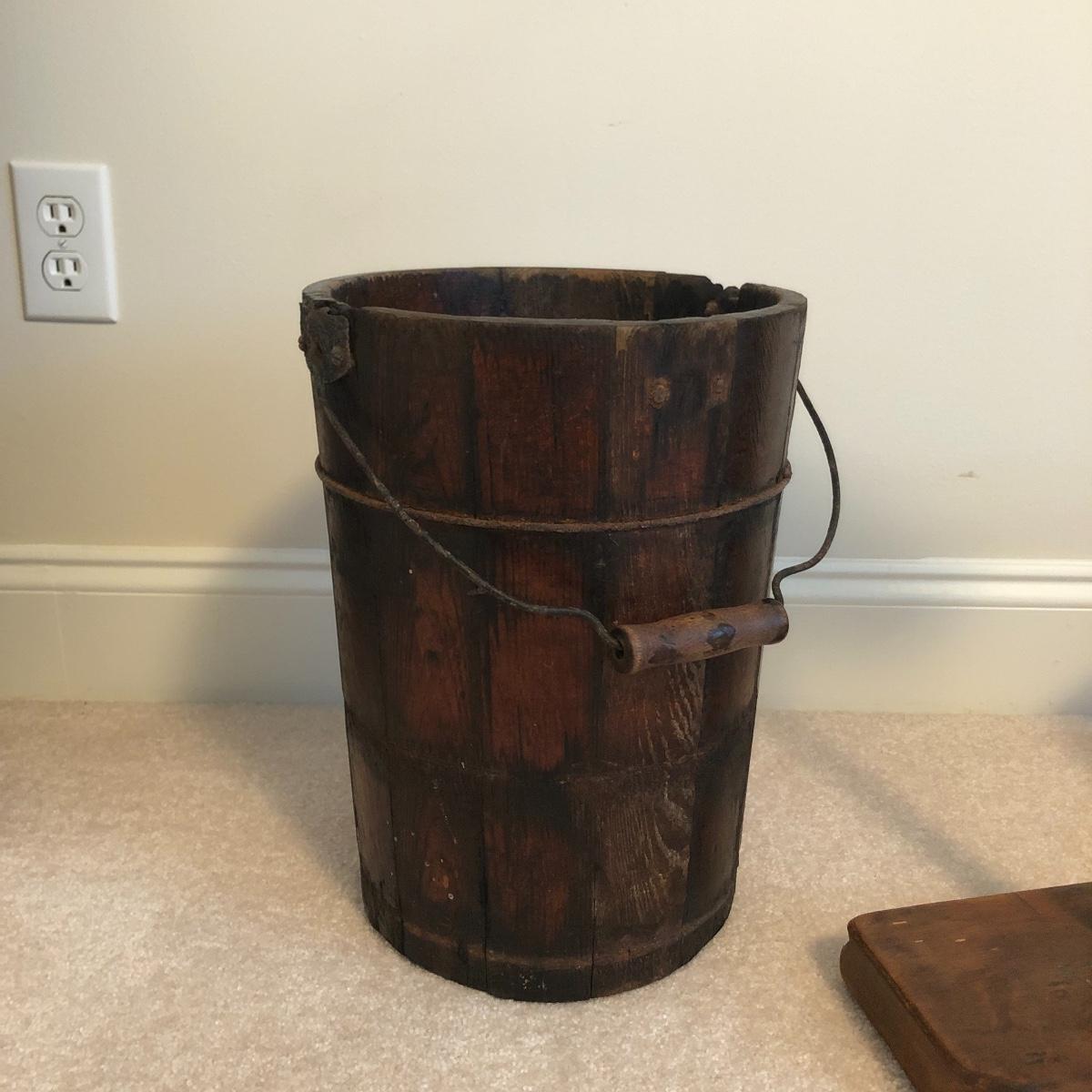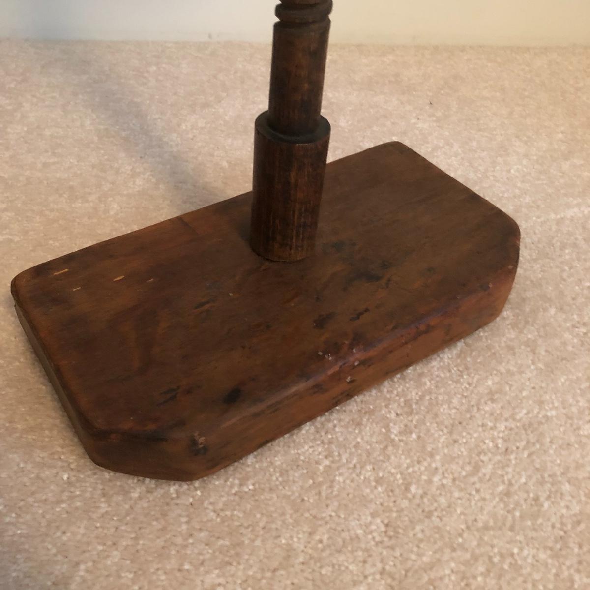 Four wood items in this lot that includes some sort of retort stand, a bucket, a butter press and the 4th item which may not be antique unlike all the other items, is a wood and metal container that would make a great plant or faux floral arrangement holder.