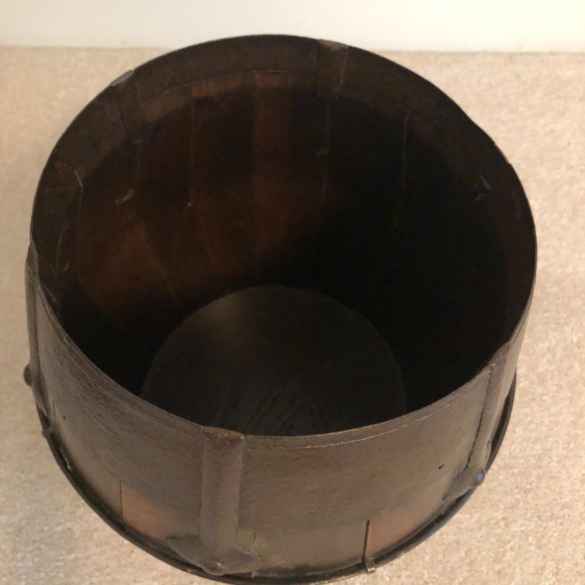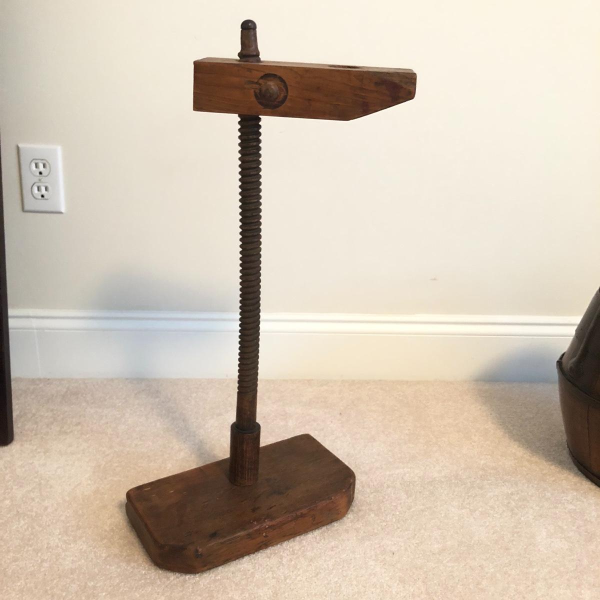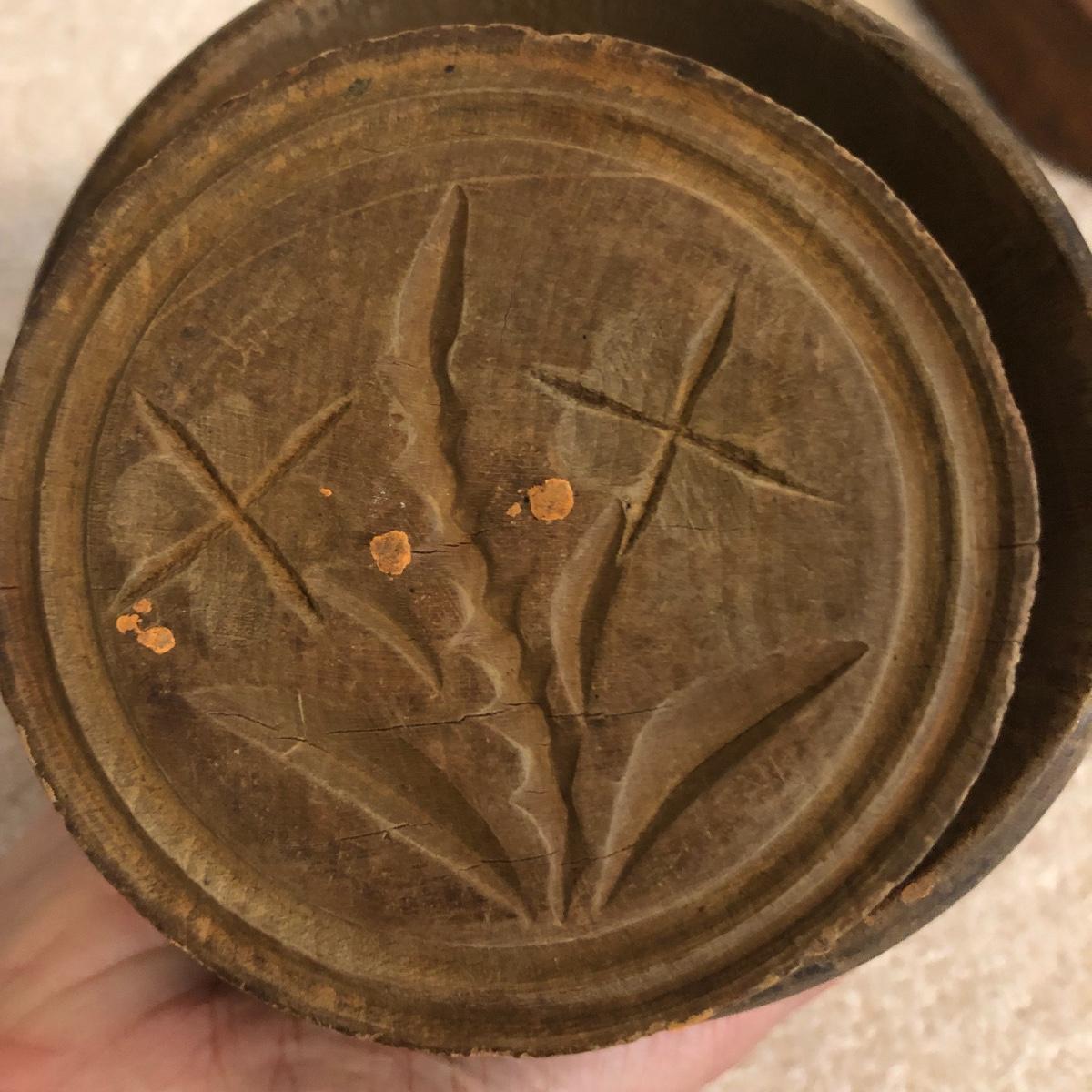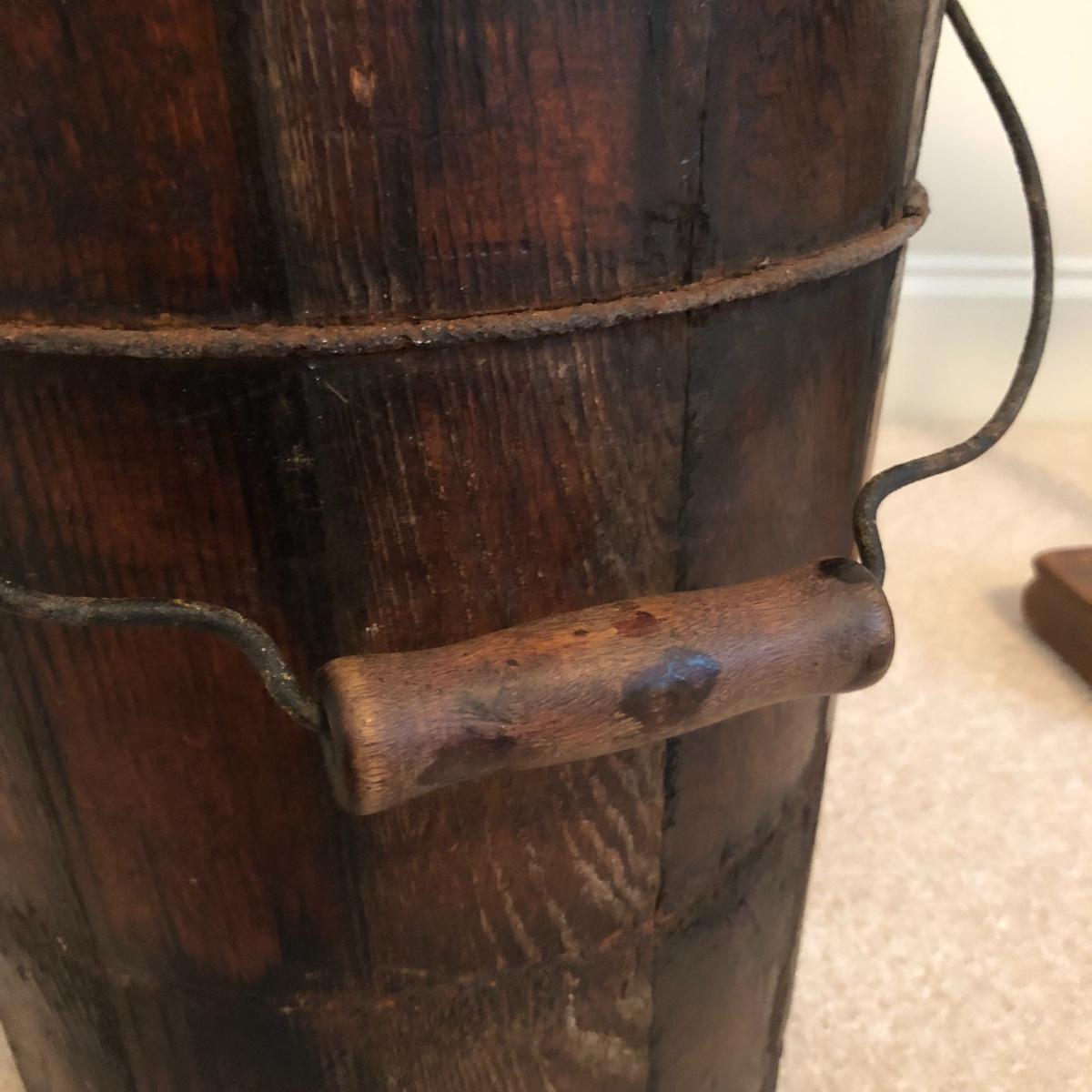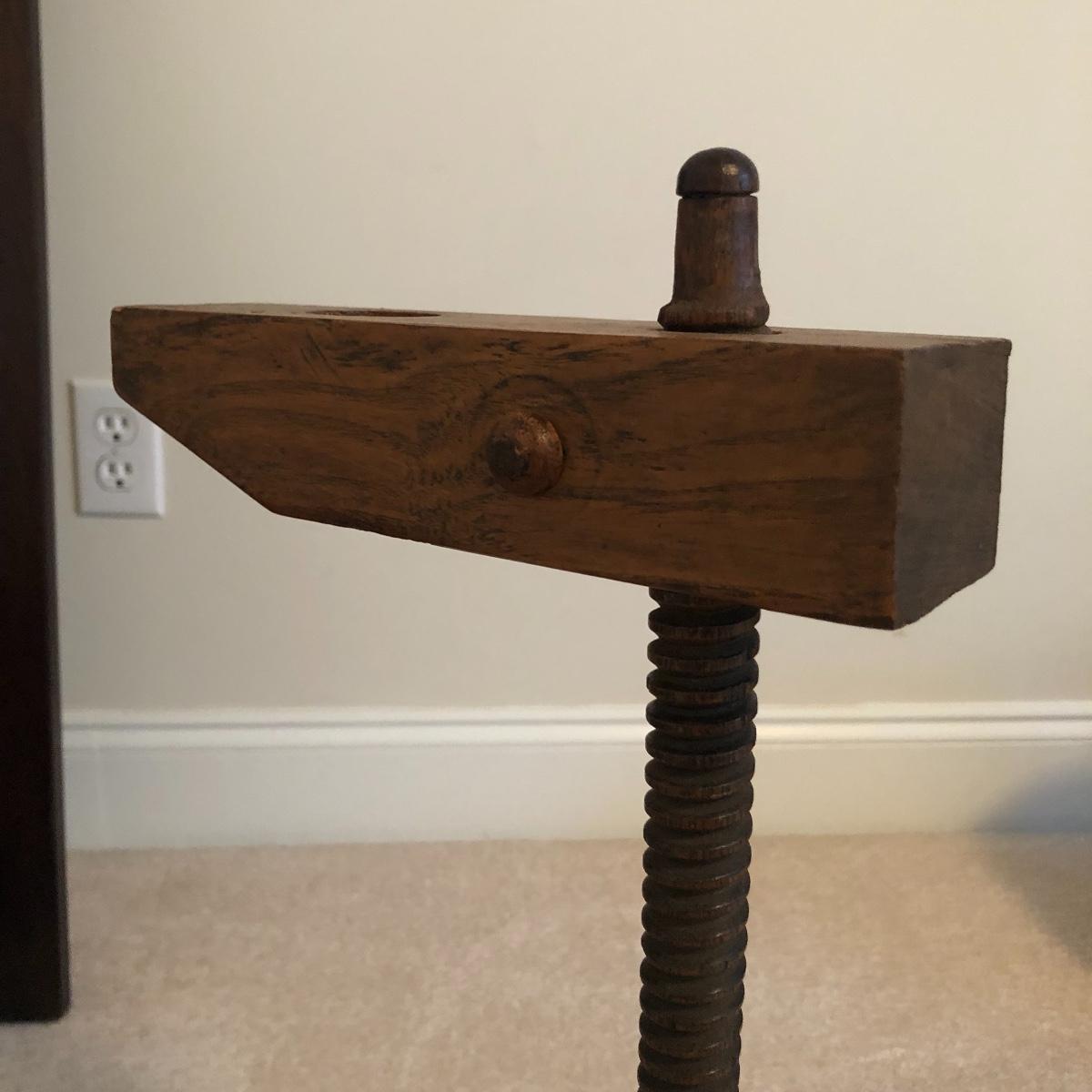 Four wood items in this lot that includes some sort of retort stand, a bucket, a butter press and the 4th item which may not be antique unlike all the other items, is a wood and metal container that would make a great plant or faux floral arrangement holder.