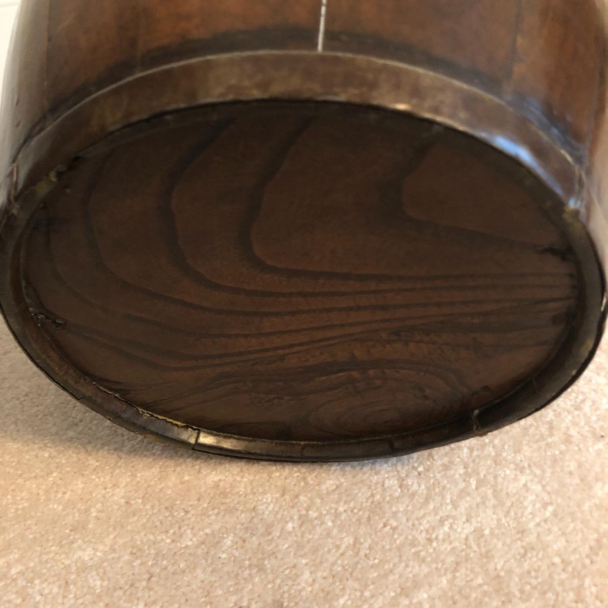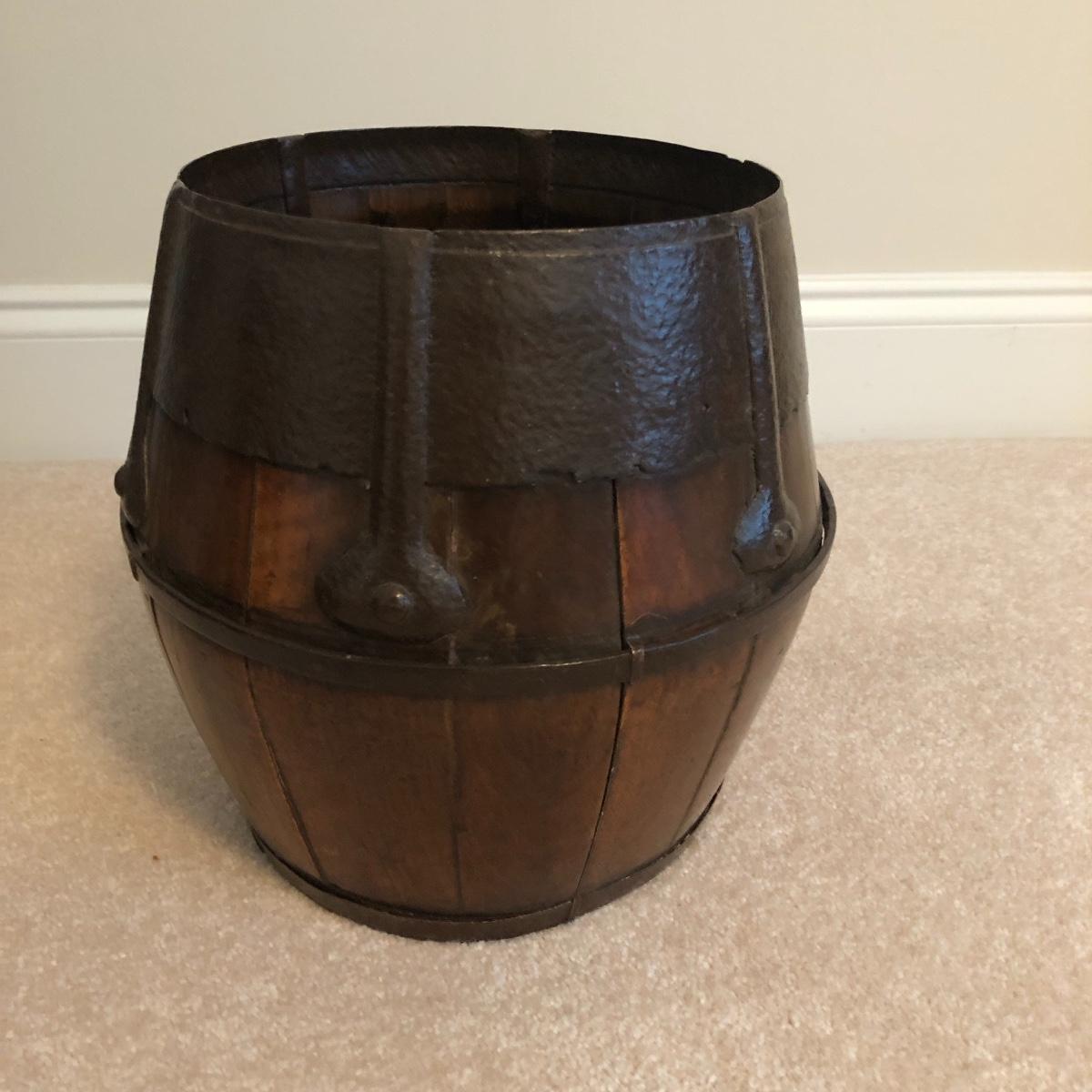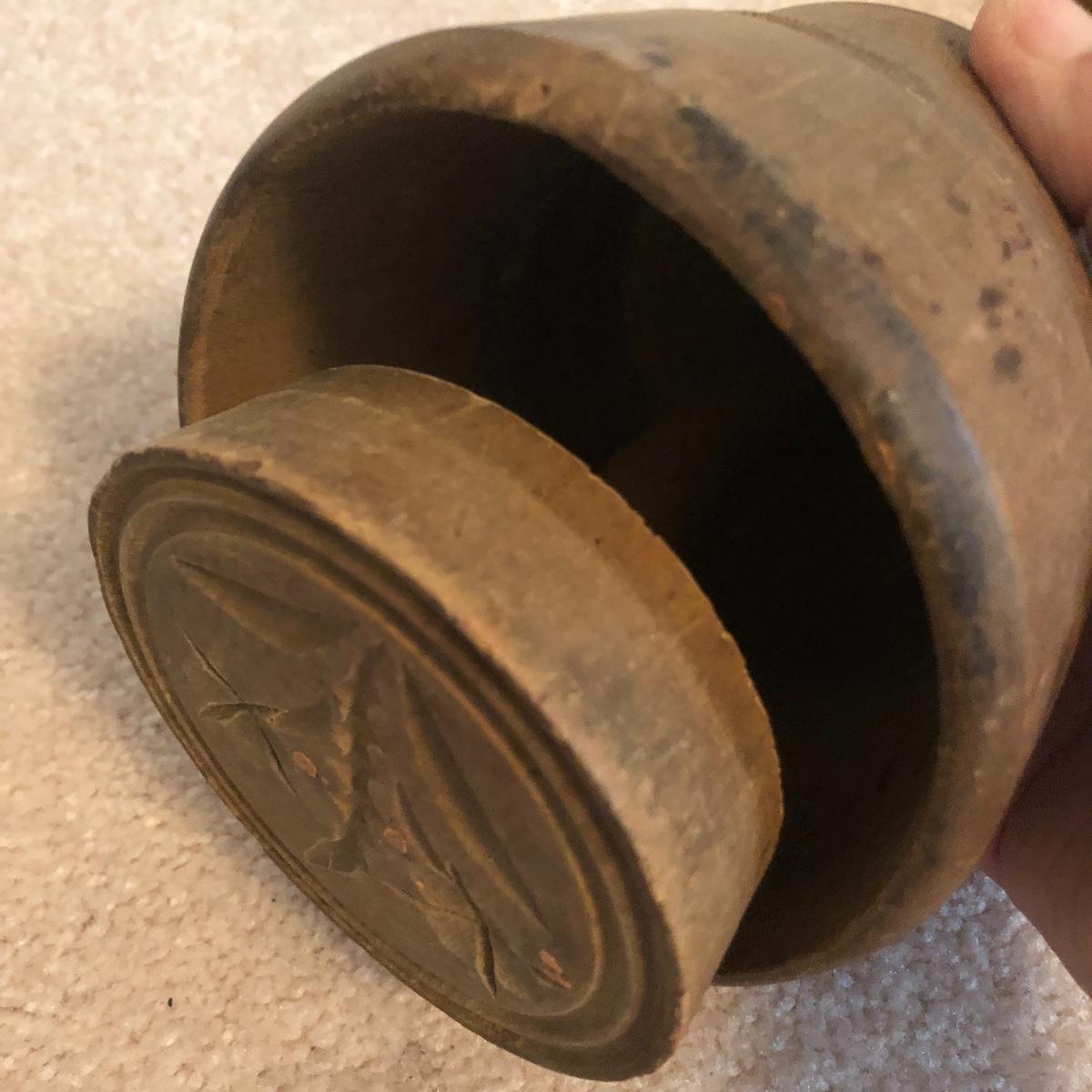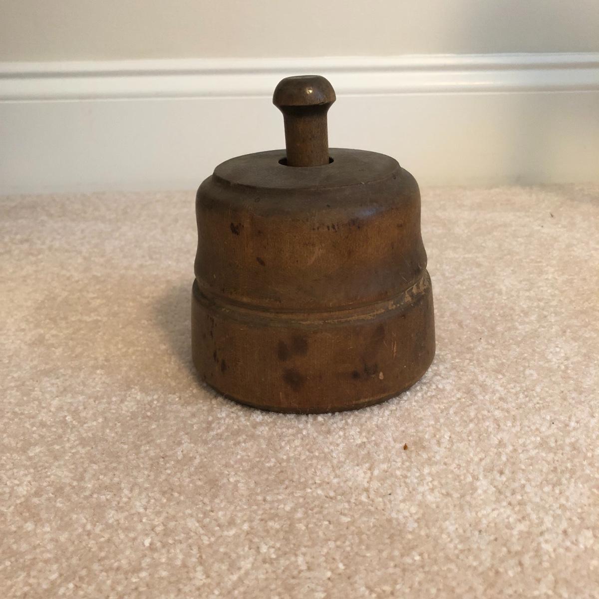 Four wood items in this lot that includes some sort of retort stand, a bucket, a butter press and the 4th item which may not be antique unlike all the other items, is a wood and metal container that would make a great plant or faux floral arrangement holder.