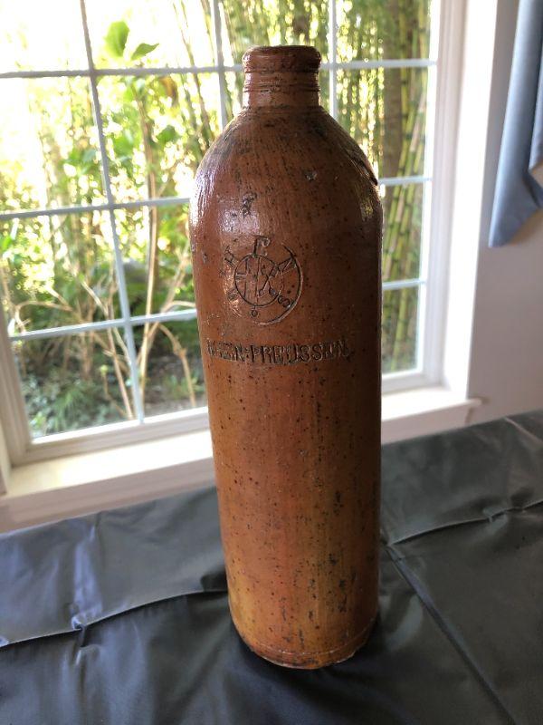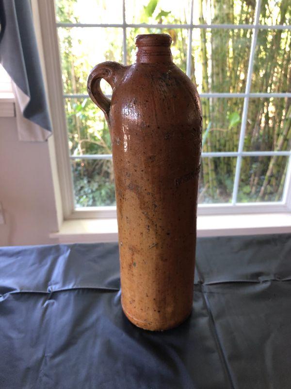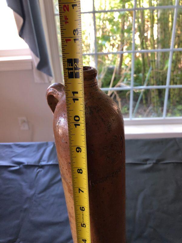Antique 1800s Rhein Preussen German Stoneware Jug Bottle with handle. A rare historical find! In very good condition, with signs of wear from age (shown in photos).