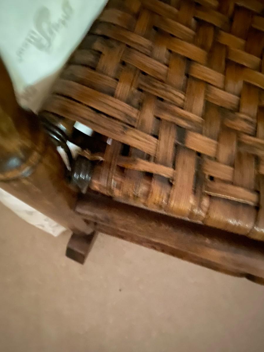 Rush seat and back. Some damage to corner of seat.