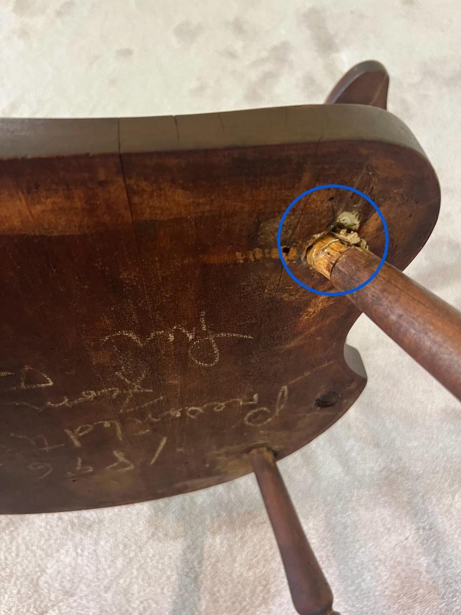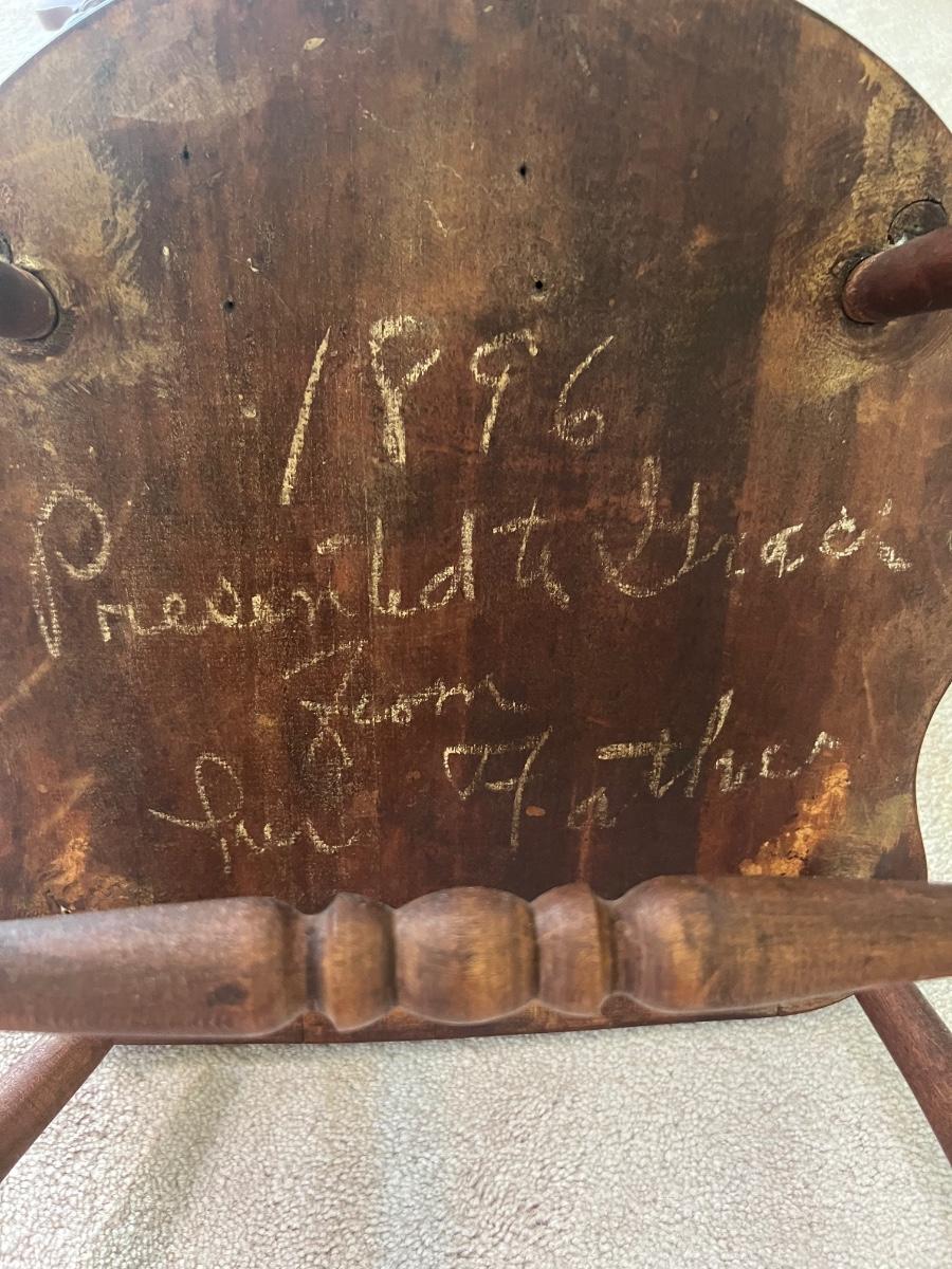 This antique rocking chair Was given as a gift and 1896! How cool! Measures 33 inches tall, 24 inches at its widest and 29 inches deep Floor to seat at 14 inches. One leg underneath looks to be loose. See pictures.