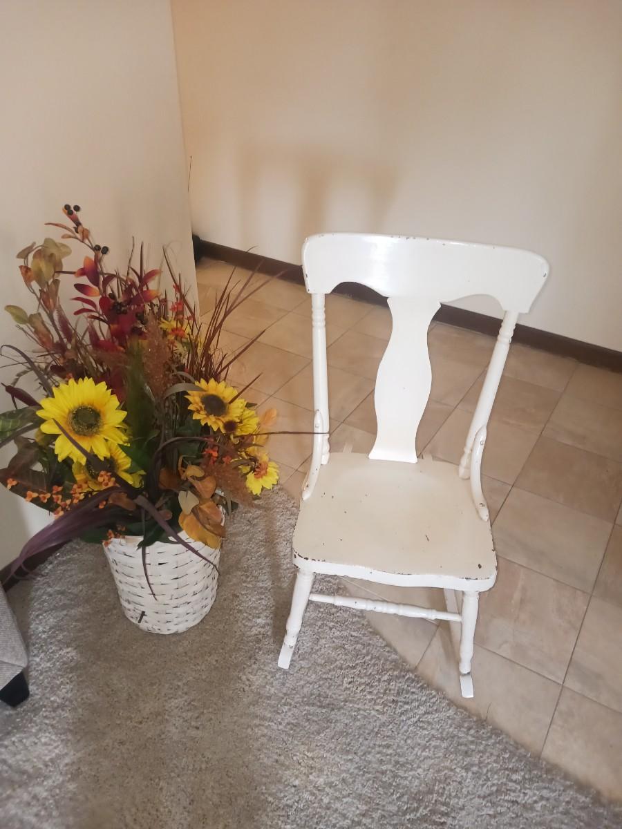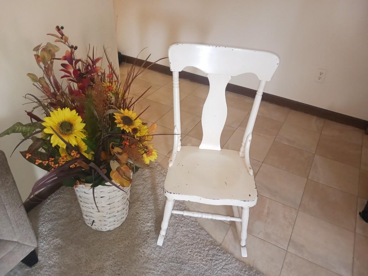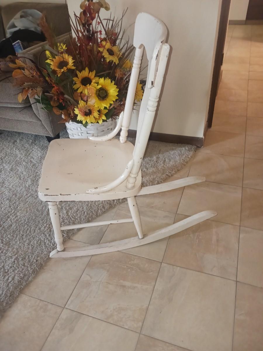 ANTIQUE ROCKING CHAIR AND FAUX FLOWERS IN A VASE