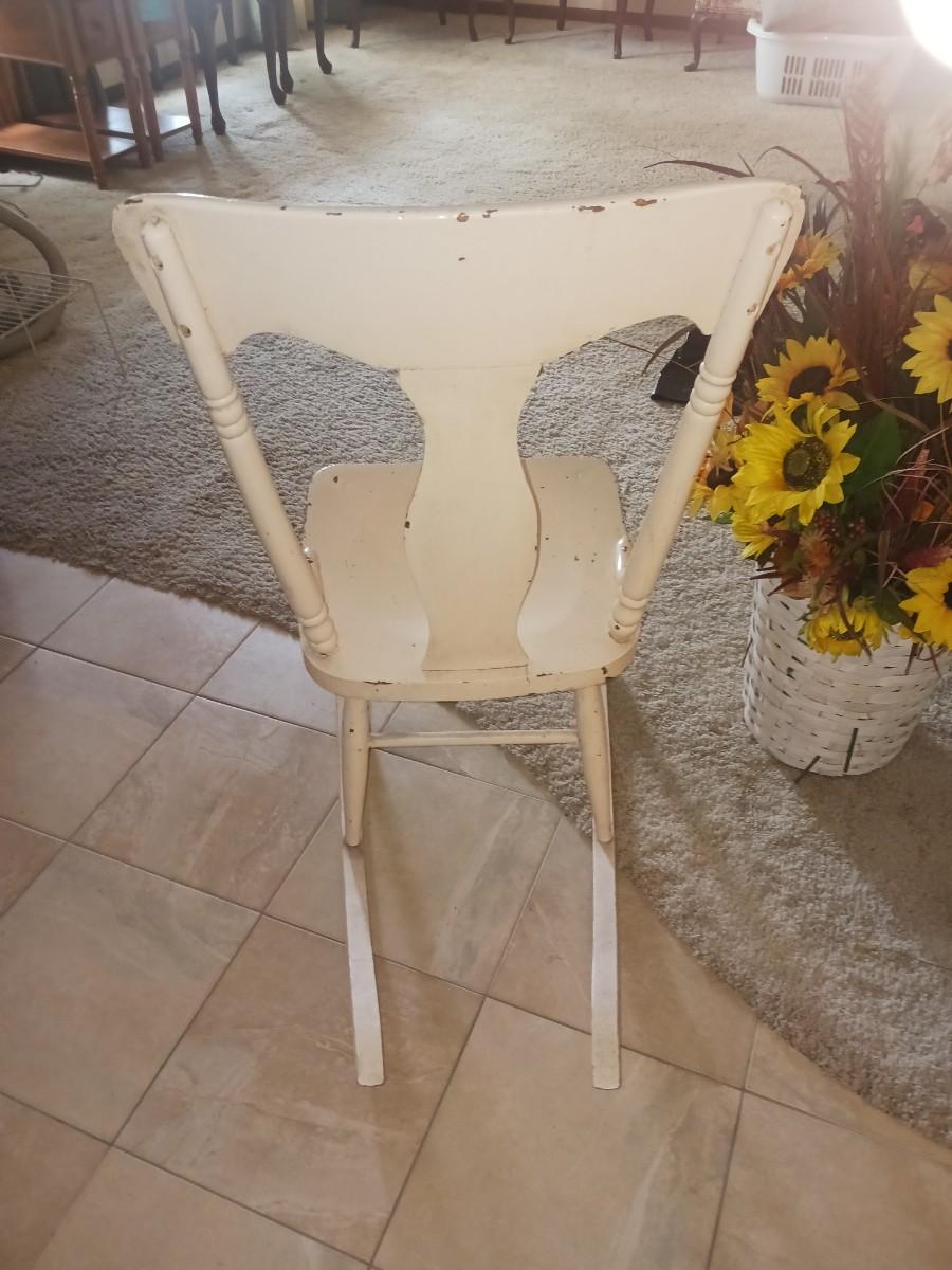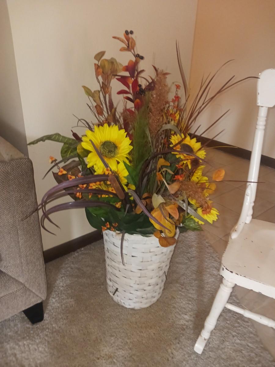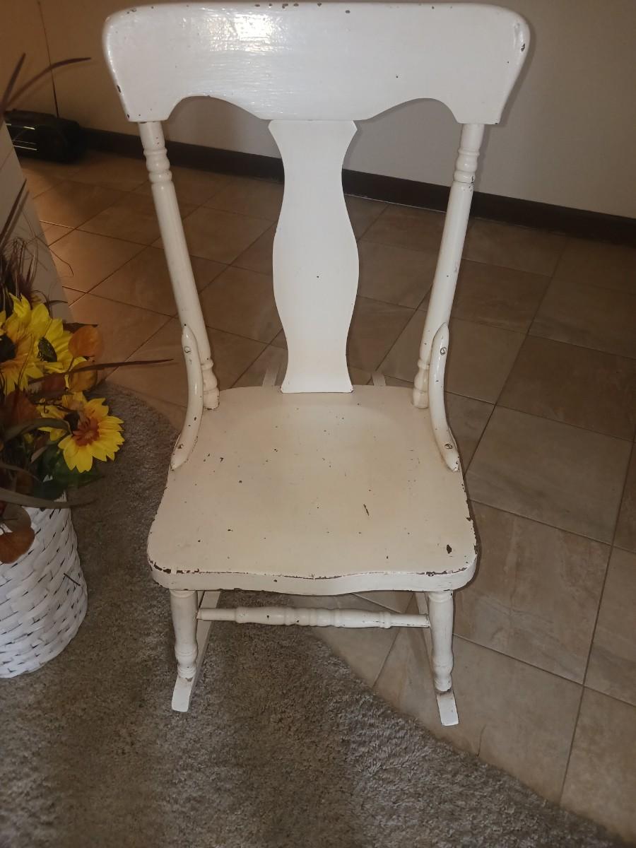 ANTIQUE ROCKING CHAIR AND FAUX FLOWERS IN A VASE