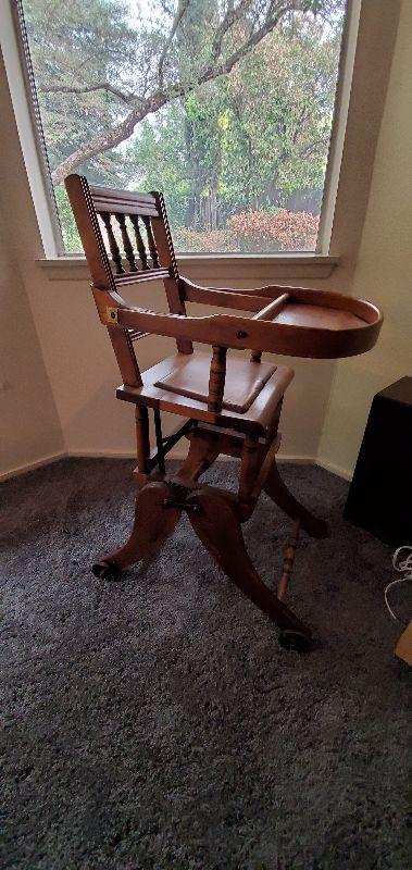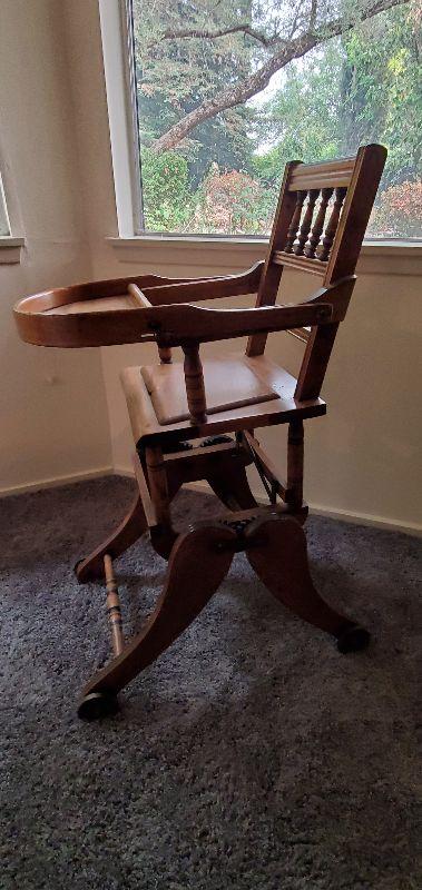 Sweet, rare find! This highchair converts to a child's rocker. In its highest position it measures 38" tall, 20" deep and 14" wide.