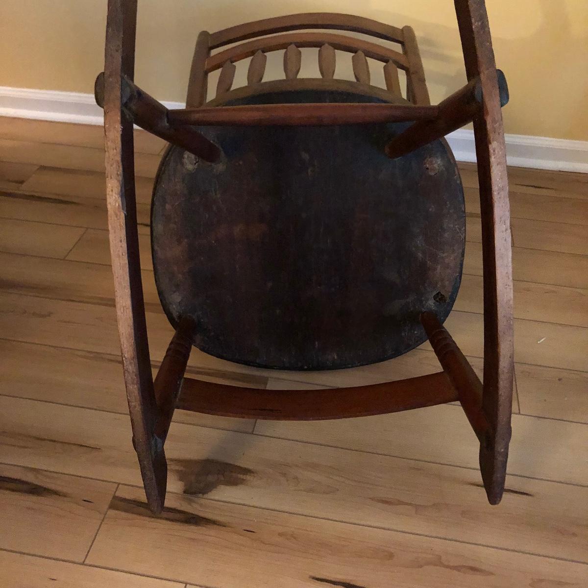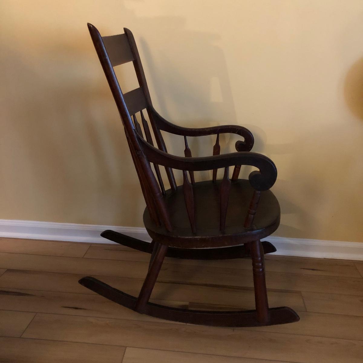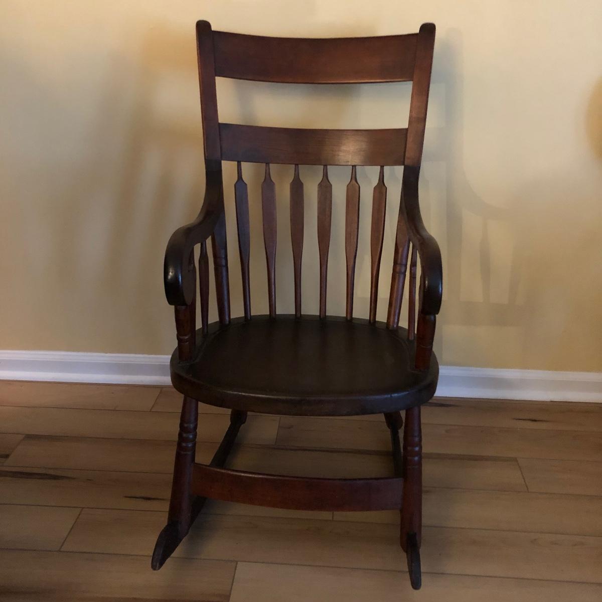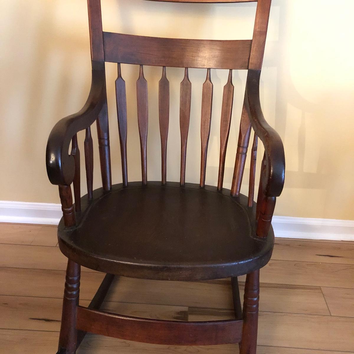 Lot includes an antique wooden rocking chair. Chair has some nicks and scratches, but is in overall good shape and very sturdy. Chair measures 19” x 31” x 38” with a 16” seat height.