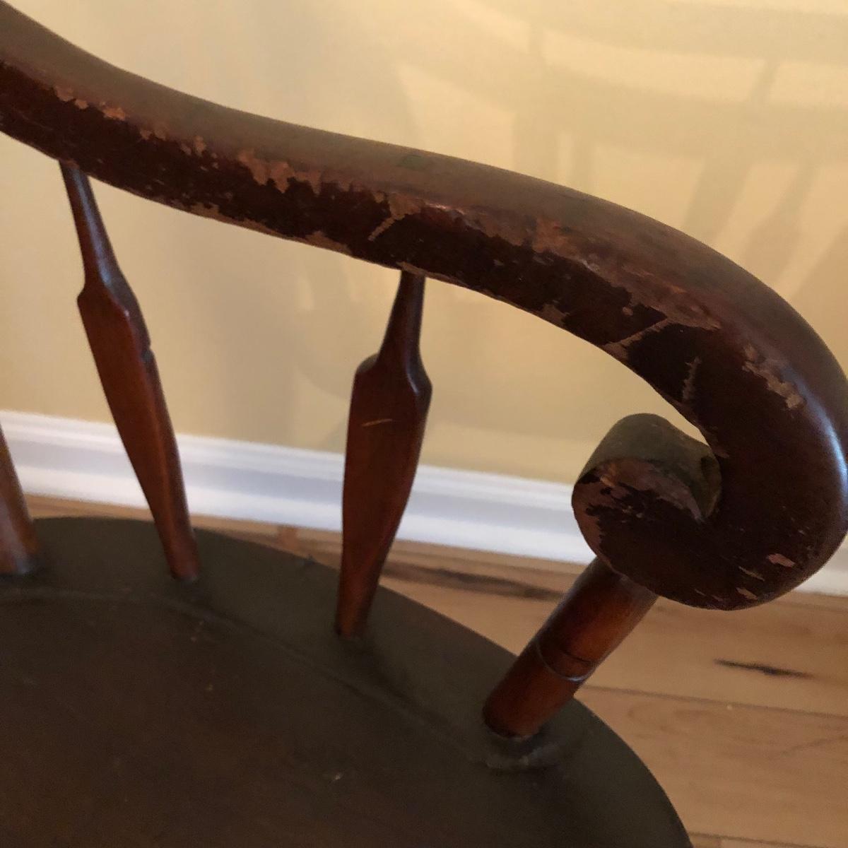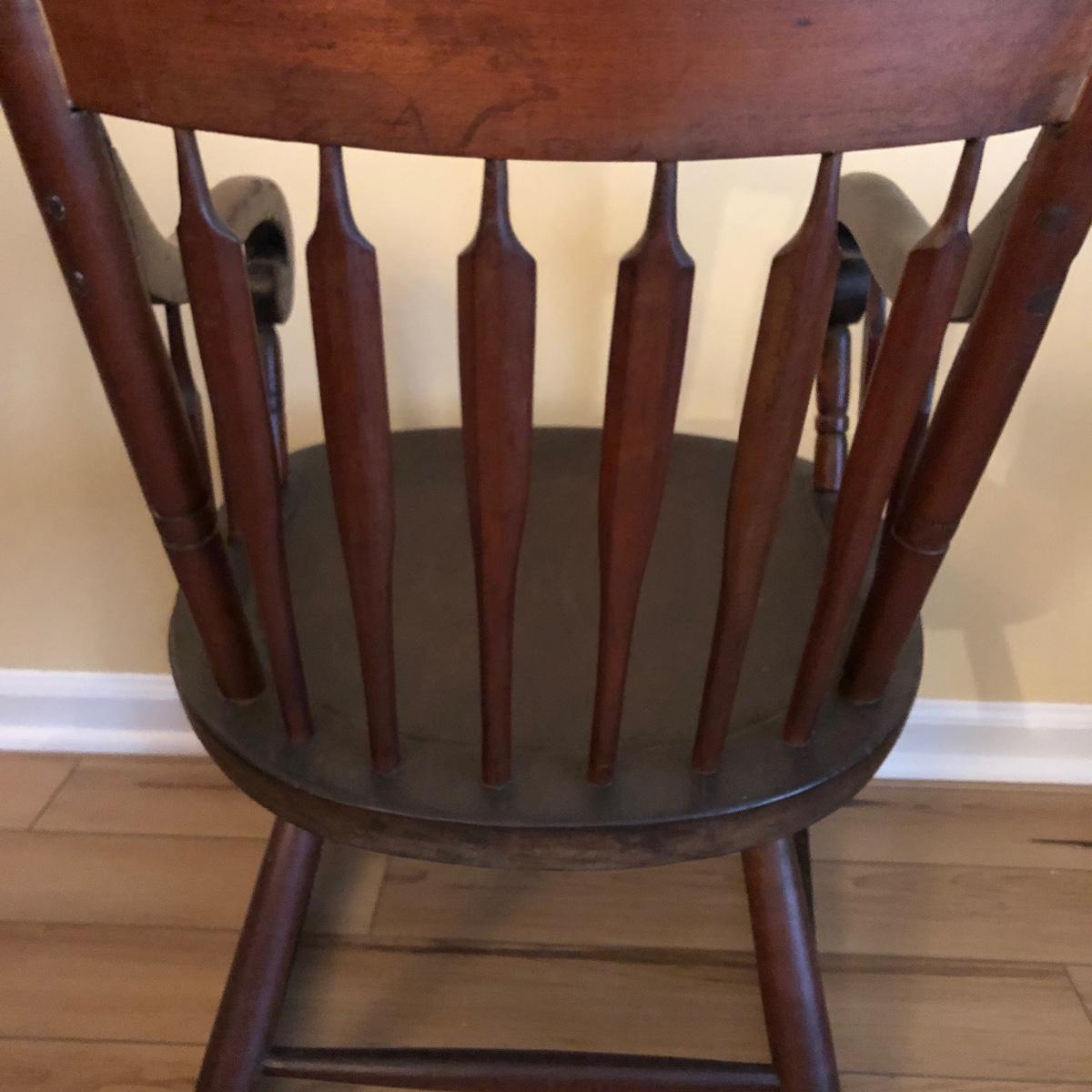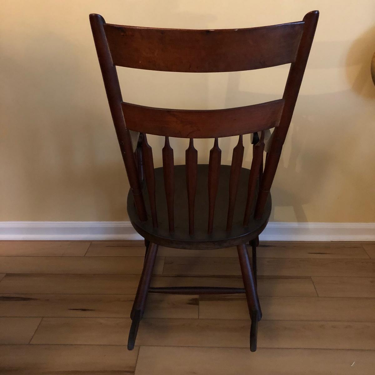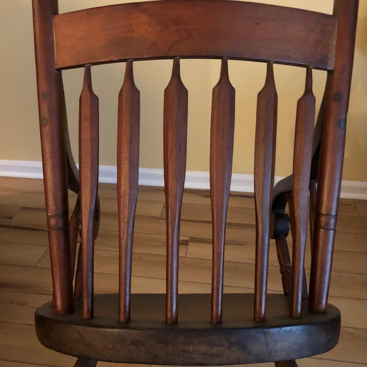 Lot includes an antique wooden rocking chair. Chair has some nicks and scratches, but is in overall good shape and very sturdy. Chair measures 19” x 31” x 38” with a 16” seat height.