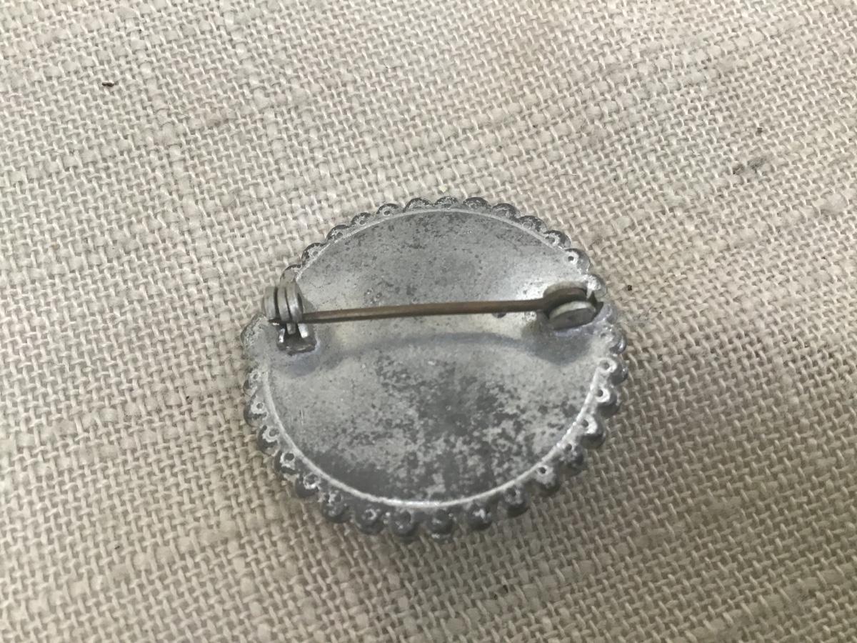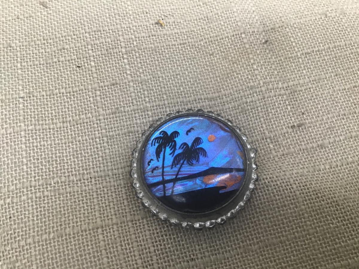 Antique Round Silver Morpho Butterfly Wing Brooch w/ Palm Tree Silhouette Scene