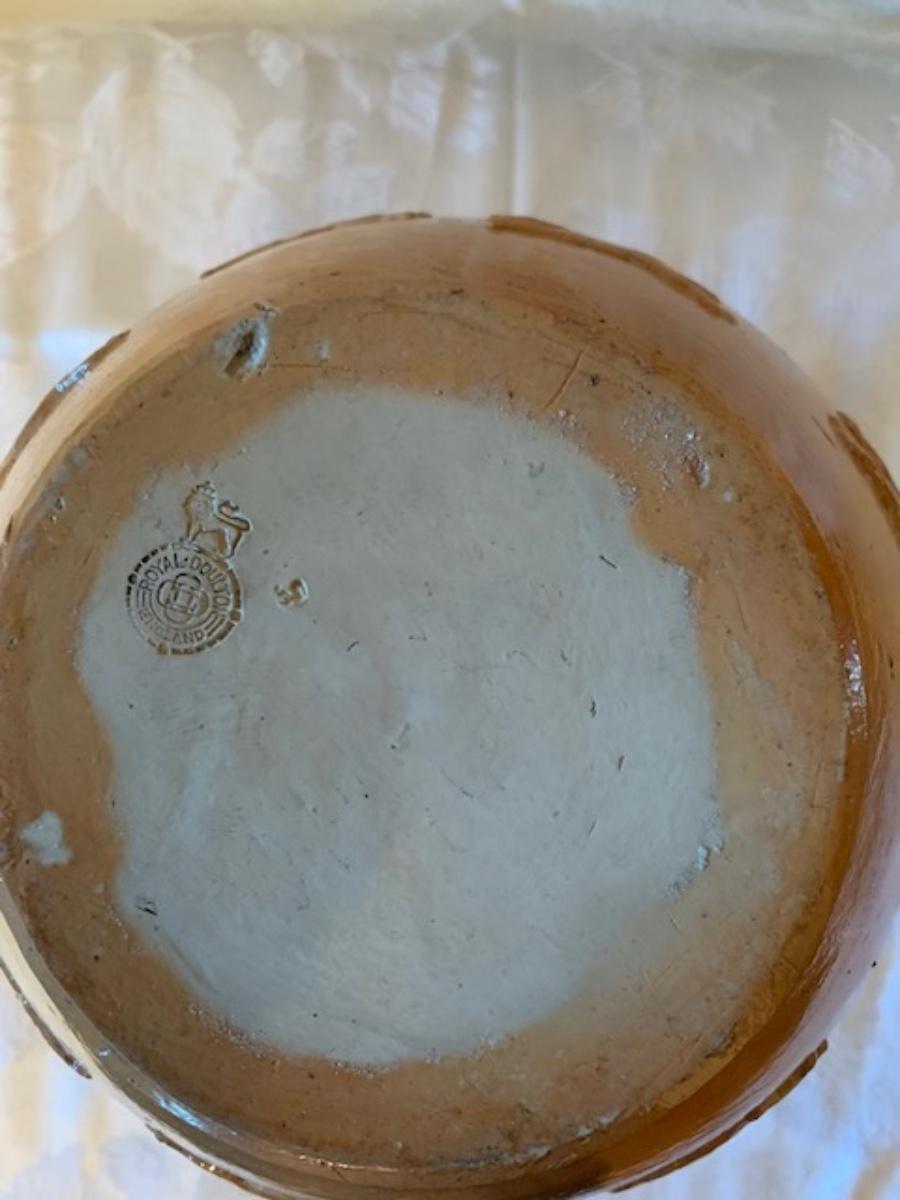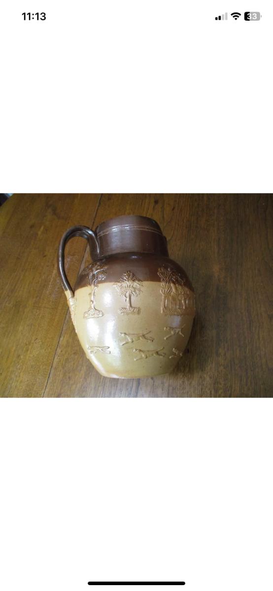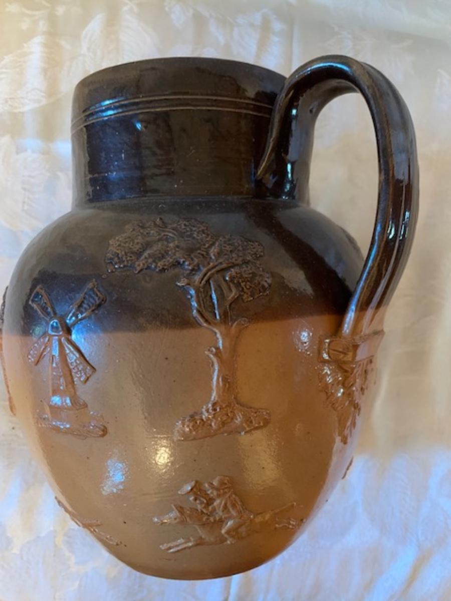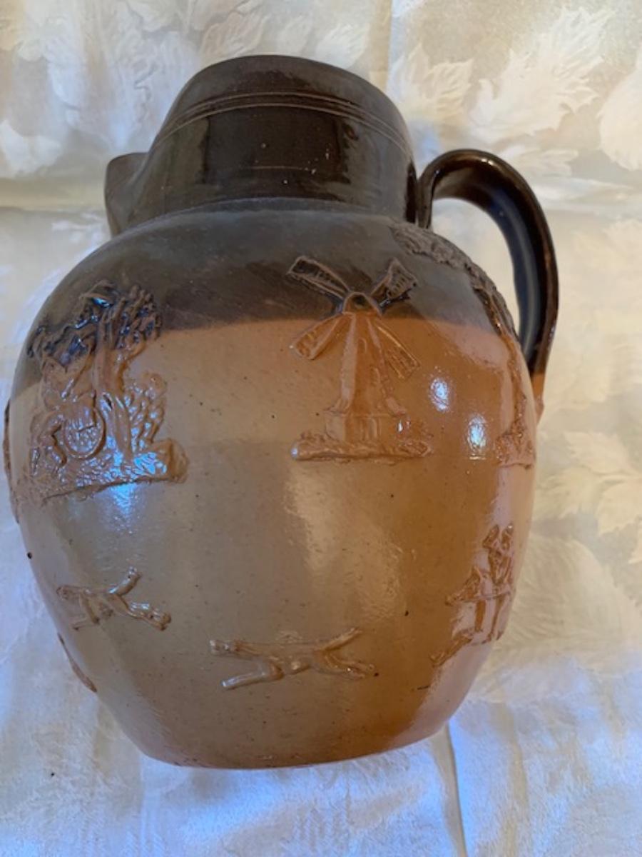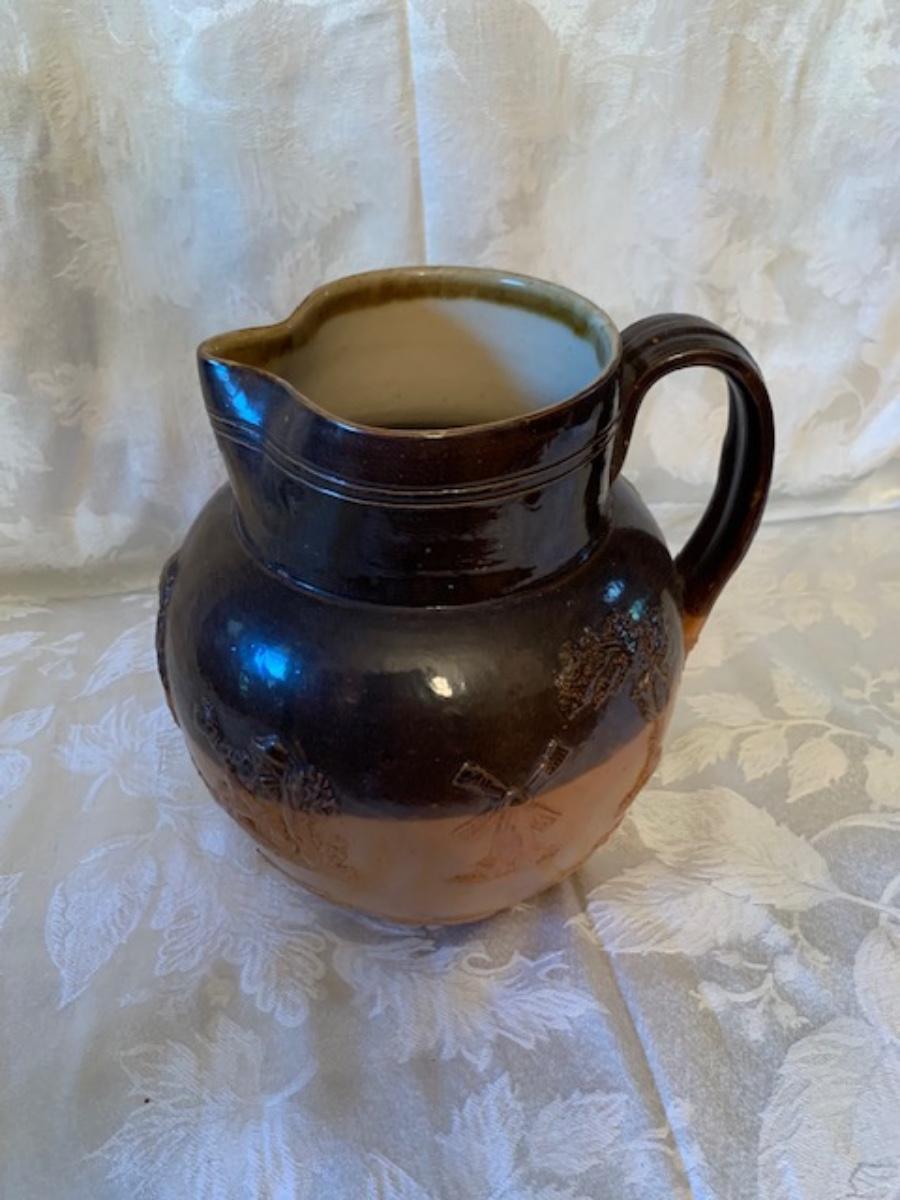 Antique Royal Doulton salt glazed embossed stoneware pitcher. 19th Century. 10”H