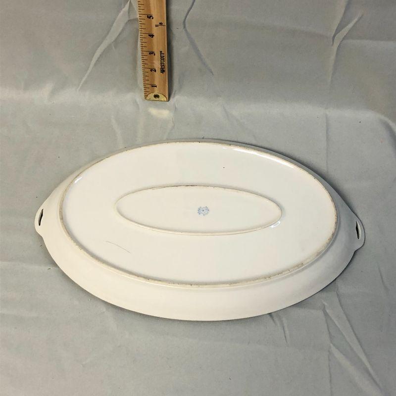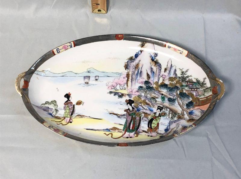 Royal Kaga Nippon was produced between 1890-1921. This tray is in excellent condition with just a little gold paint wear on the handles. It is approximately 14" x 8.5".