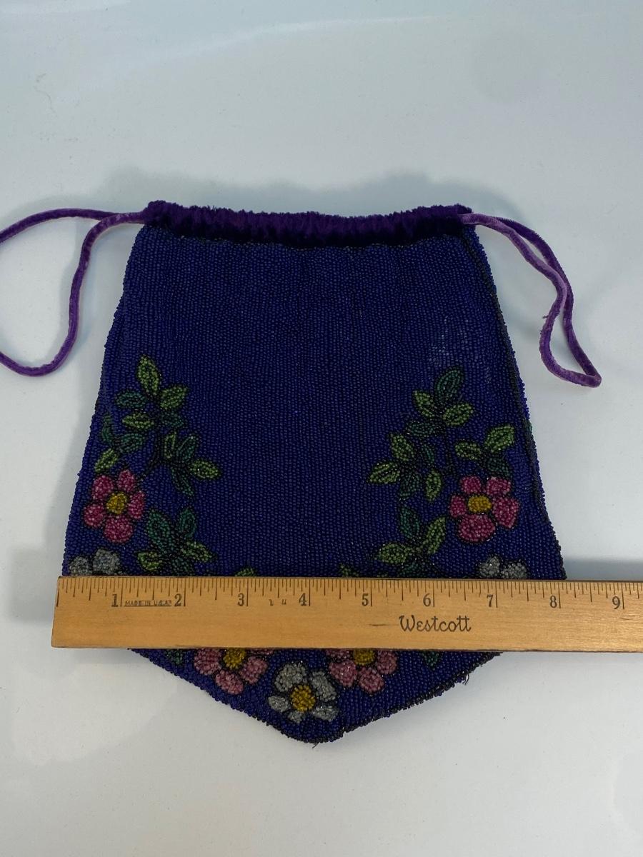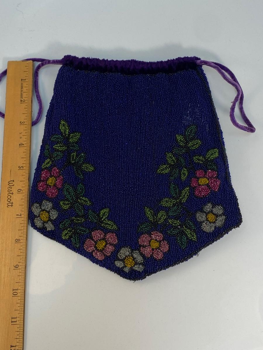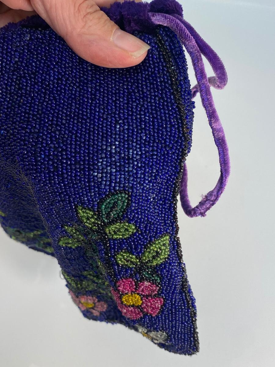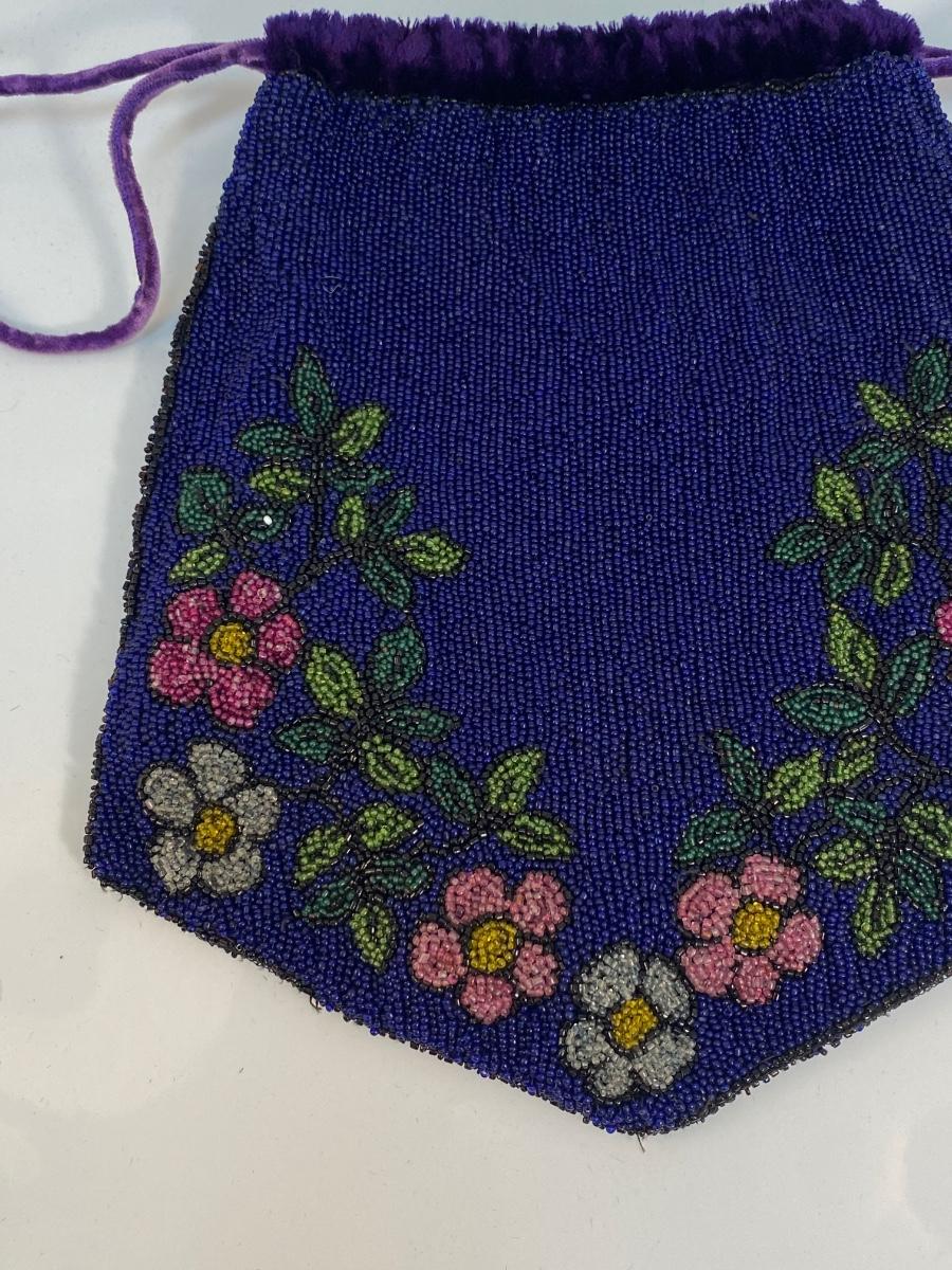 Antique Royal Purplish Blue Micro Bead Drawstring Purse Floral Design Velvet Lining. Stunning glass bead design, rich colors. Velvet lining with drawstring close. Nice size. No holes.