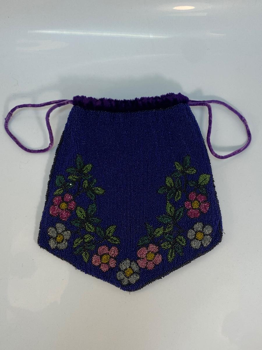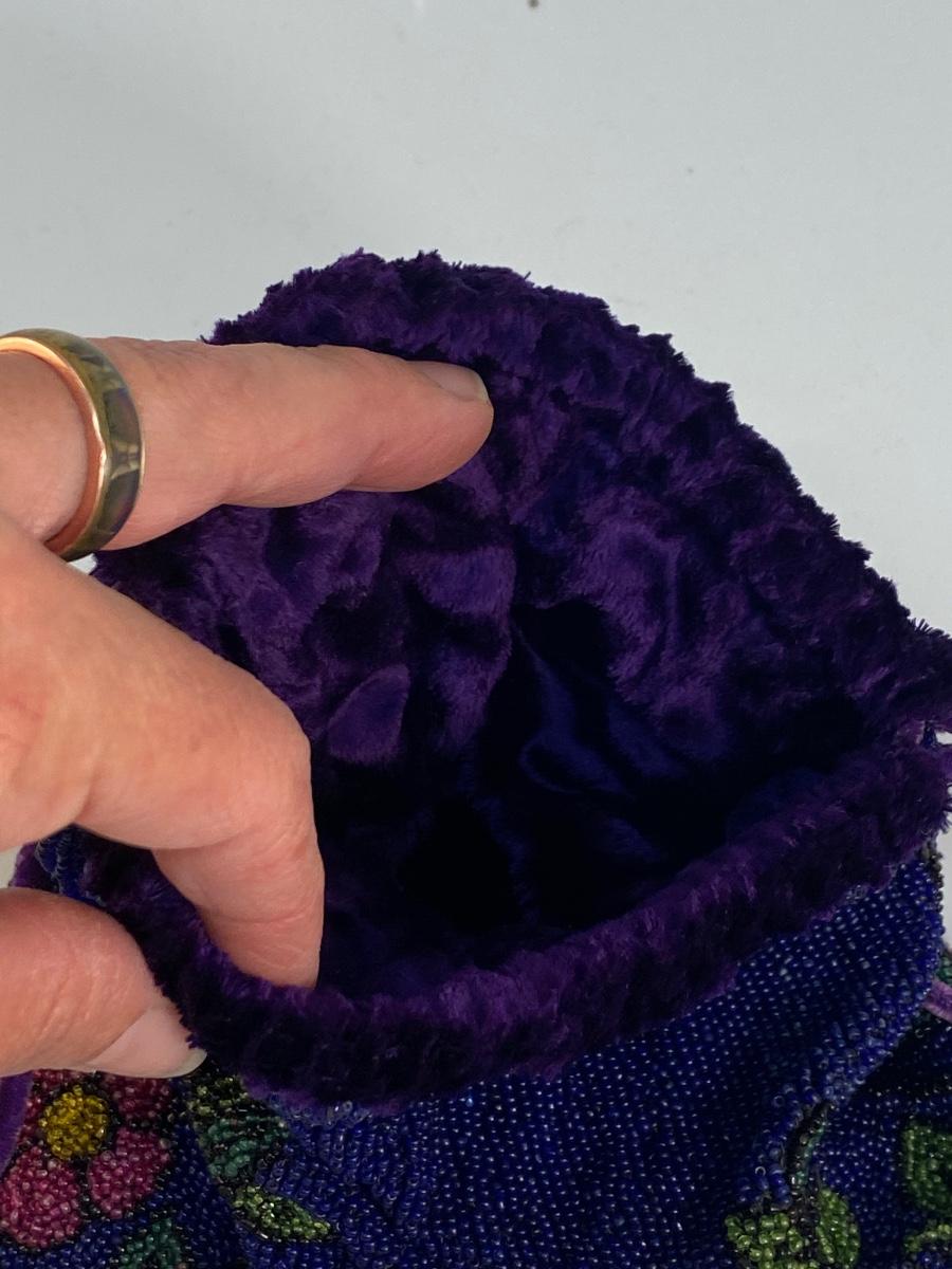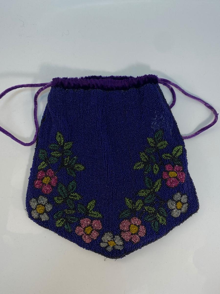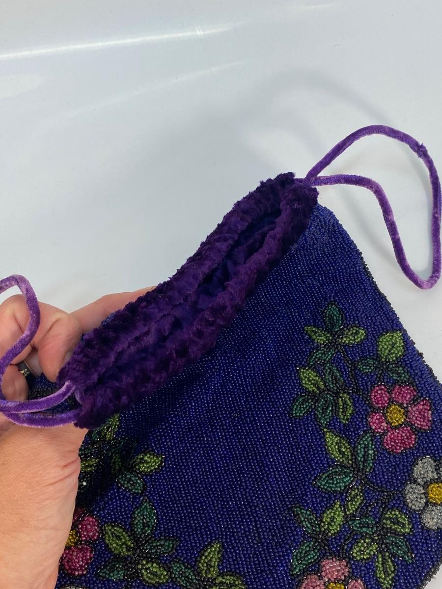 Antique Royal Purplish Blue Micro Bead Drawstring Purse Floral Design Velvet Lining. Stunning glass bead design, rich colors. Velvet lining with drawstring close. Nice size. No holes.