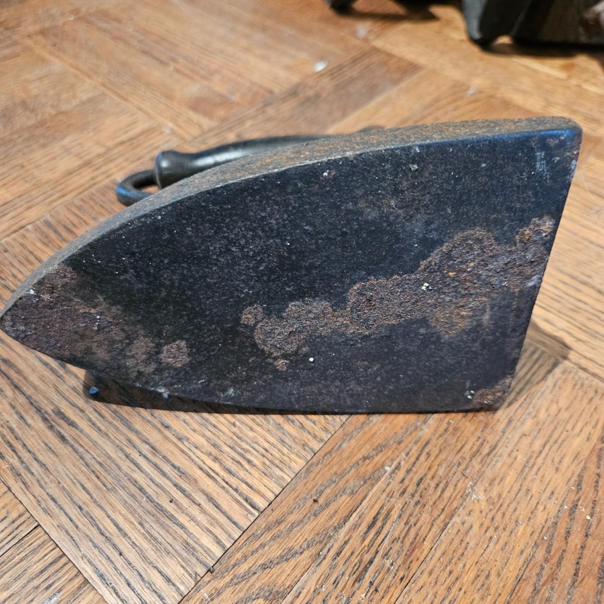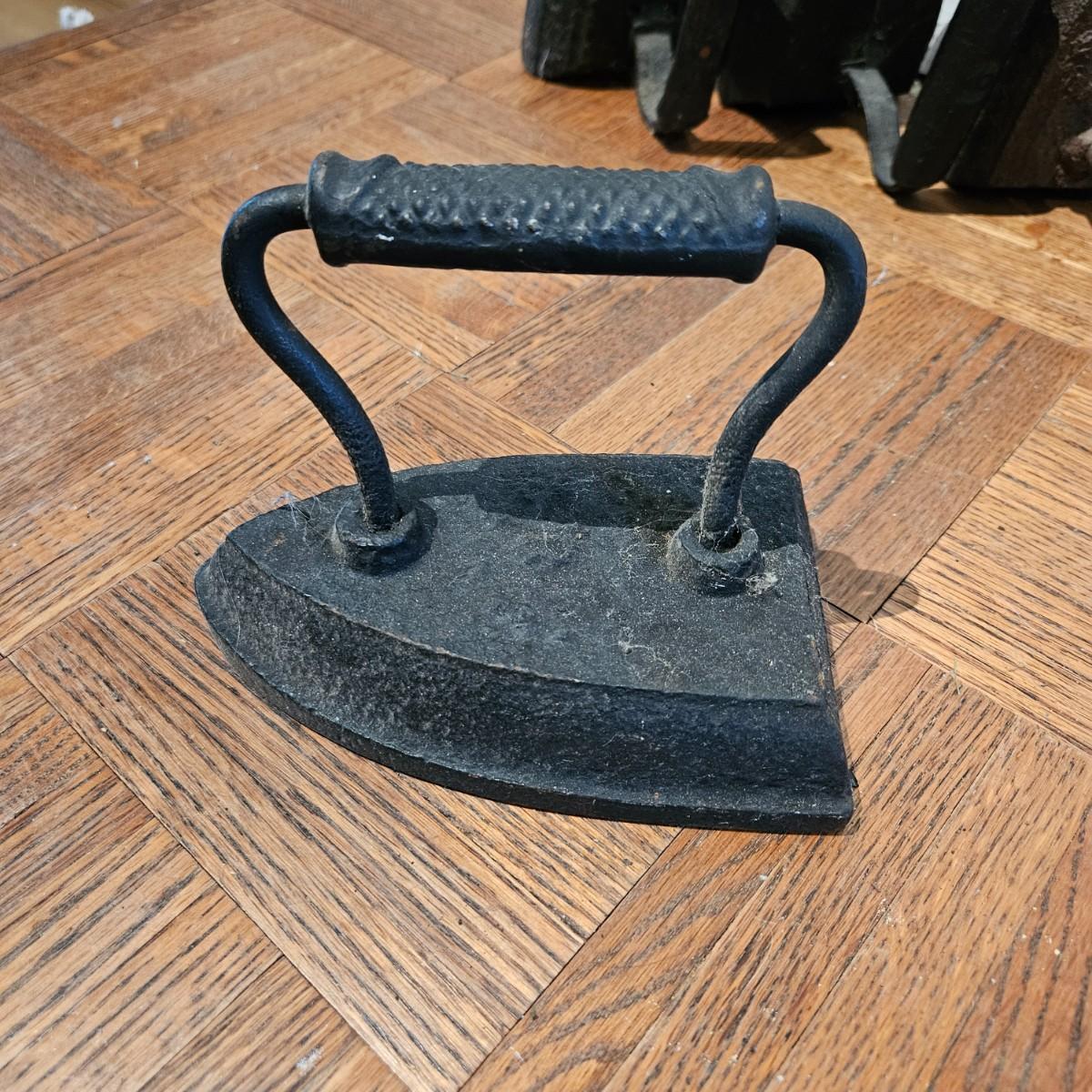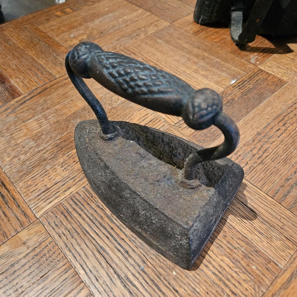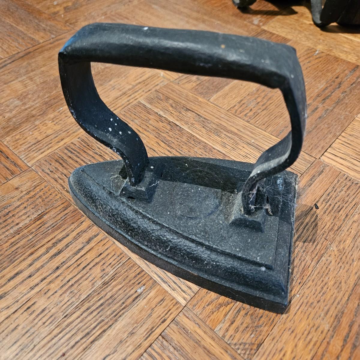 A collection of seven sadirons that appear to be cast iron. One is missing its handle and some are showing rust. They measure approximately 6.5" x 4" x 5"H. Please see photos for details. Local pickup only