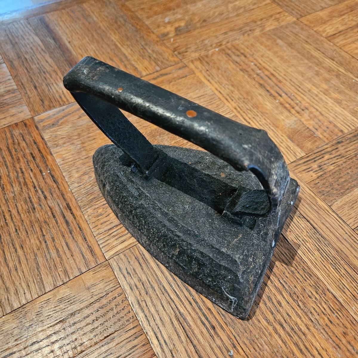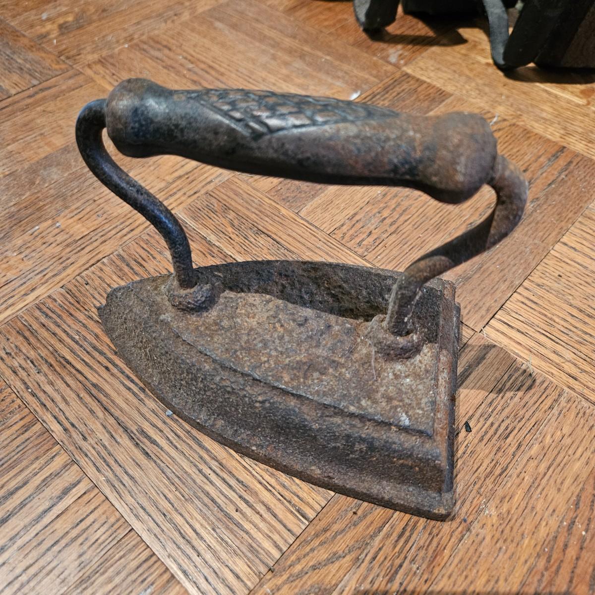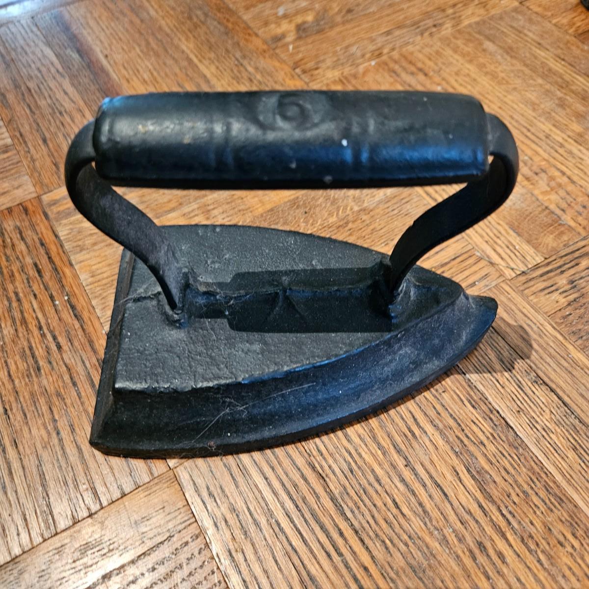 A collection of seven sadirons that appear to be cast iron. One is missing its handle and some are showing rust. They measure approximately 6.5" x 4" x 5"H. Please see photos for details. Local pickup only