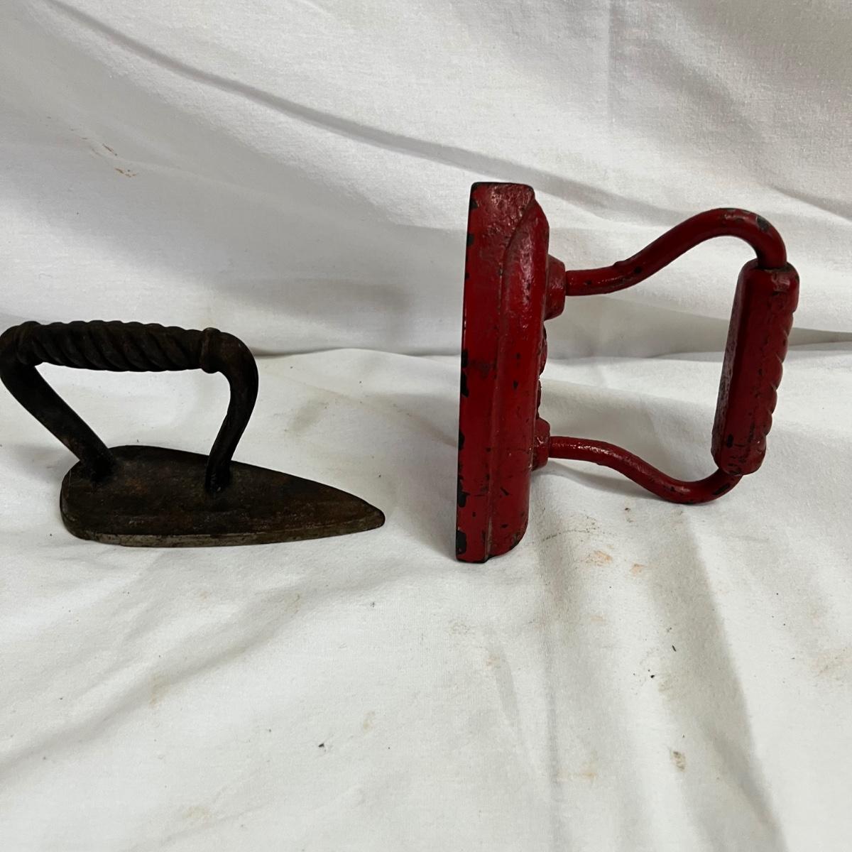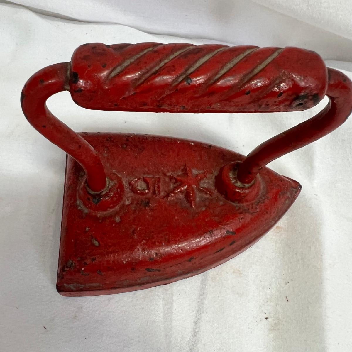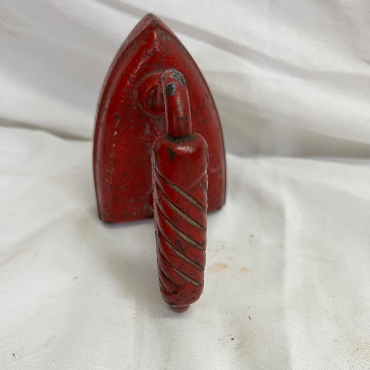 Three sadirons. The red one measures approximately 3.5” x 4.5” x 5.5”H.