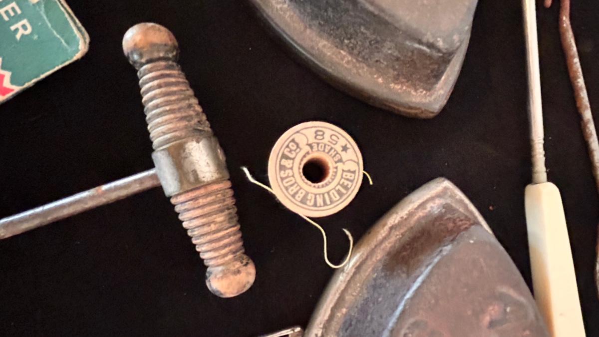 ANTIQUE SAD IRONS, THREAD SPOOLS, GUNNY SACK NEEDLES AND MORE