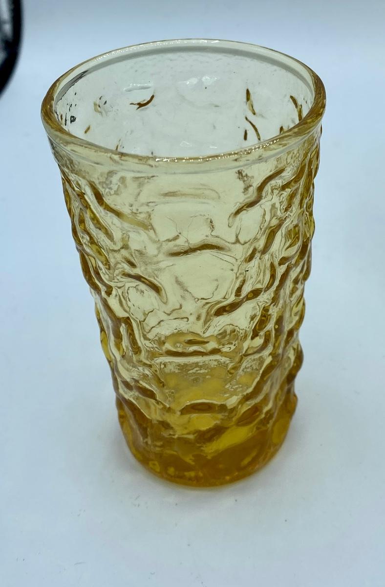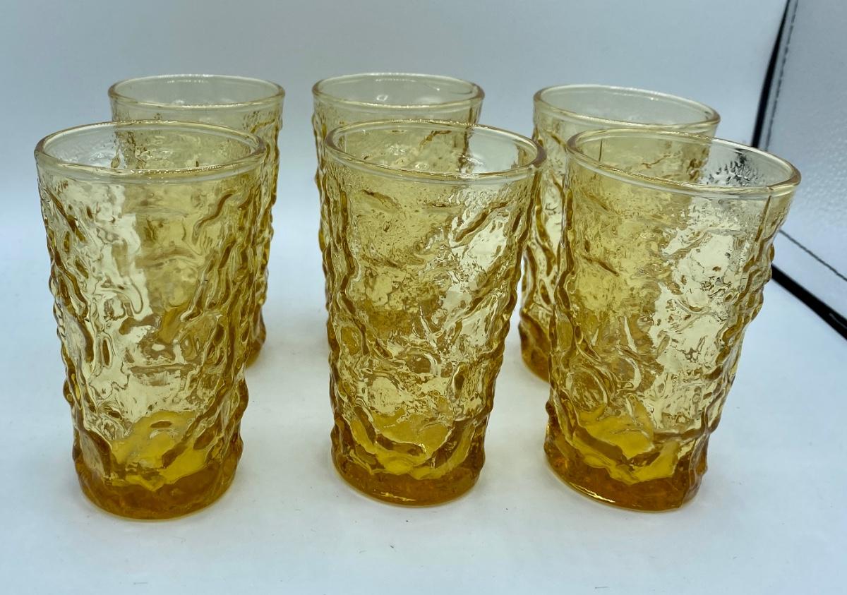 Set of SIX Libbey juice glasses in crinkle Aztec pattern, gold color .