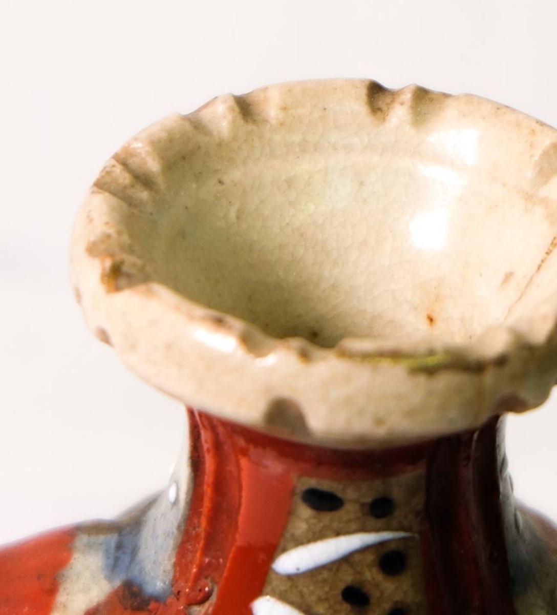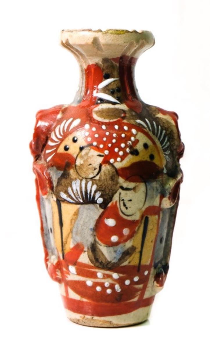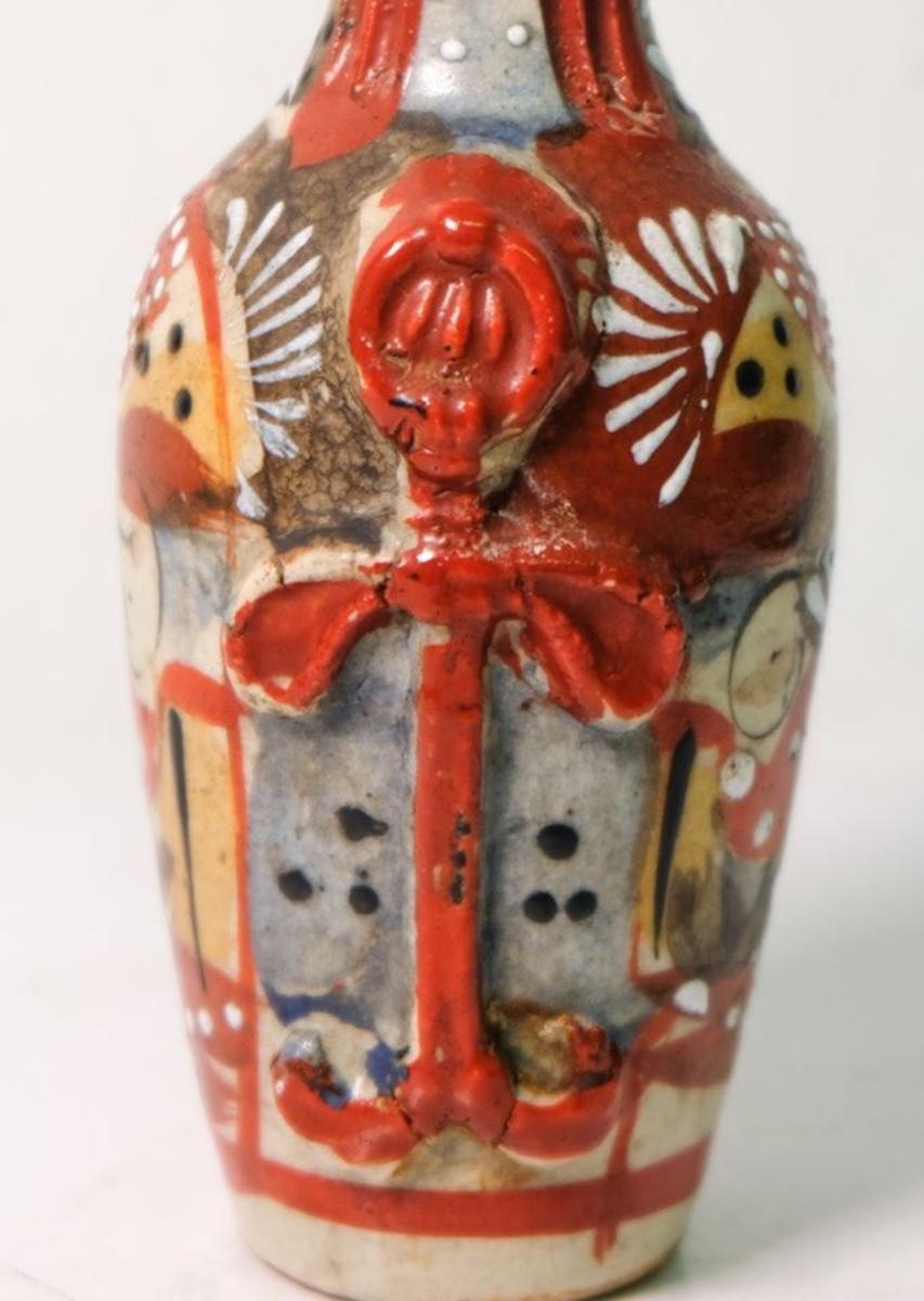 With raised motif & enamel decorated. Measures approx. 5" H, 2.5"W. Note: Has a visible stress crack on rim.