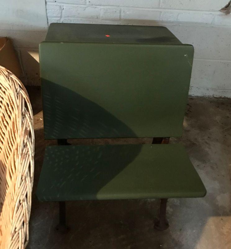 This sturdy cast iron and painted wood desk was made by American Seating Company. A.S. Co.s innovation was to attach one child's seat to the front of the desk occupied by the next child. Can be stripped and restored to its original beauty. 29 × 21 × 28. All items SOLD AS IS, AS SHOWN and subject to reserve bid. Unsold items will be relisted. Pick-Up only on Monday May 20th between 3-6 PM