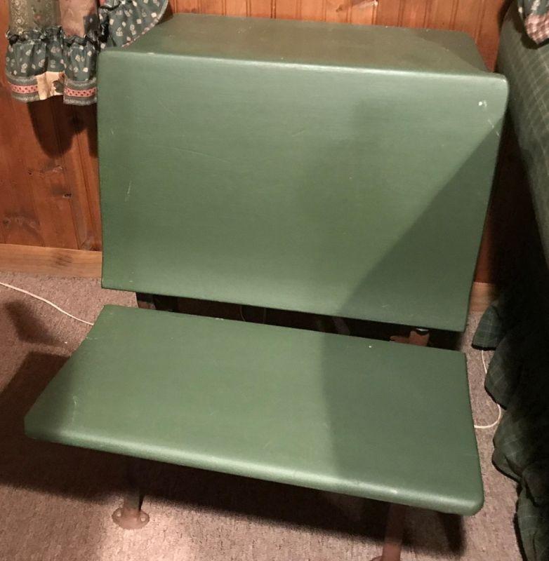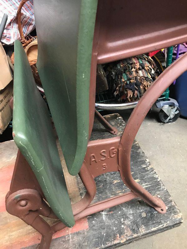 This sturdy cast iron and painted wood desk was made by American Seating Company. A.S. Co.s innovation was to attach one child's seat to the front of the desk occupied by the next child. Can be stripped and restored to its original beauty. 29 × 21 × 28. All items SOLD AS IS, AS SHOWN and subject to reserve bid. Unsold items will be relisted. Pick-Up only on Wednesday May 29th between 5-7 PM. Please read Shipping Terms