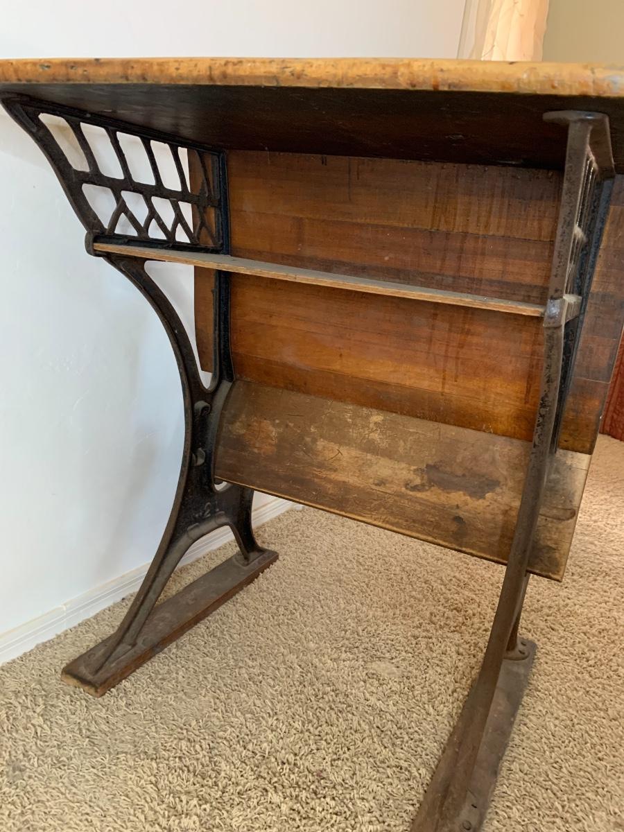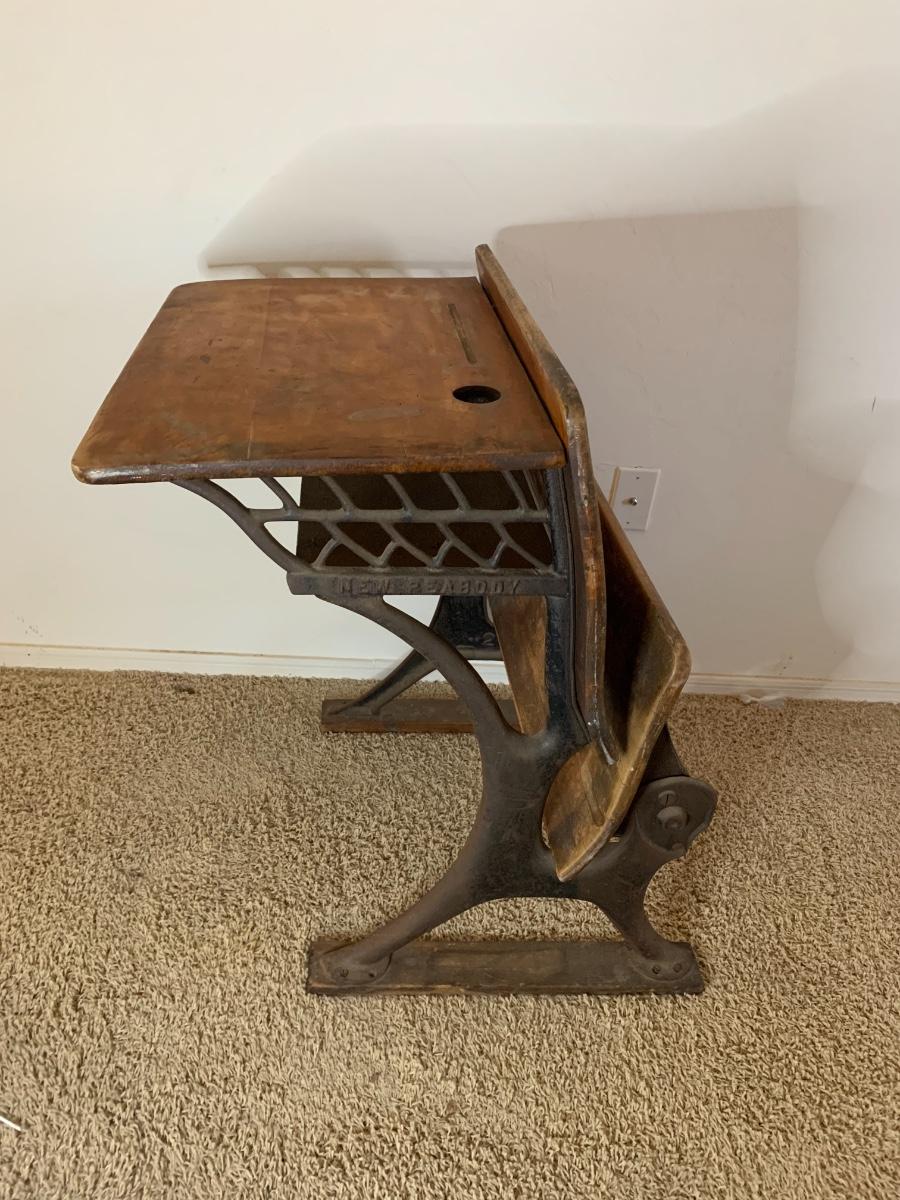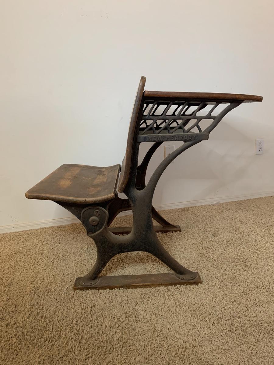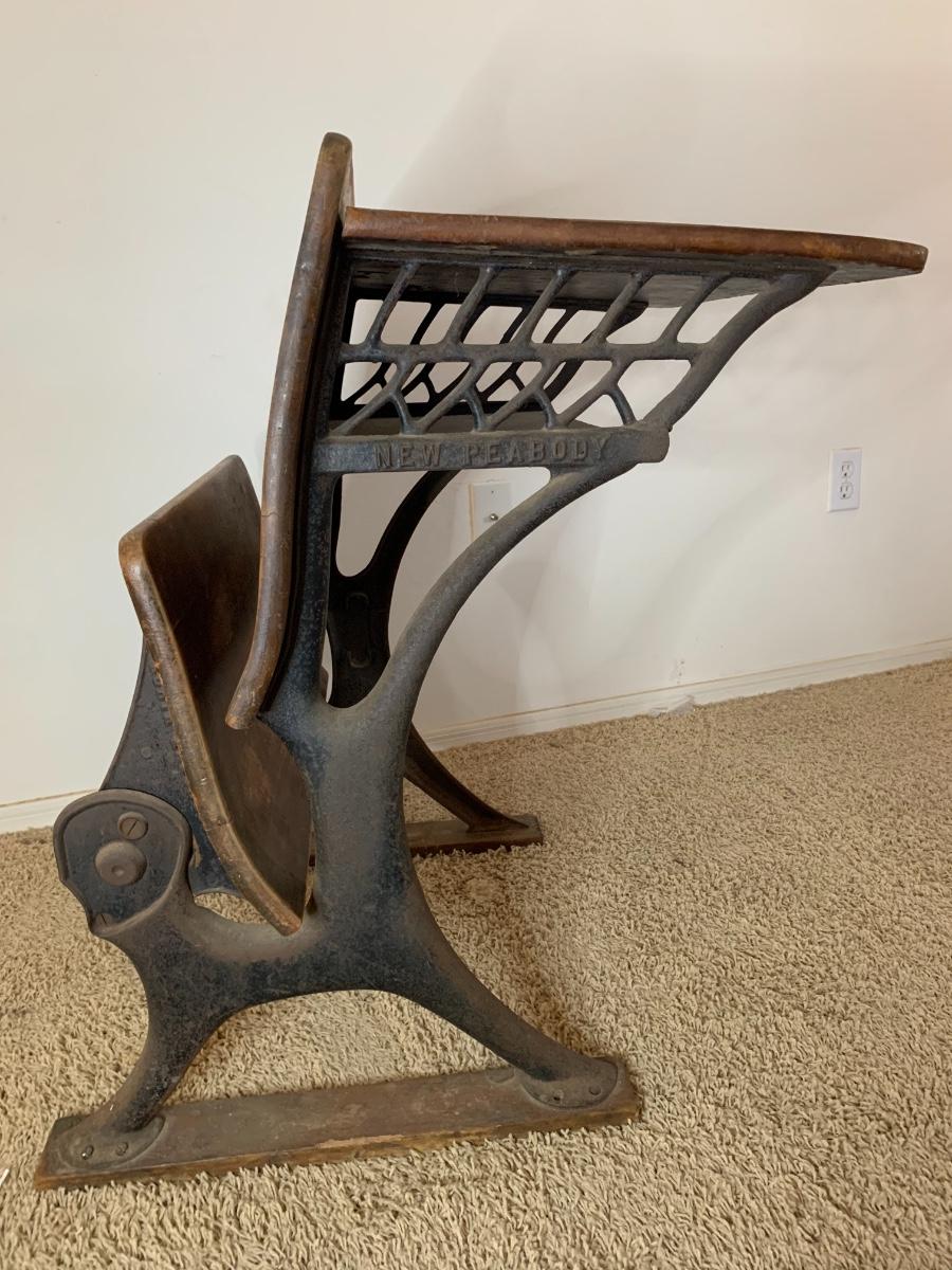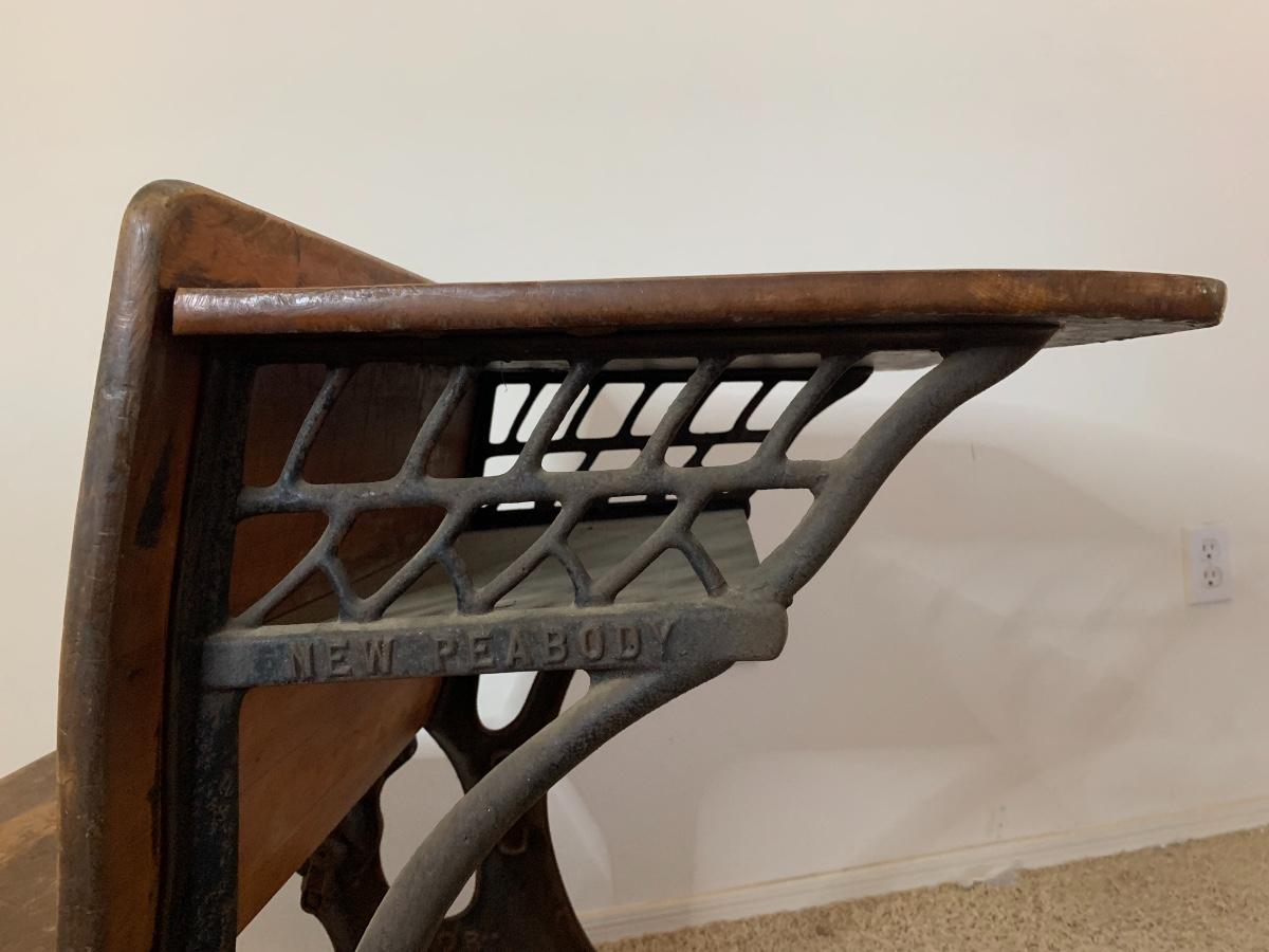 New Peabody antique school desk marked North Manchester Ind. Wood bench seat that folds up on iron base with desk and shelf behind. Great condition for its age!