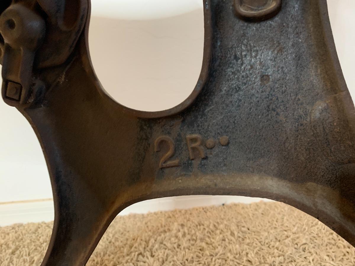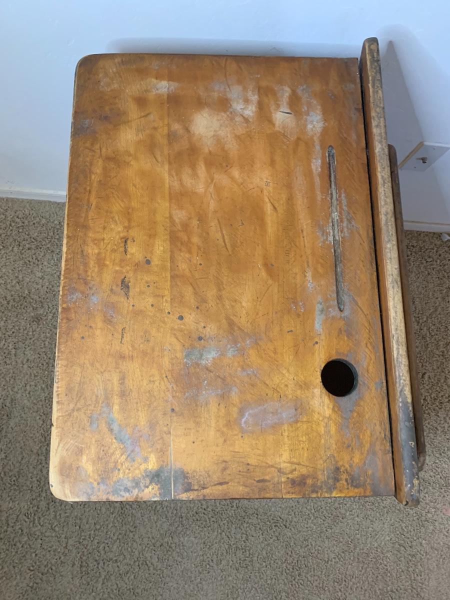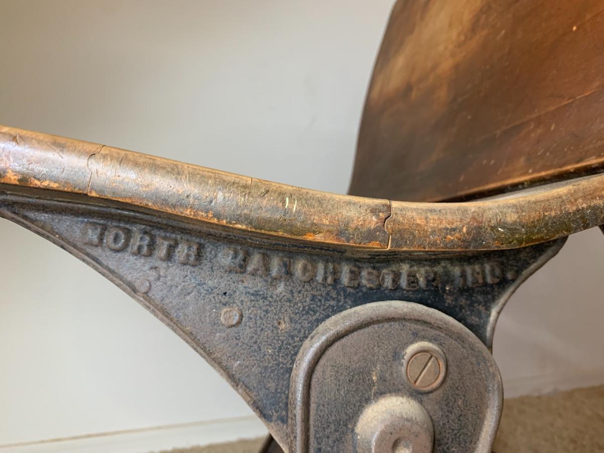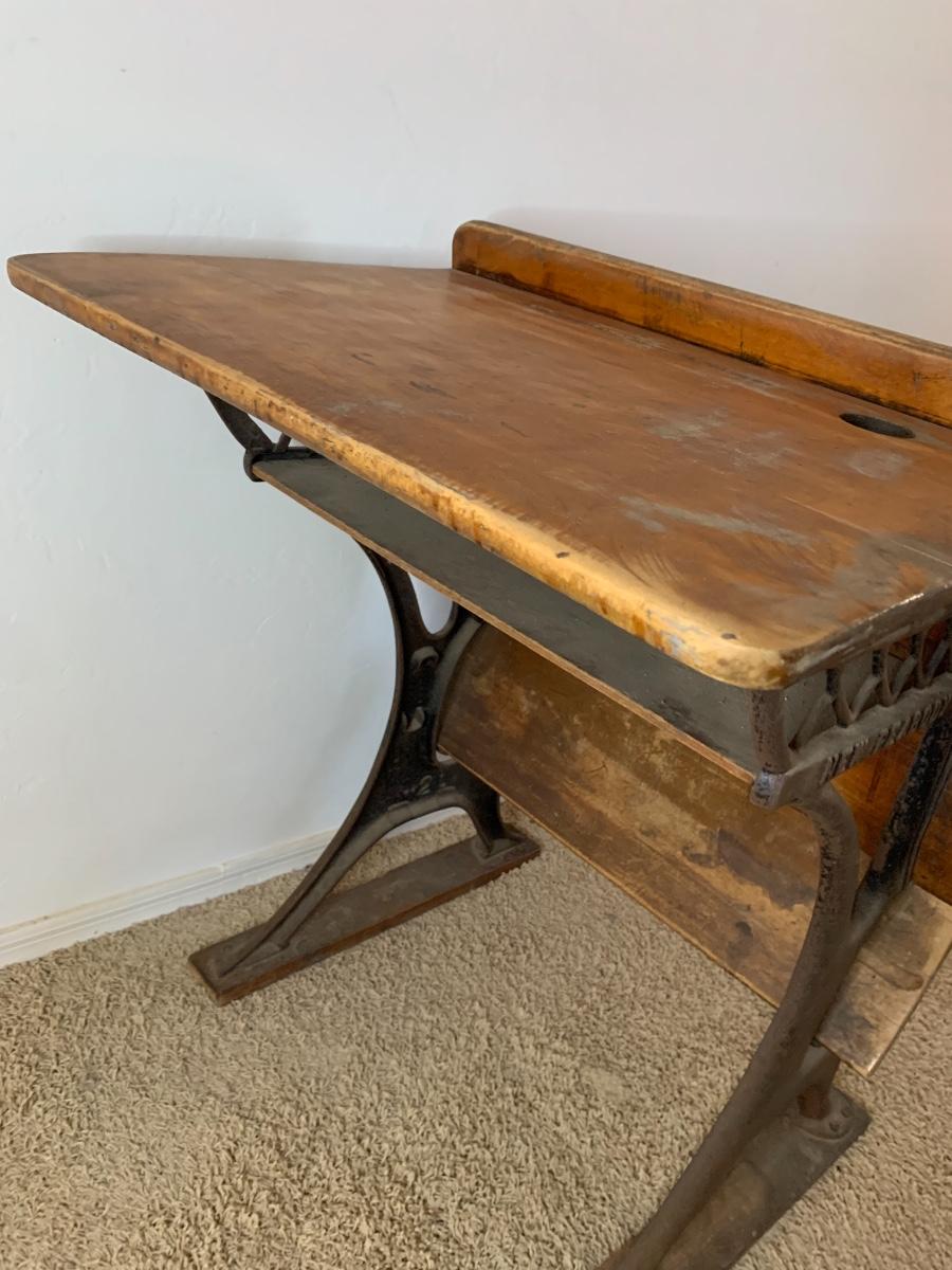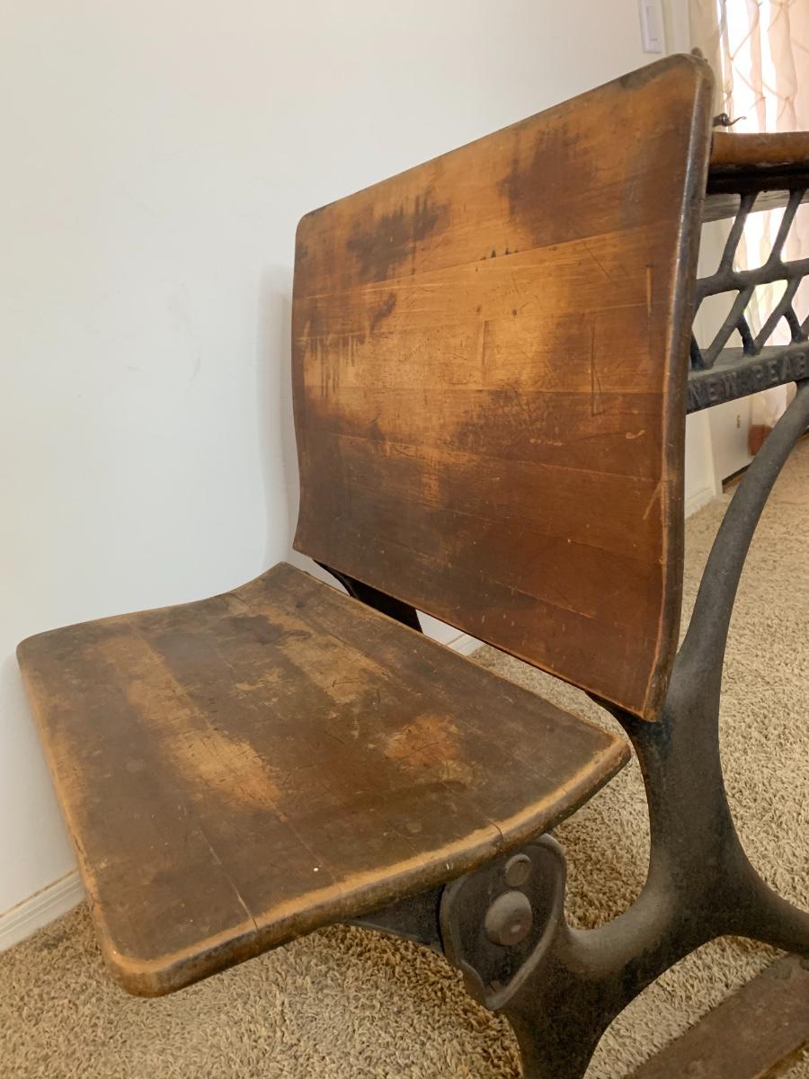 New Peabody antique school desk marked North Manchester Ind. Wood bench seat that folds up on iron base with desk and shelf behind. Great condition for its age!
